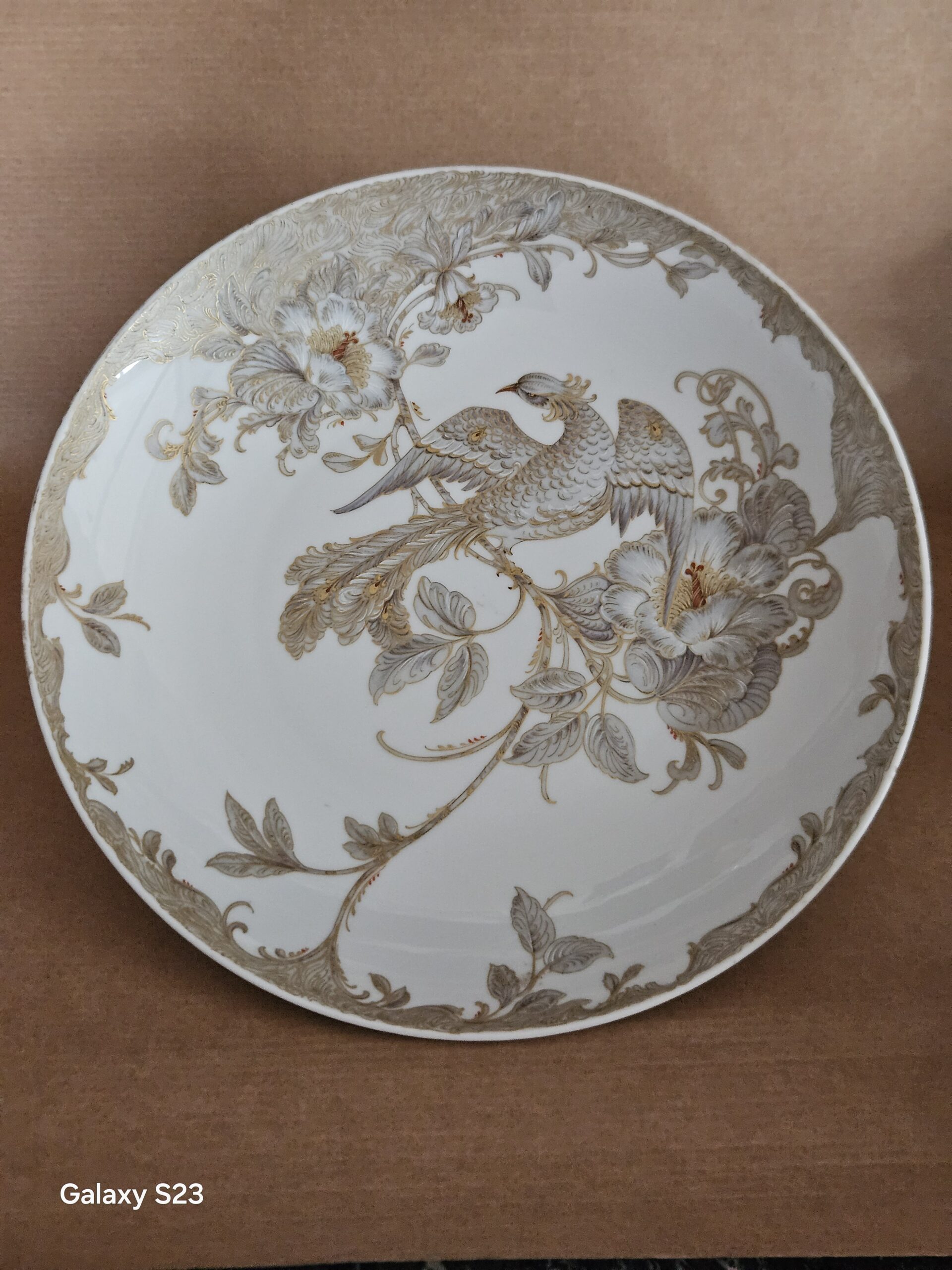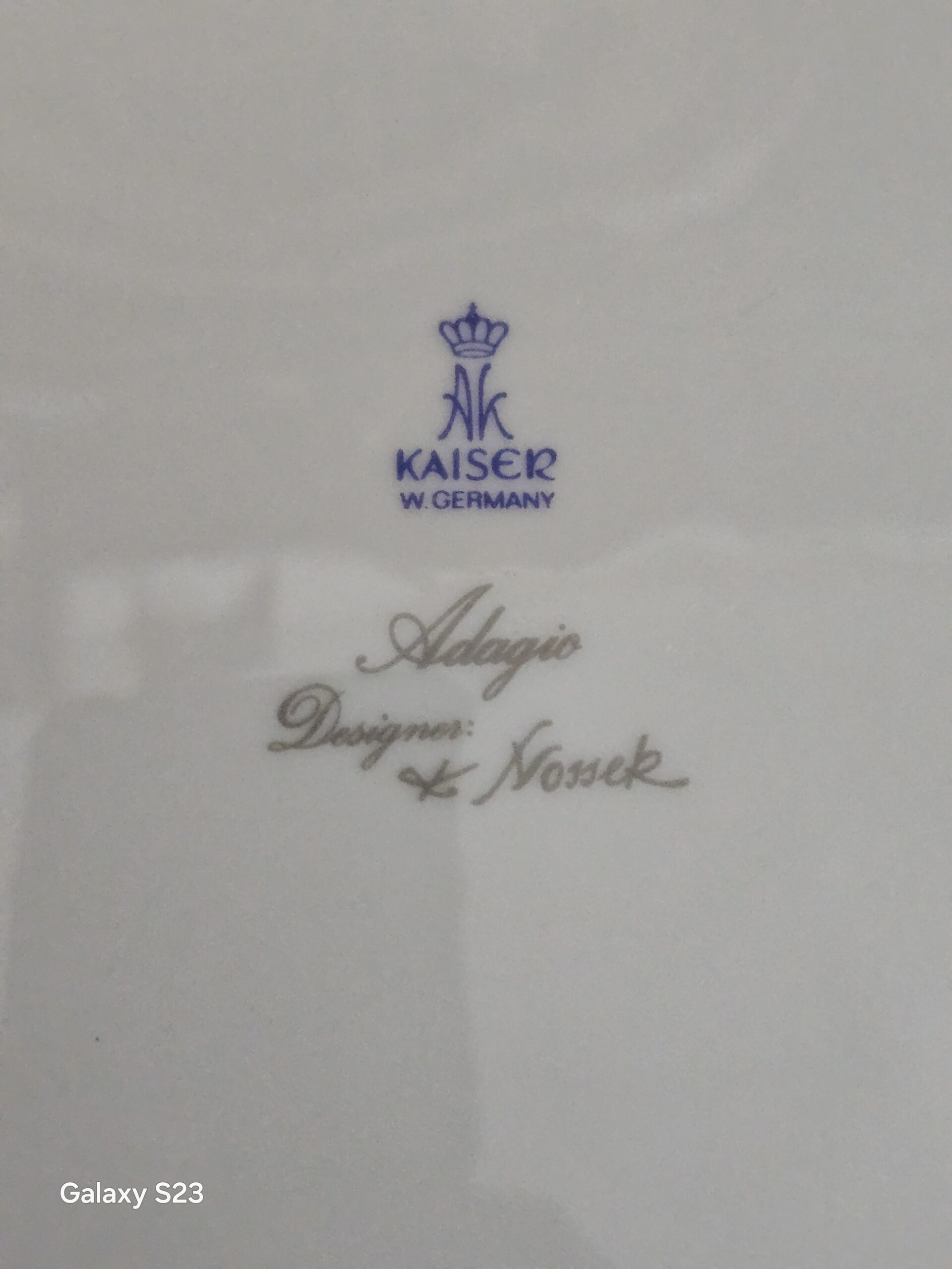 Niemiecka wytwórnia porcelany Kaiser, projekt K. Noosek, nazwa dekoru Adago. Sygnatura z okresu lat 1970-1990. Wymiar; średnica 30,5 cm, wysokość 4 cm. Stan bardzo dobry. Cena 70 złoty.