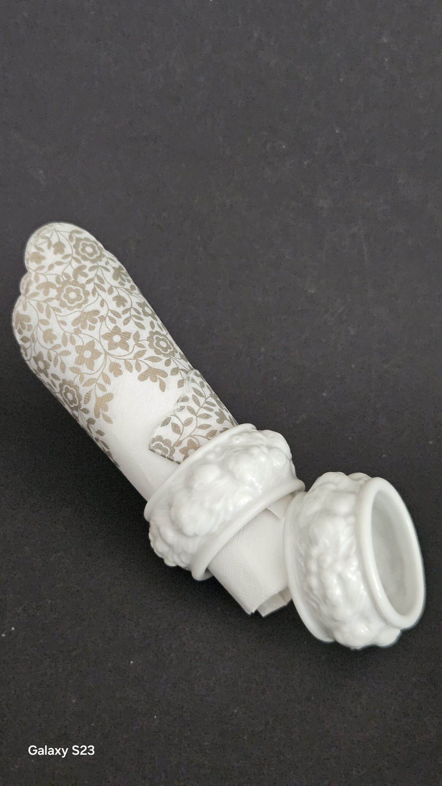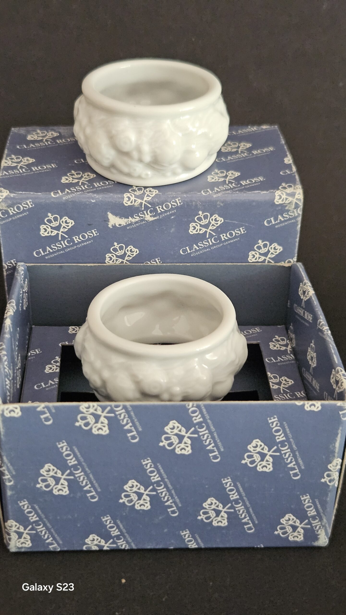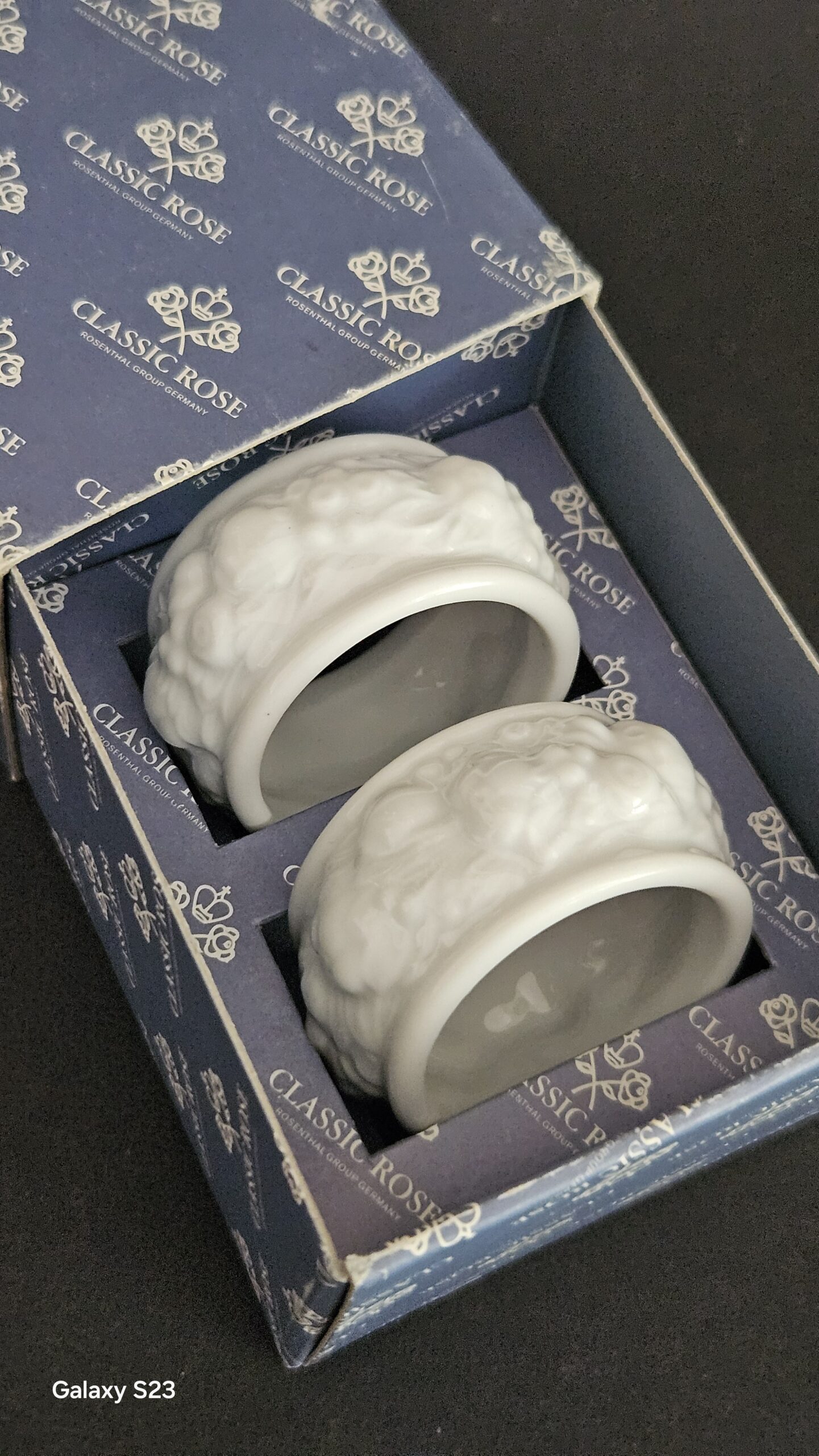 Dwa piękne porcelanowe serwetniki Niemieckiej wytwórni porcelany Rosenthal z serii Biała Maria. Kolor porcelanki biały, szkliwione, zdobiona reliefami. Oryginalne opakowanie (stan opakowania dobry), stan porcelanki bez zarzutów. Średnica zewnętrzna 5,5 cm, średnica wewnętrzna 3,7 cm, wysokość 2,7cm. Cena 150 złoty.