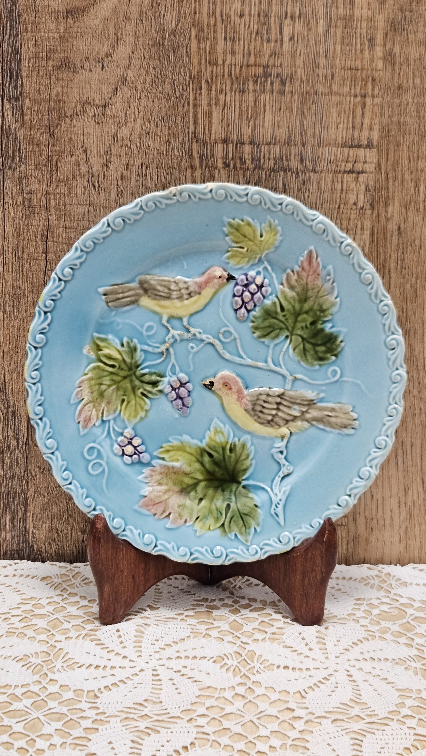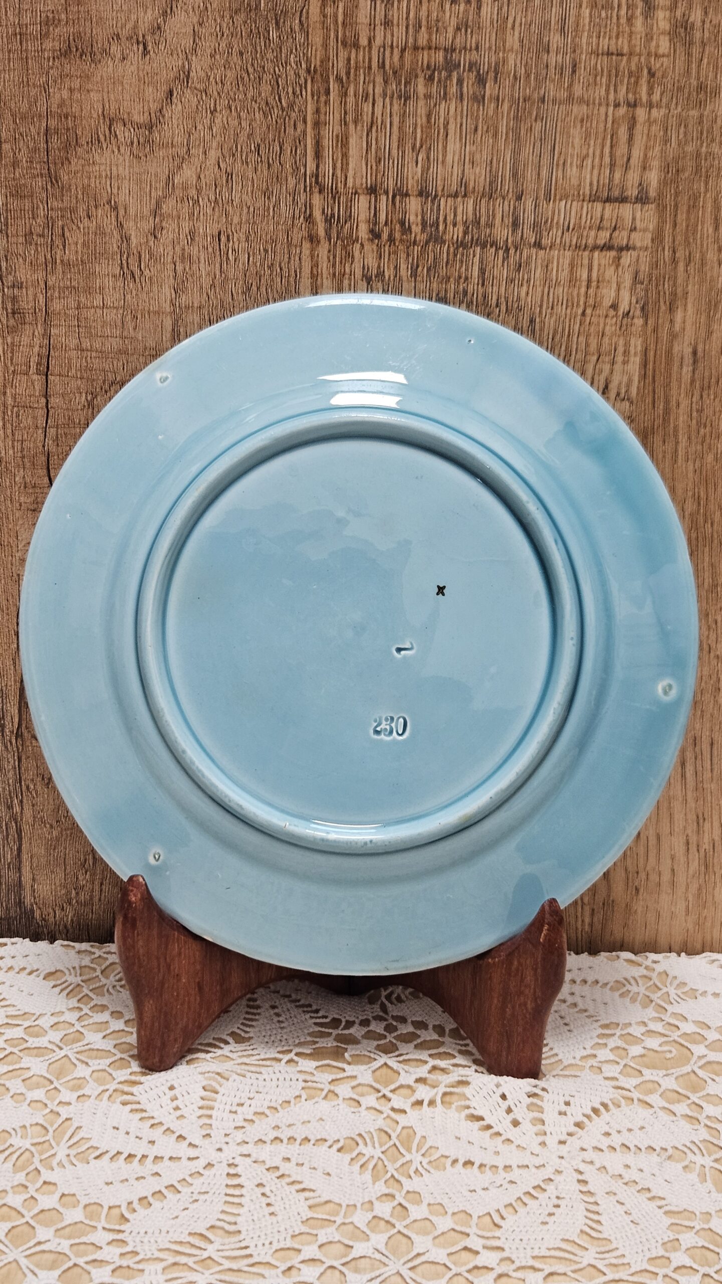 Dwa talerze ceramiczne niemieckiej wytwórni Zell z okresu lat 1910-1920. Talerze są zdobione reliefami, ręcznie malowane i szkliwione. Widoczne niewielkie przetarcia w szczególności na obrzeżu szkliwienie. Stan zachowania odpowiedni do wieku. Średnica 19,5 cm, wysokość 18 cm. Cena za jeden talerz 120 zł. Za dwa 200 zł.