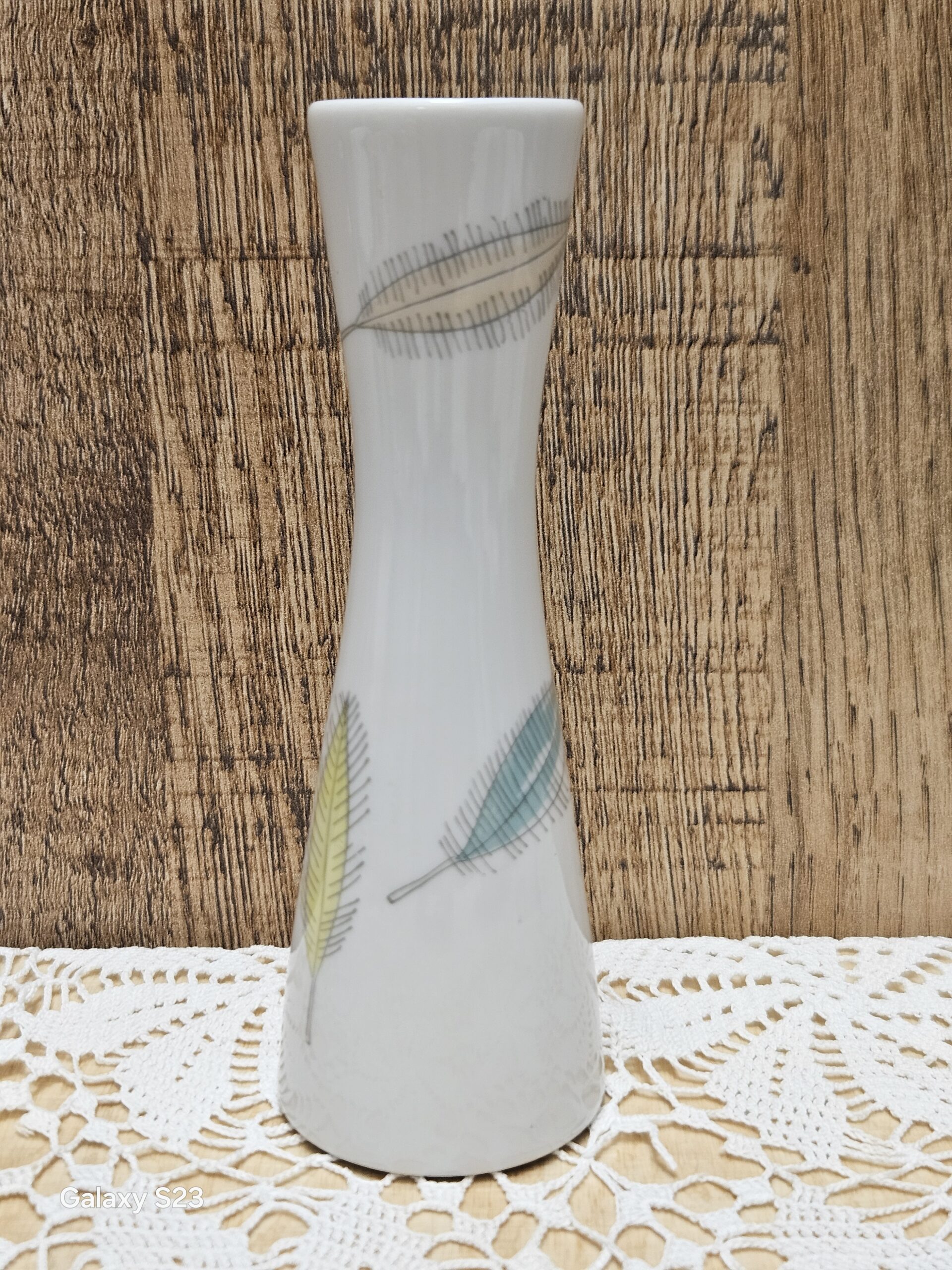 Porcelanowy wazonik wytwórni porcelany Rosenthal, model 2000 Bunter Bletter-kolorowe liście. Projekt Romuald Loewy, lata 1950-60. Delikatna biała porcelana. Wysoki 13 cm, średnica otworu 3 cm, średnica podstawy 4,5 cm. Cena 40 zł.