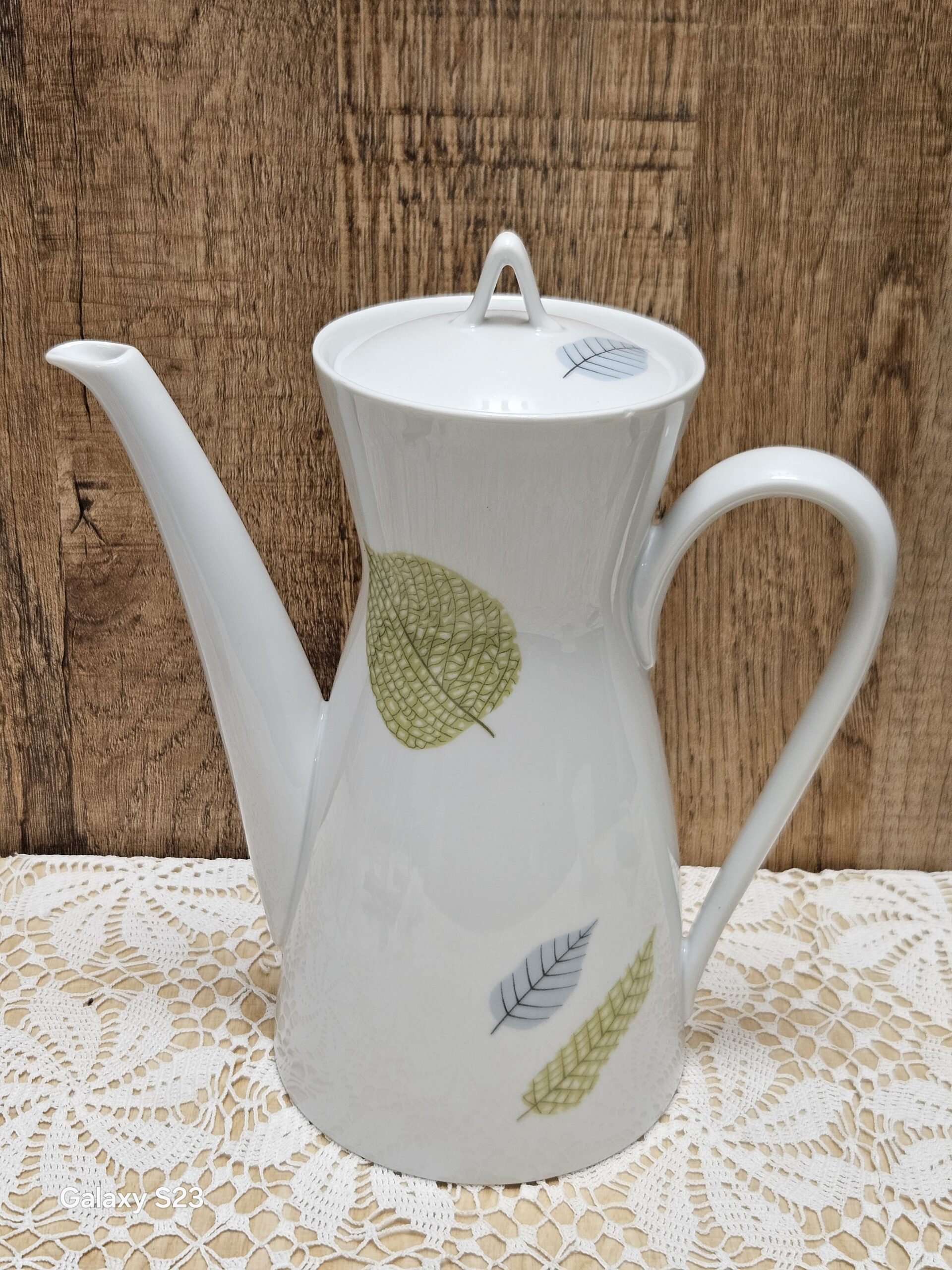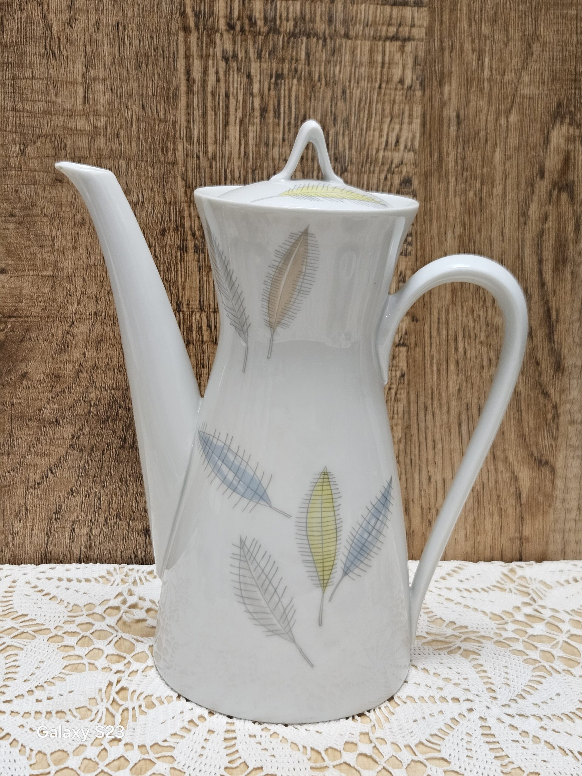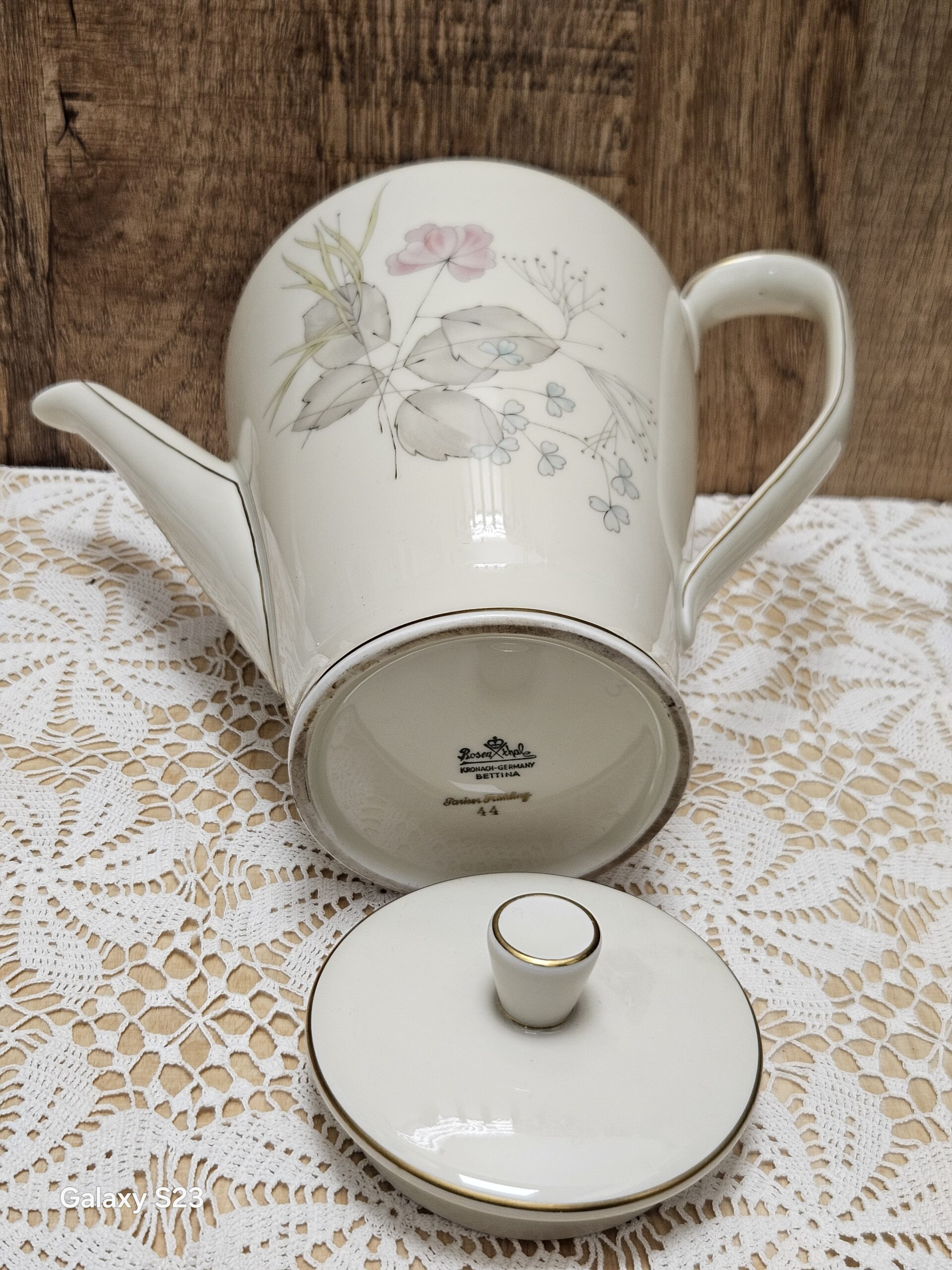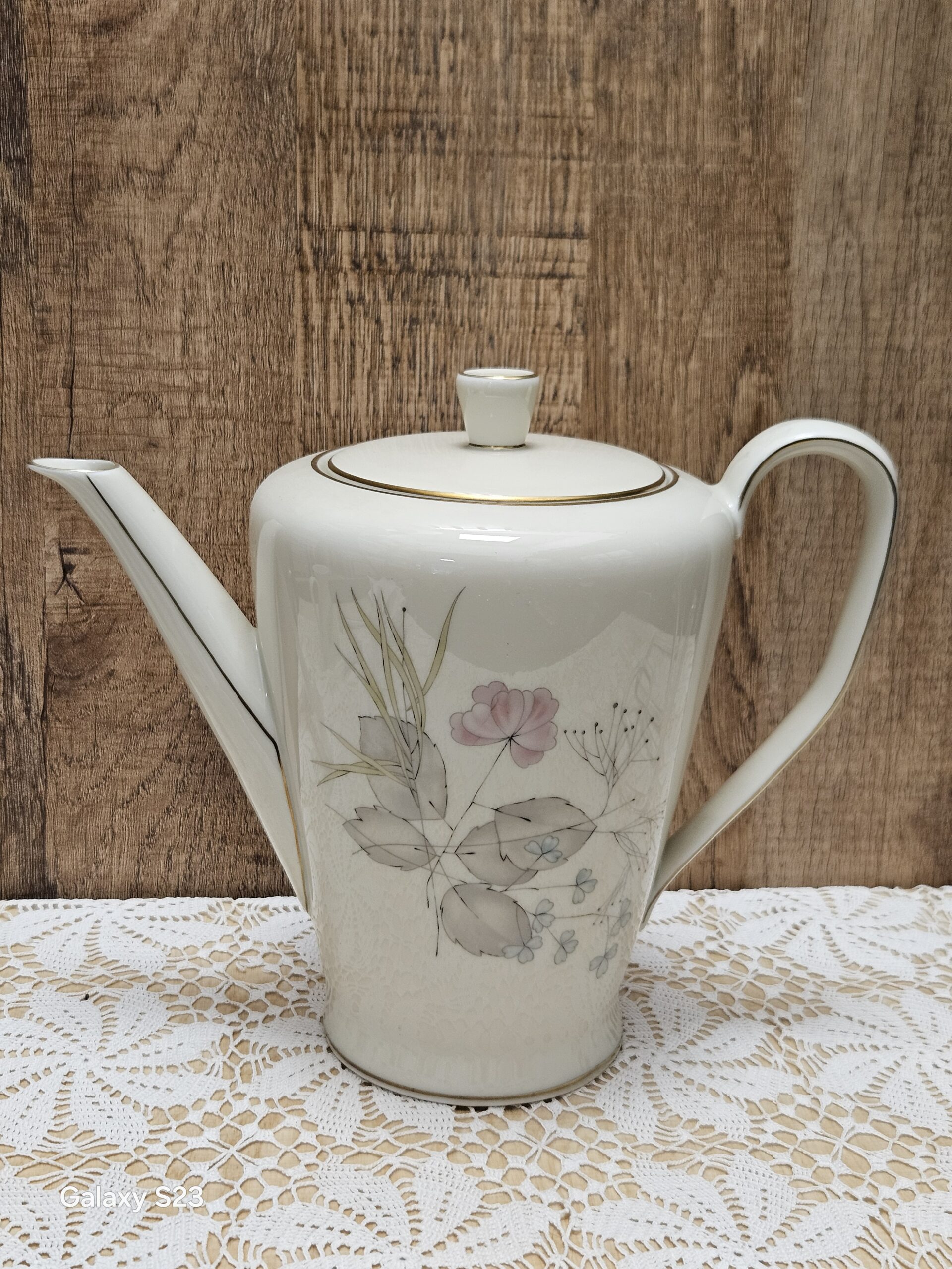 Porcelanowy dzbanek z wytwórni porcelany Rosenthal, model Bettina Pariser Fruling-paryska wiosna. Porcelana w kolorze ecri- kości słoniowej z motywem kwiatowym i złotymi zdobieniami. Wysokość z pokrywką 21 cm, średnica otworu 8,5 cm, średnica podstawy 9 cm, rozpiętość od dziubka do ucha 24,5 cm. Cena 120 zł.