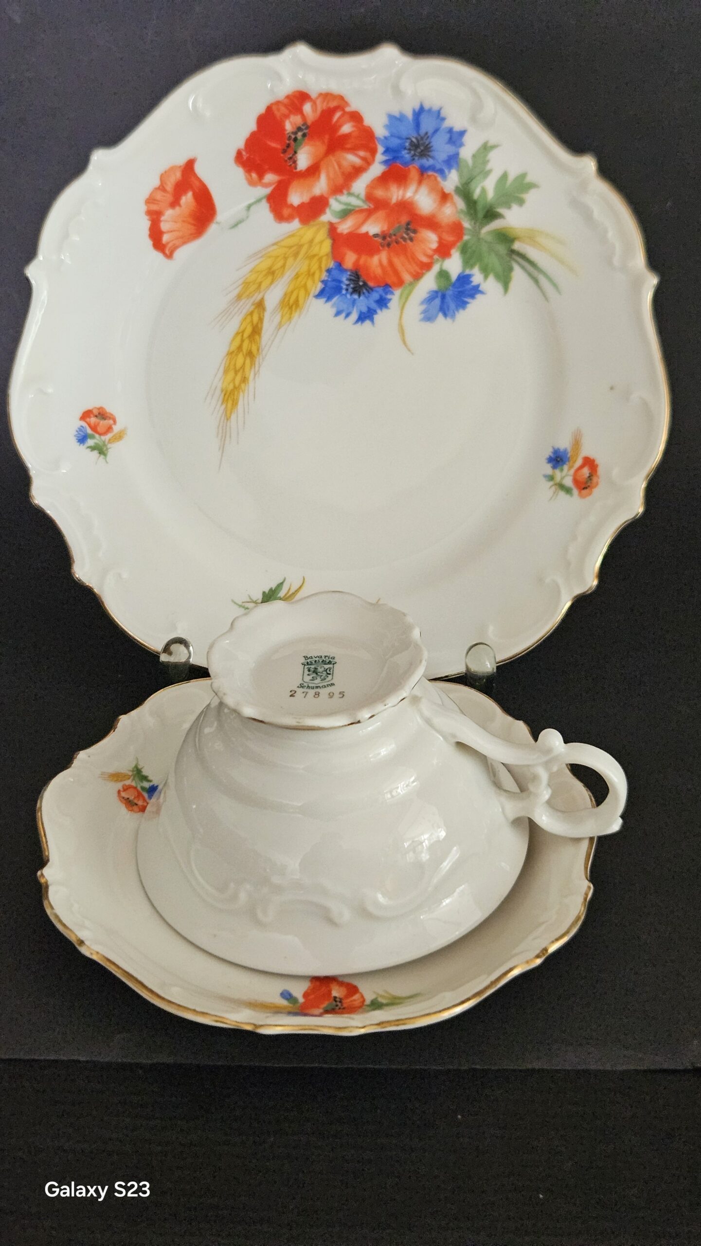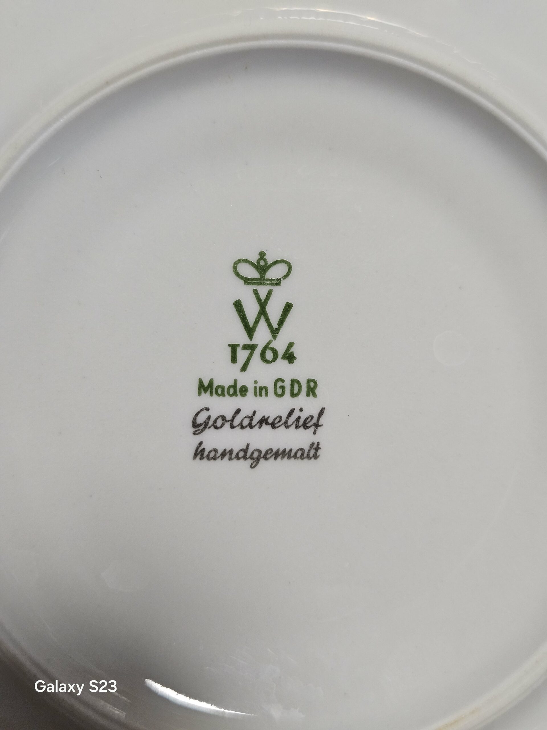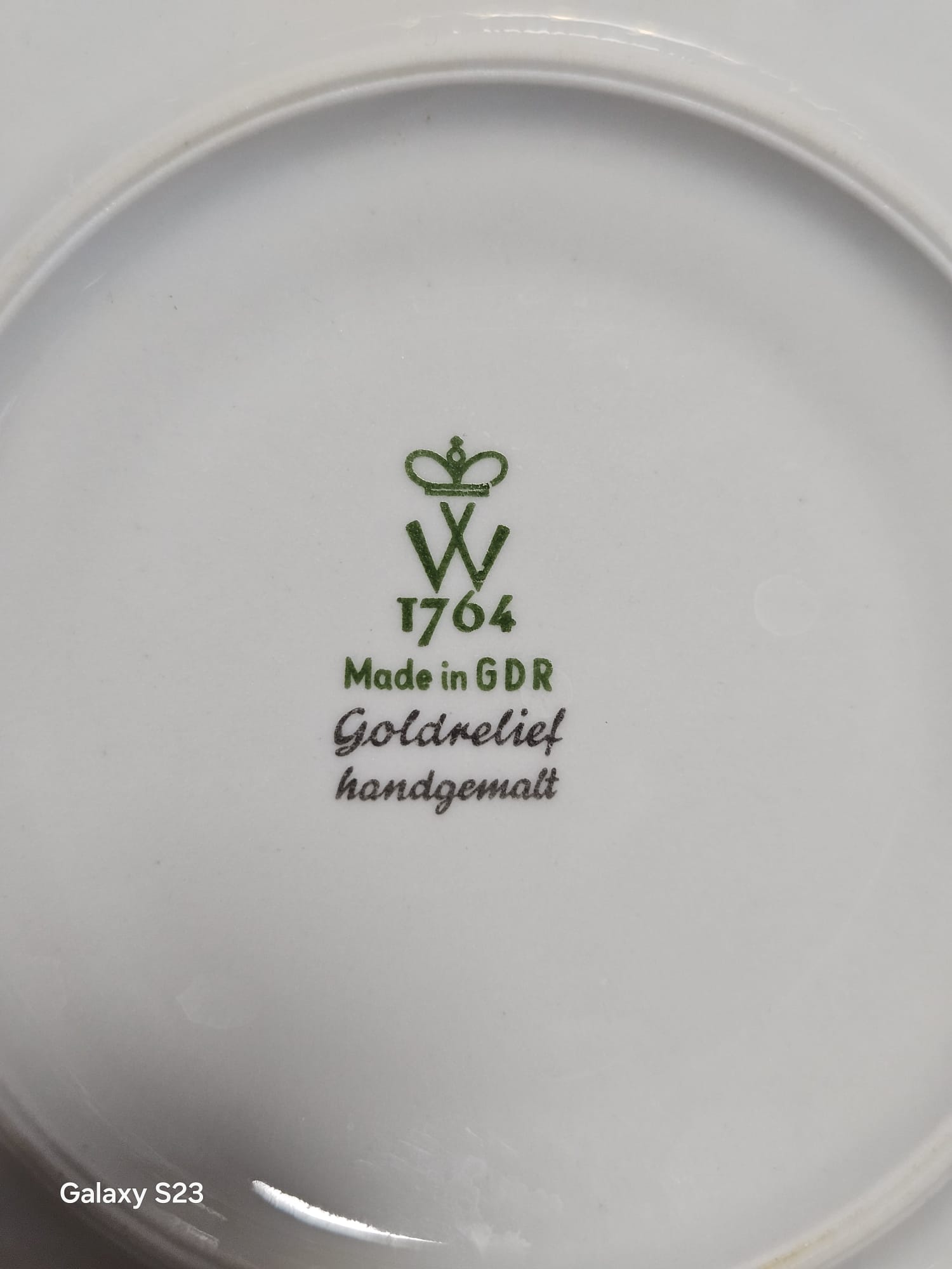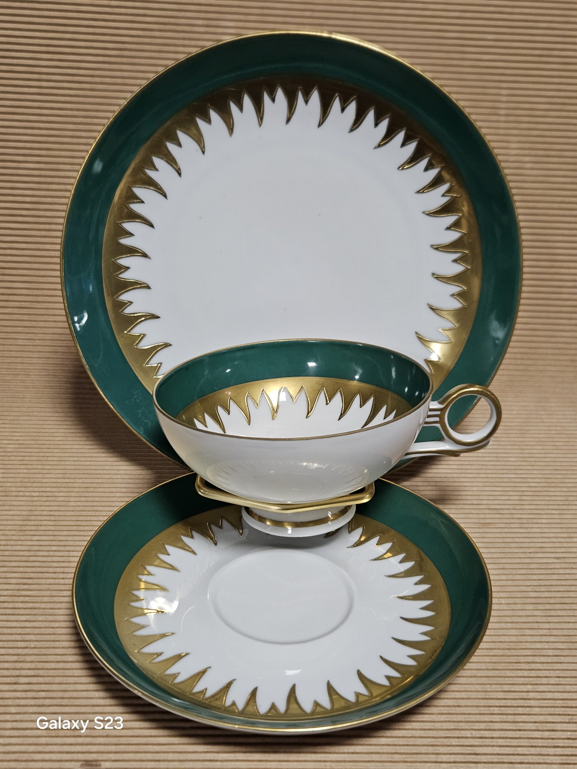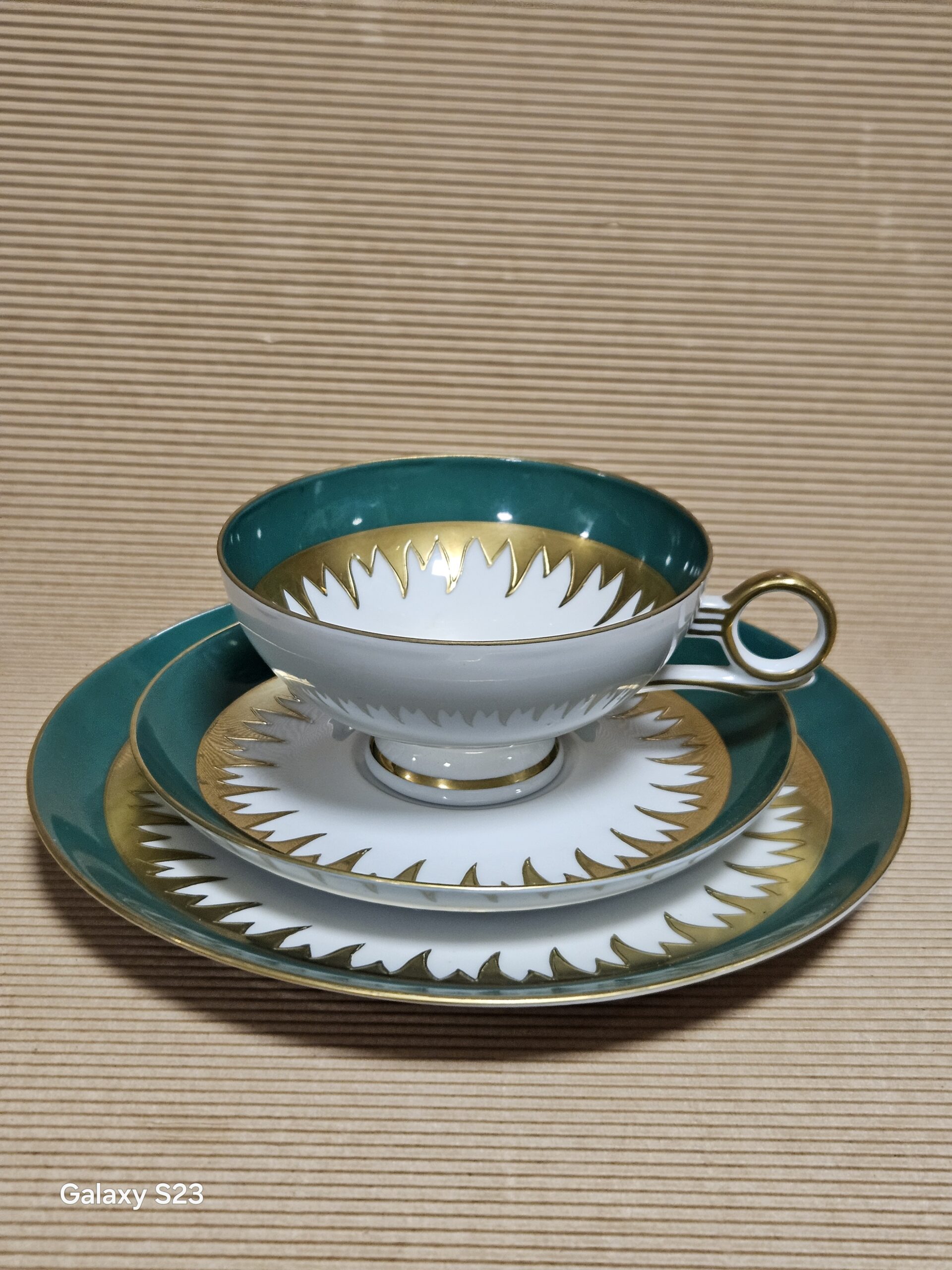 Elegancki zestaw znanej wytwórni porcelany Wallendorf z sygnaturką pochodzącą z 1963 roku za czasów DDR. Biała porcelanka z zielonym dekorem i ręcznie dekorowana złotym reliefem. Stan zachowania bardzo dobry, niewielkie ślady upływającego czasu. Zestaw składa się z filiżanki o średnicy 10,5 cm, średnica stopki 4,5 cm, wysokość 5,5 cm. Spodek o średnicy 15 cm, wysokość 2 cm, talerzyk śniadaniowy o średnicy 19,5 cm, wysokości 2,5 cm. Cena 80 złotych.