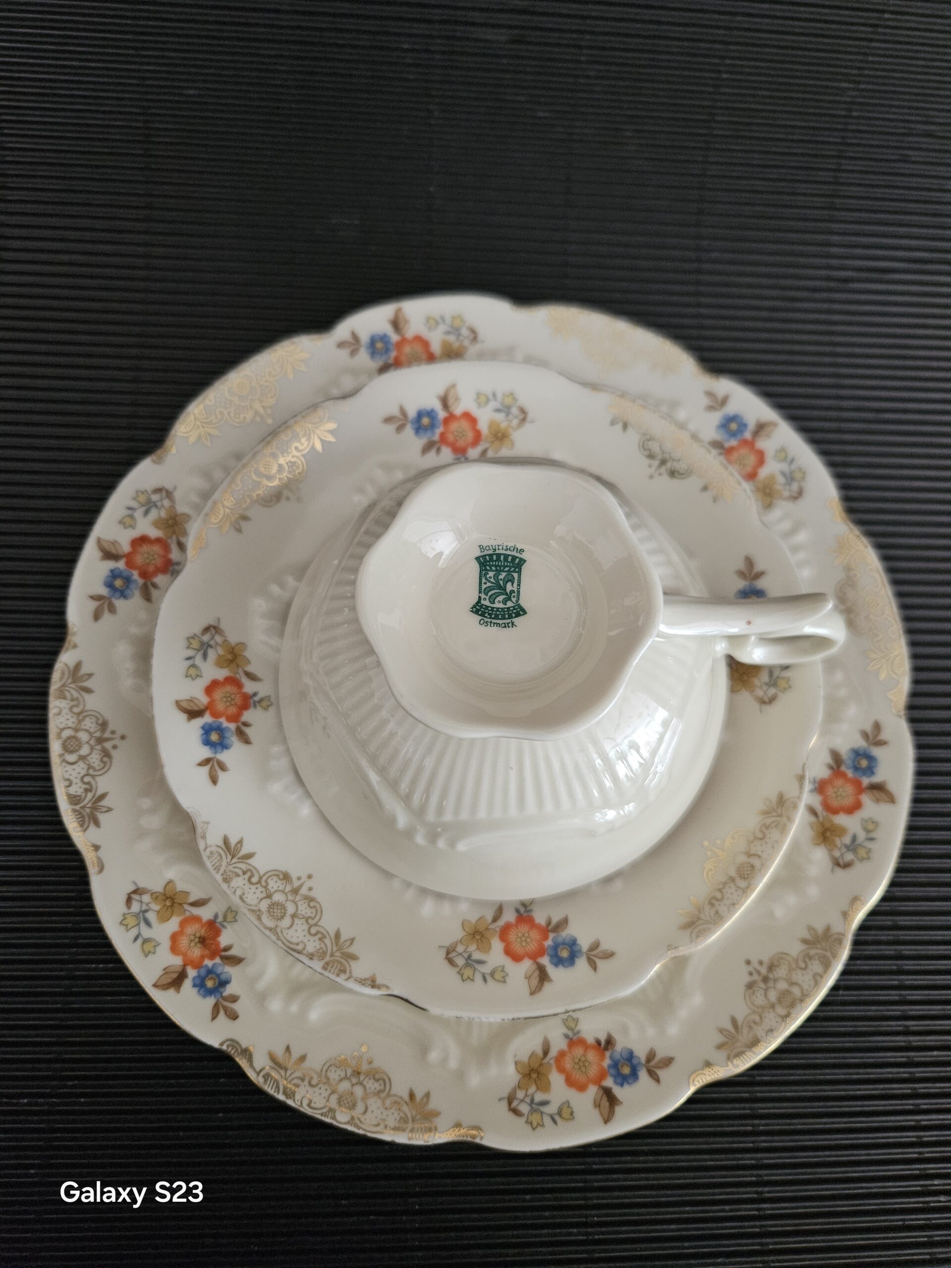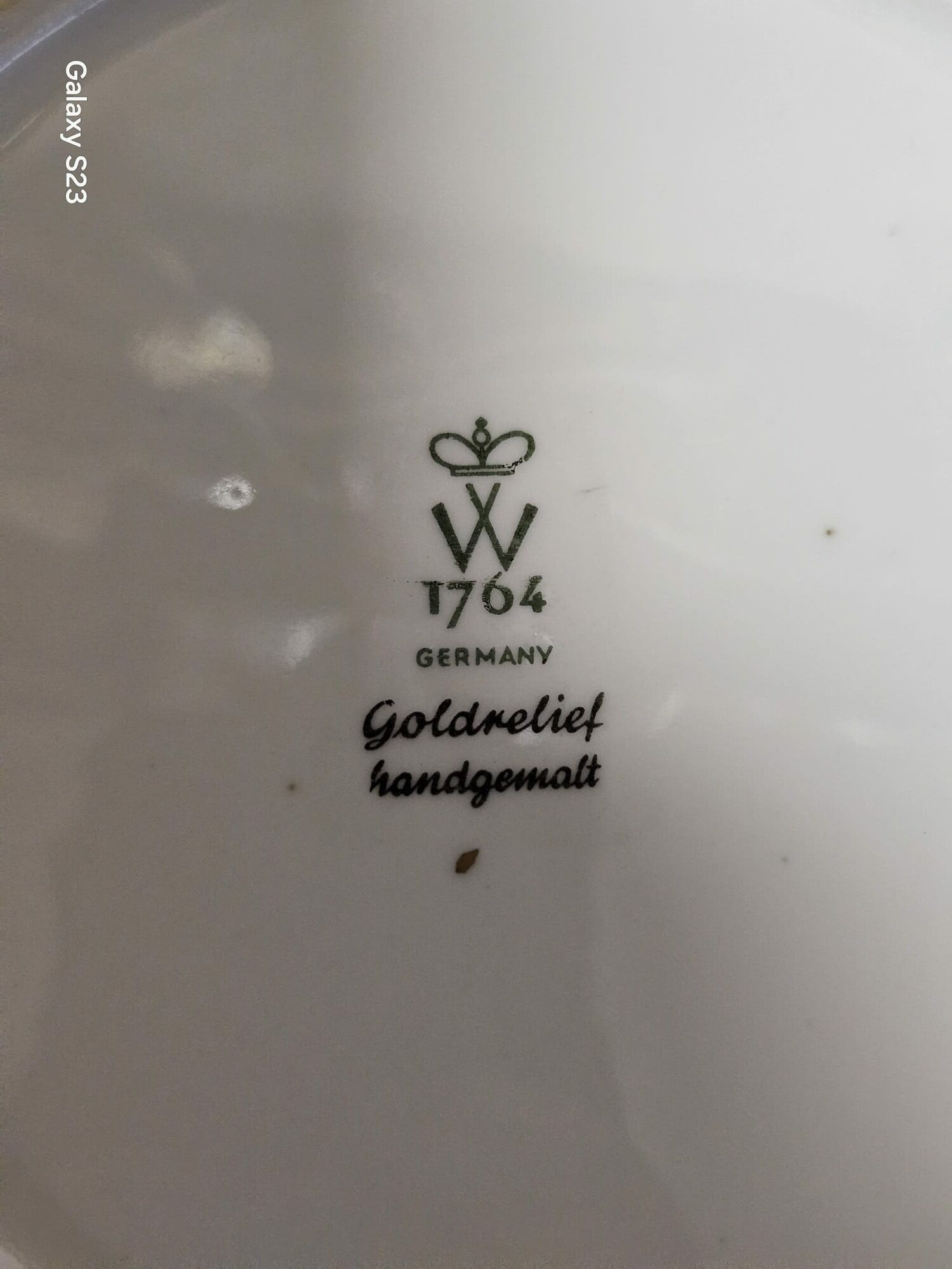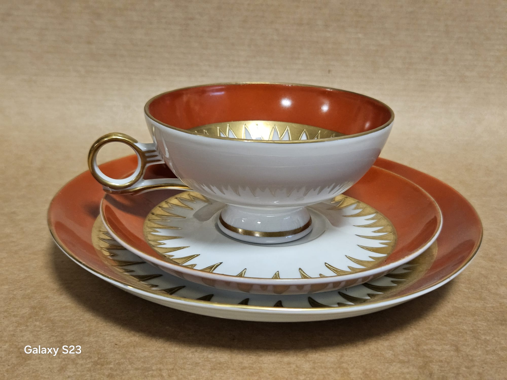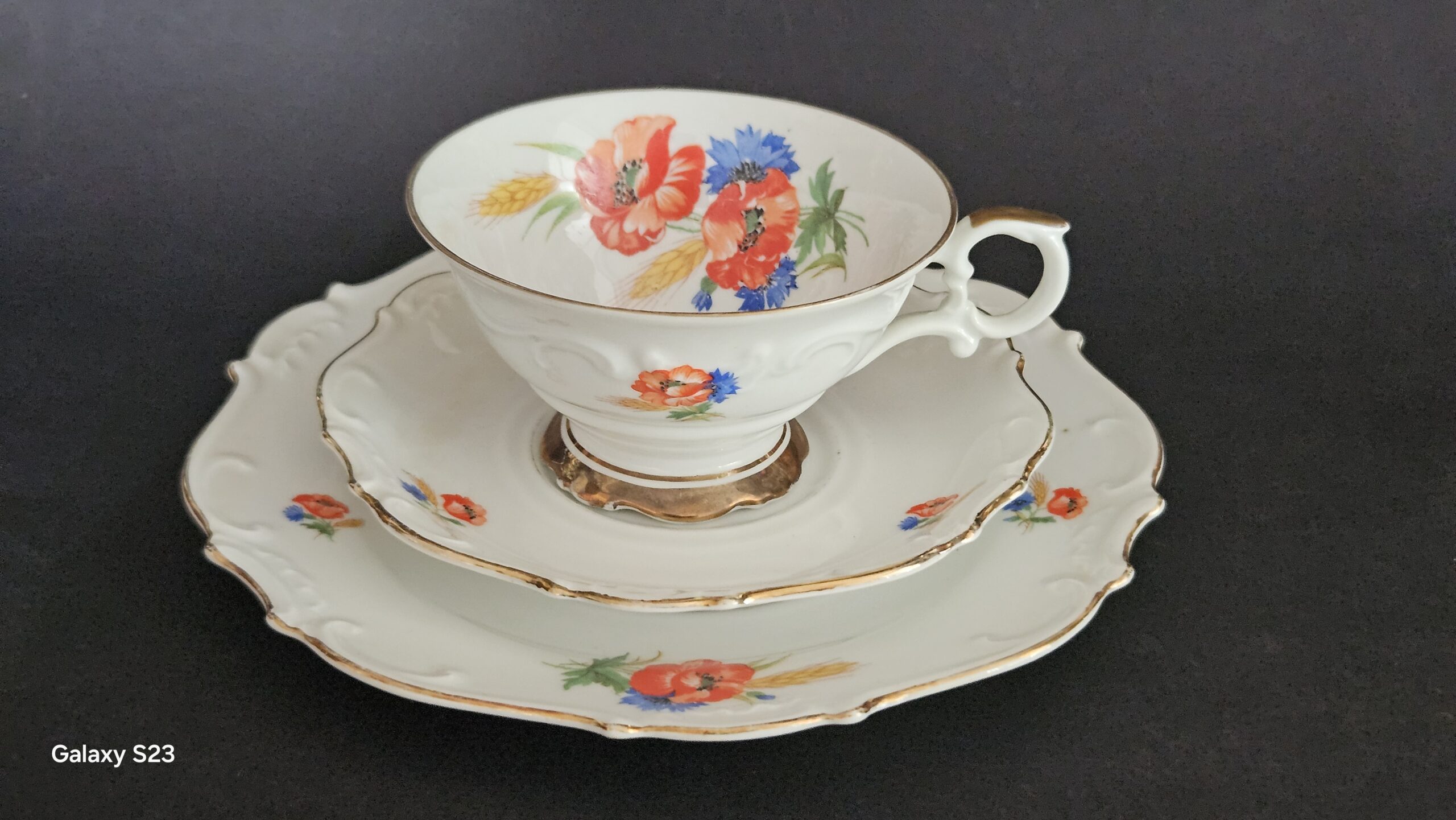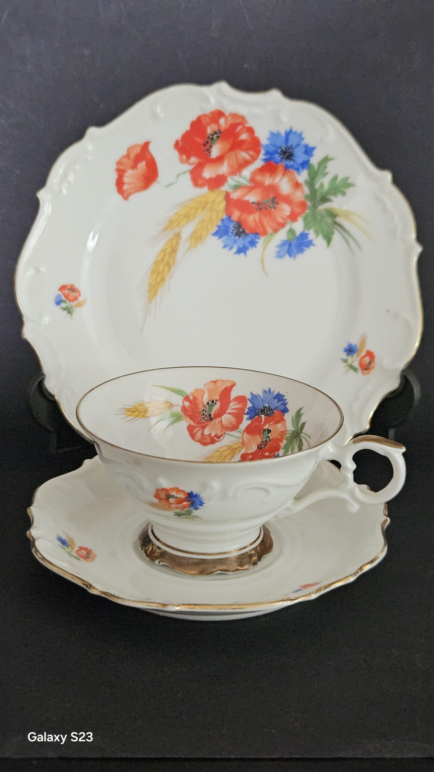Elegancki zestaw znanej wytwórni porcelany Wallendorf z sygnaturką pochodzącą z 1963 roku za czasów DDR. Biała porcelanka z zielonym dekorem i ręcznie dekorowana złotym reliefem. Stan zachowania bardzo dobry, niewielkie ślady upływającego czasu. Zestaw składa się z filiżanki o średnicy 10,5 cm, średnica stopki 4,5 cm, wysokość 5,5 cm. Spodek o średnicy 15 cm, wysokość 2 cm, talerzyk śniadaniowy o średnicy 19,5 cm, wysokości 2,5 cm. Cena 80 złotych.