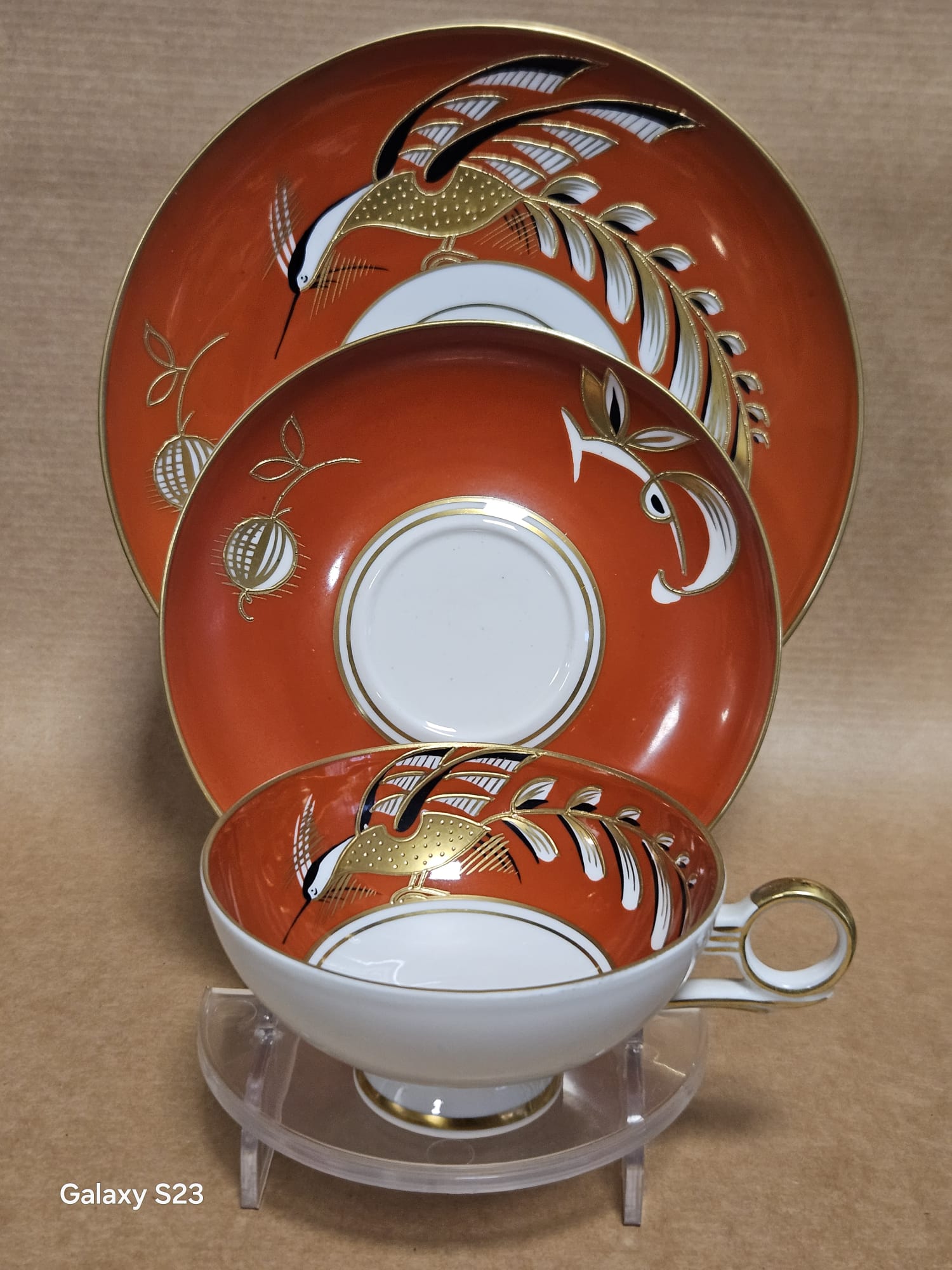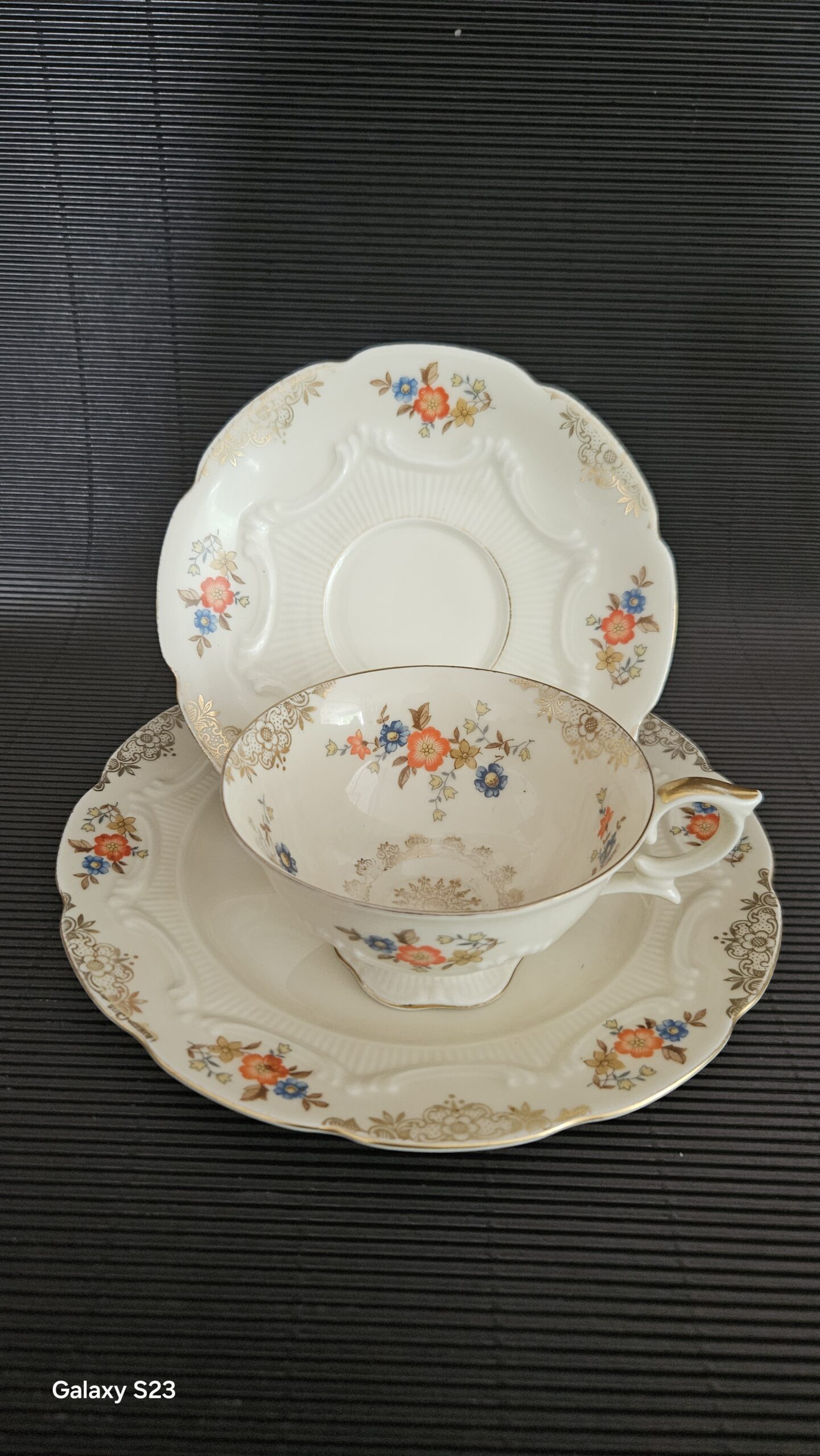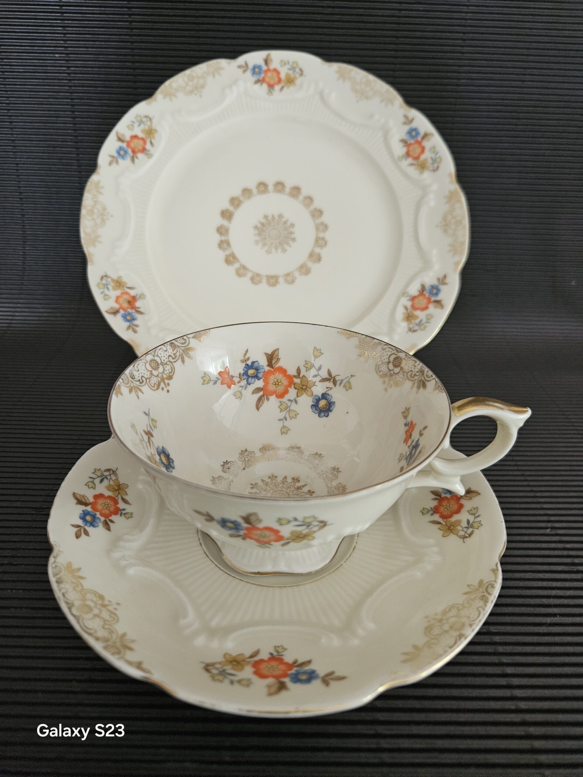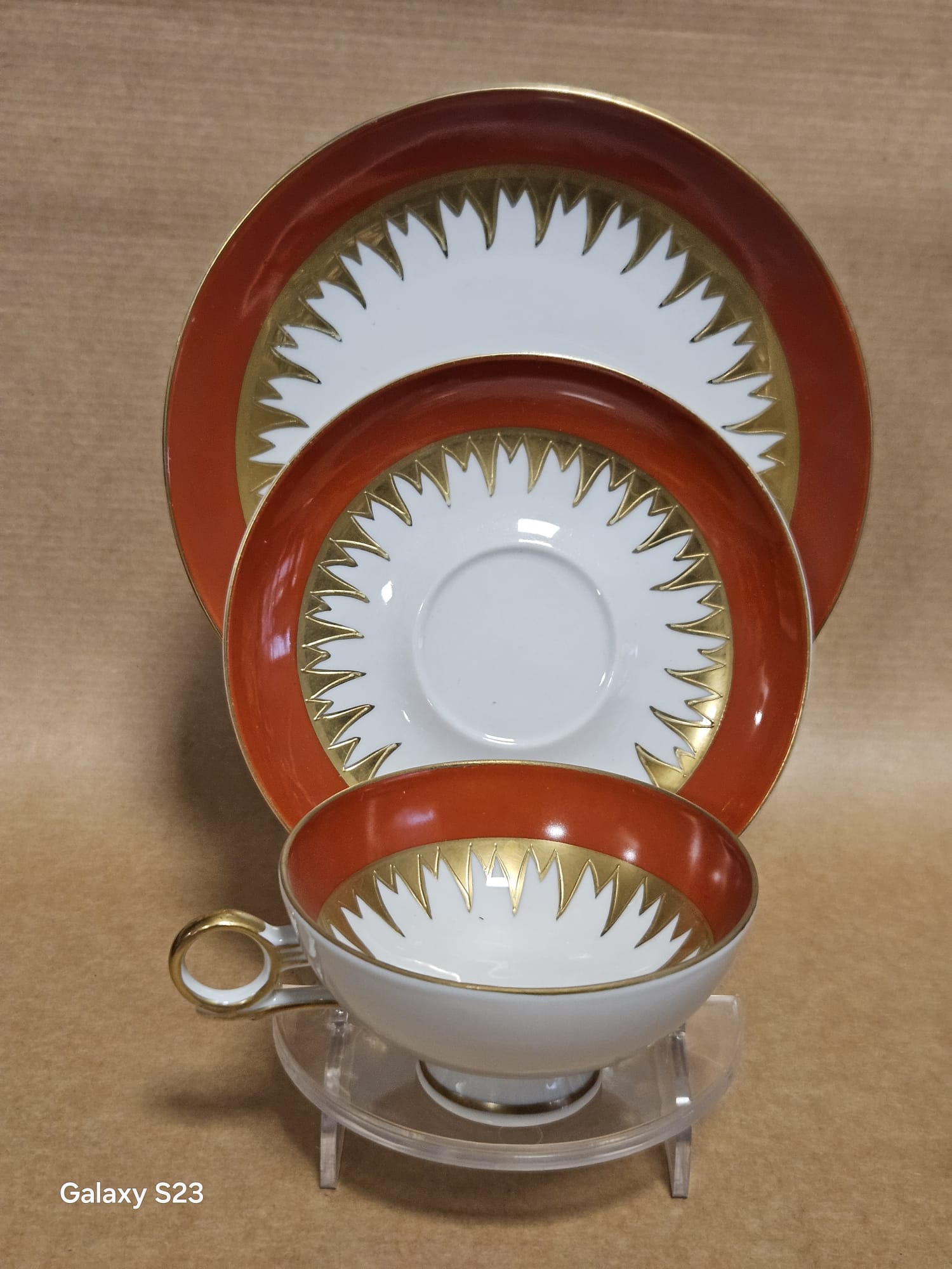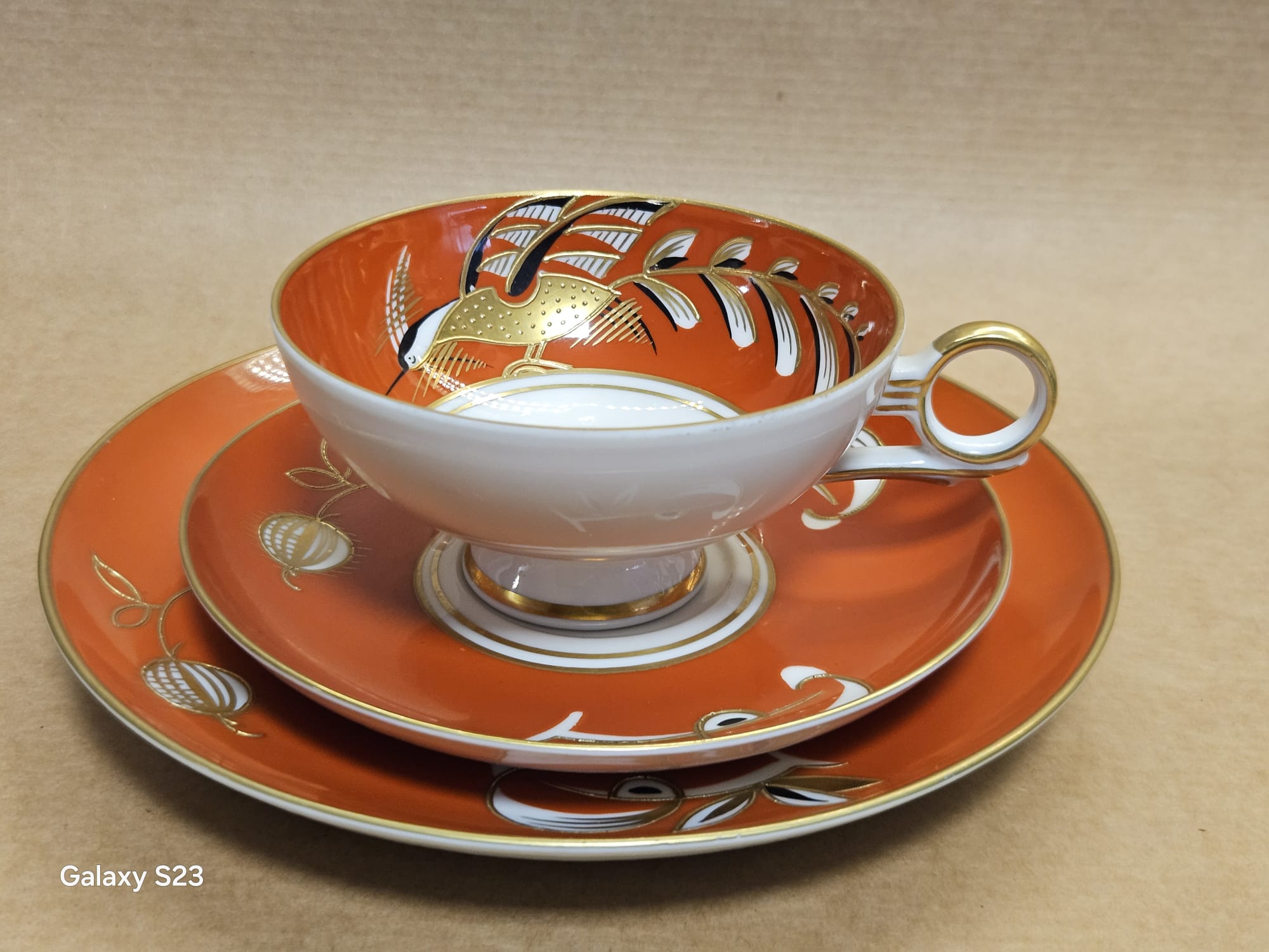 Elegancki zestaw znanej wytwórni porcelany Wallendorf z sygnaturką pochodzącą z 1963 roku za czasów DDR. Biała porcelanka z zielonym dekorem i ręcznie dekorowana złotym reliefem. Stan zachowania bardzo dobry, niewielkie ślady upływającego czasu. Zestaw składa się z filiżanki o średnicy 10,5 cm, średnica stopki 4,5 cm, wysokość 5,5 cm. Spodek o średnicy 15 cm, wysokość 2 cm, talerzyk śniadaniowy o średnicy 19,5 cm, wysokości 2,5 cm. Cena 80 złotych.