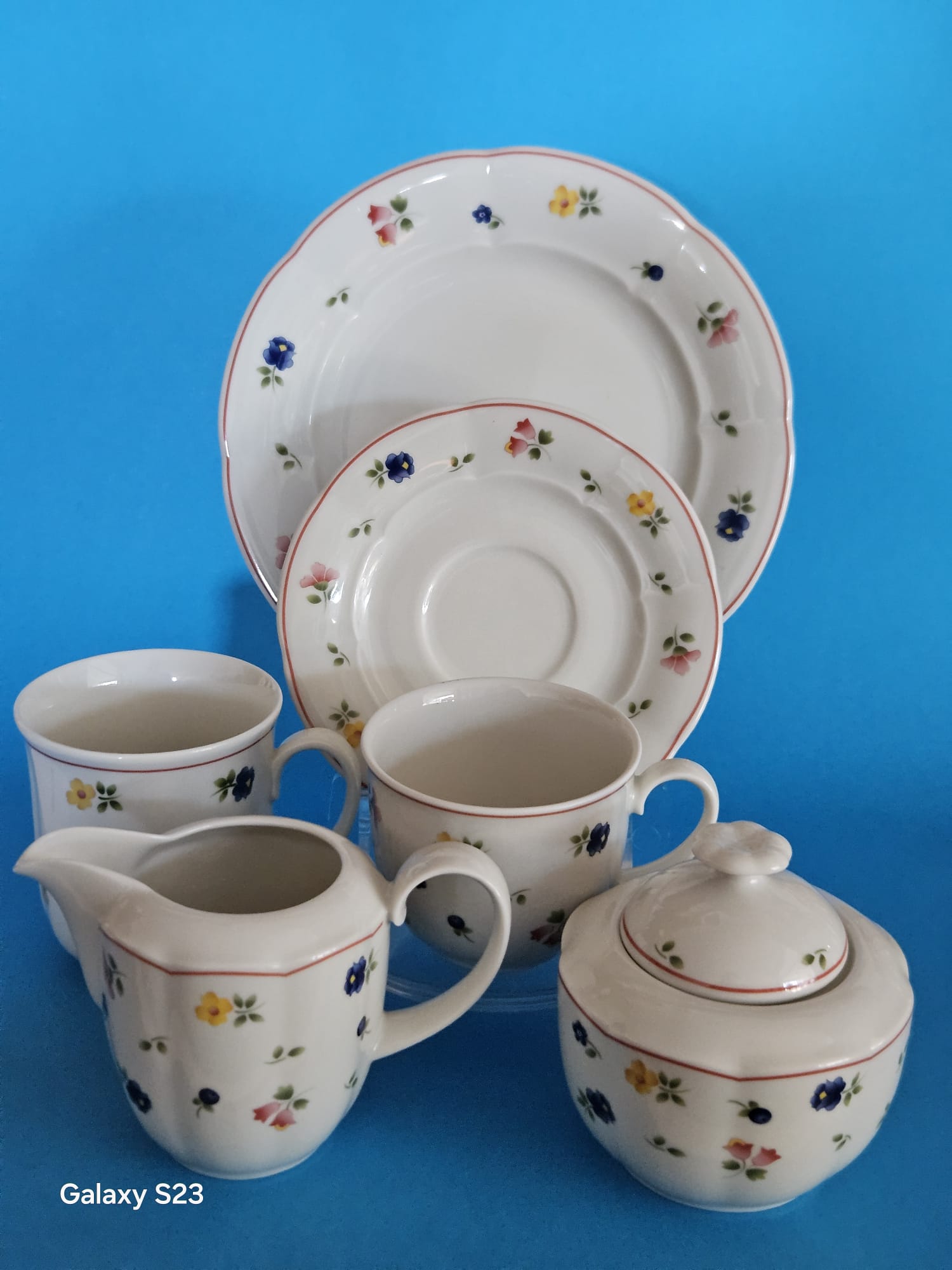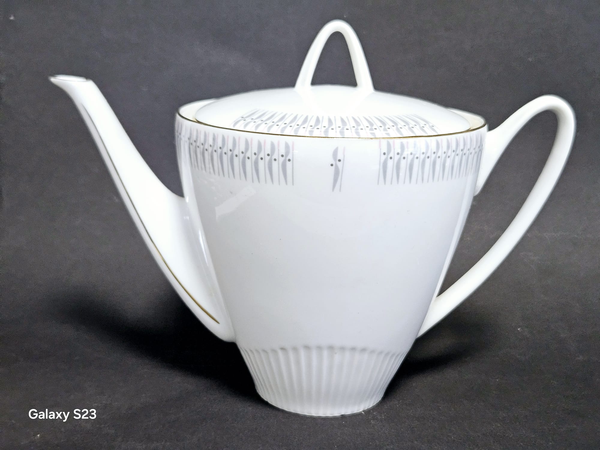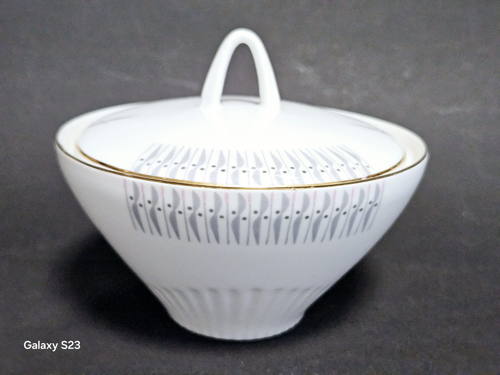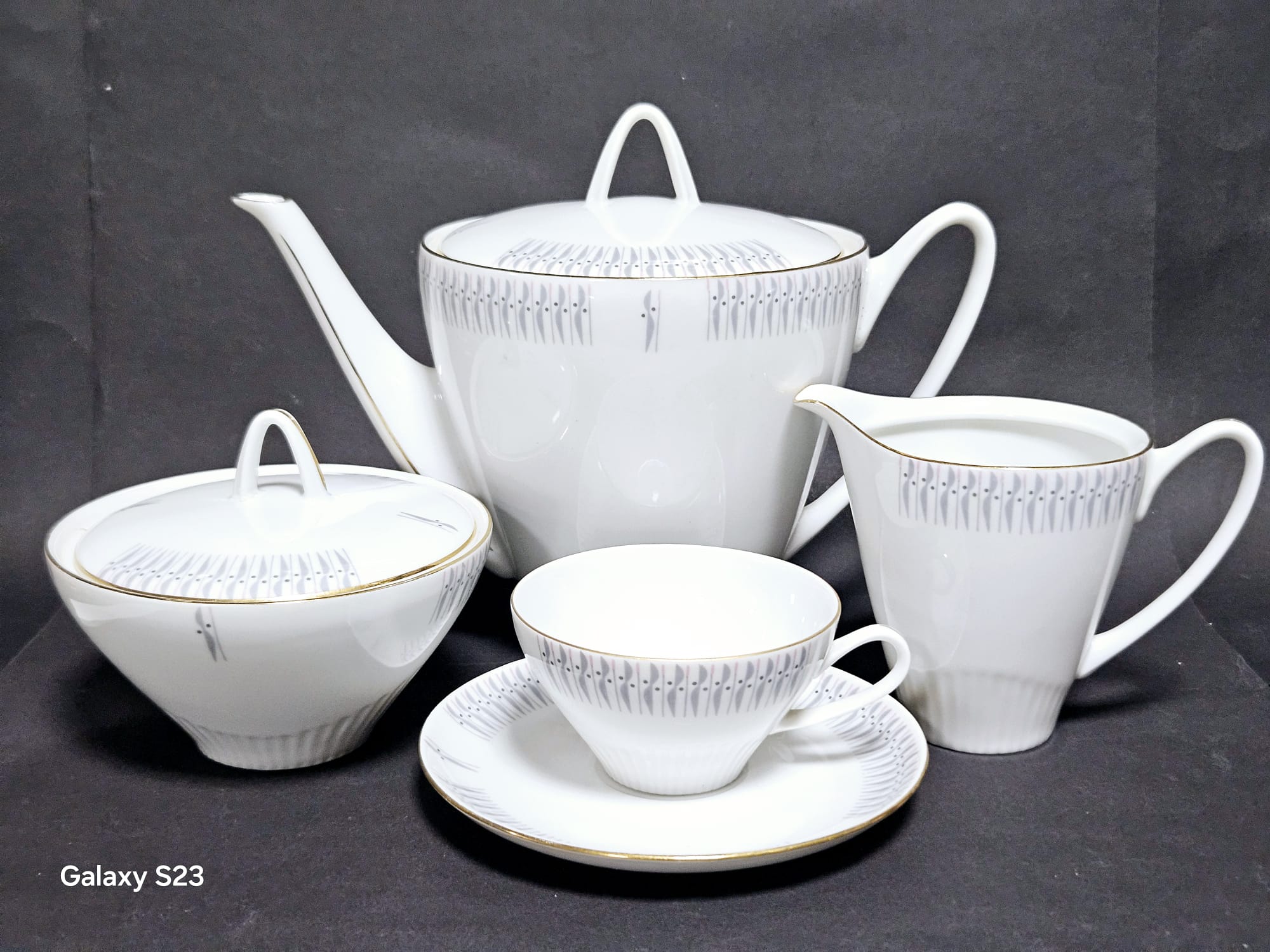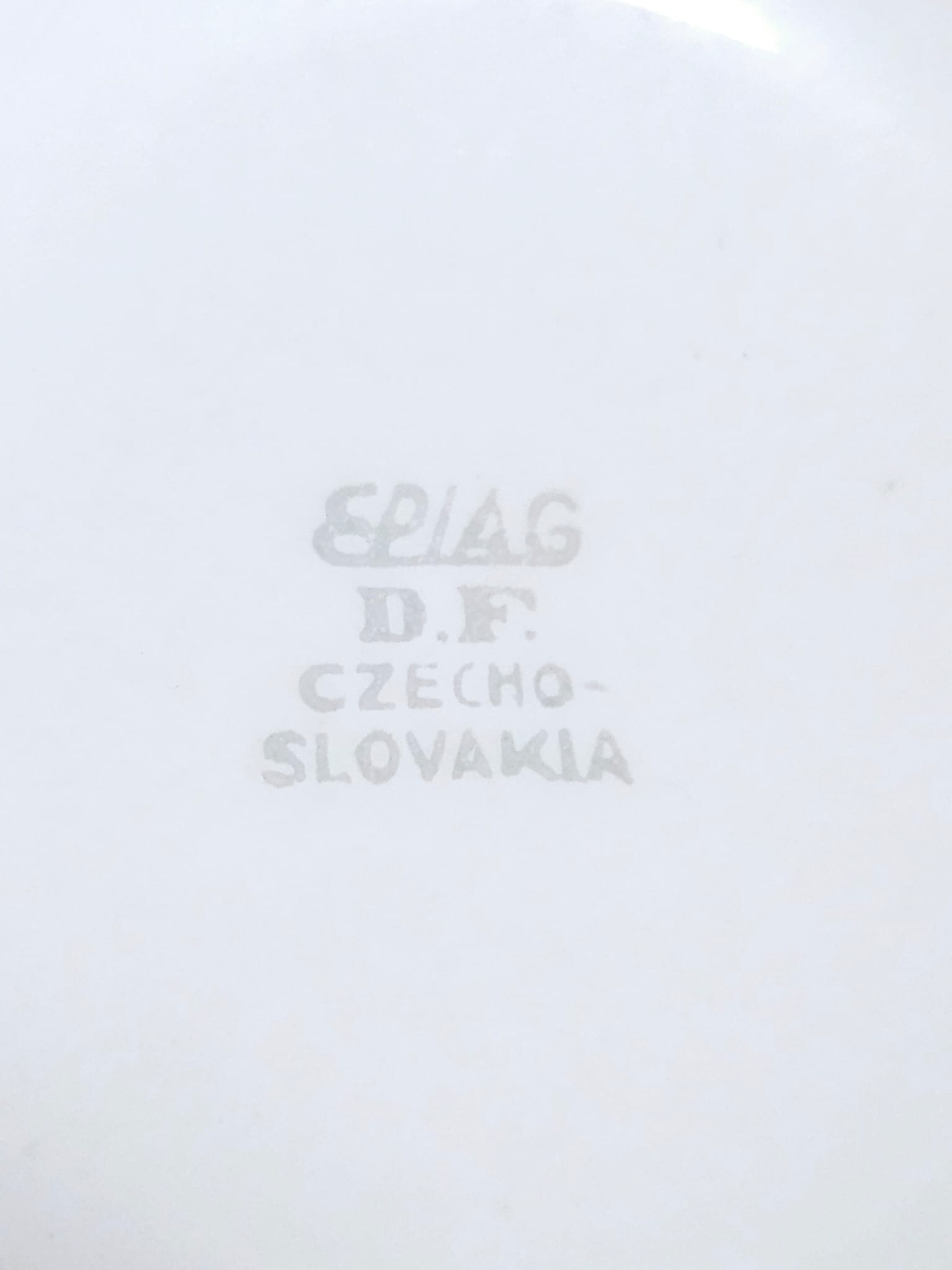 Czeski serwis kawowy Epig D.F z sygnaturką z 1946 roku. Składa się z dzbanka, cukiernicy, mlecznika, filiżanek oraz spodki. Porcelana biała, akcentowana złotym paskiem. Po części ryflowana, dekor subtelny w kolorze beżu i różu. Wymiary: Dzbanek wysoki 15 cm, średnica górna 15 cm, średnica podstawy 7 cm. Rozpiętość od dziubka do ucha 25 cm. Cukiernica o średnicy 13,5 cm, średnica podstawy 5,5 cm, wysoka 7 cm. Mlecznik o średnicy 8 cm, od dziubka do ucha 14 cm, średnica podstawy 4,5 cm, wysoki 11 cm. Średnica filiżanki 9,5 cm, średnica podstawy 4cm, wysokość 5 cm. Talerzyk tzw. spodek o średnicy 15 cm, wysoki 1,5 cm. Stan bardzo dobry. Istnieje możliwość dokupienia pojedynczych zestawów czyli filiżanki i spodki, do wyczerpania zapasów. Cena 200 złoty.