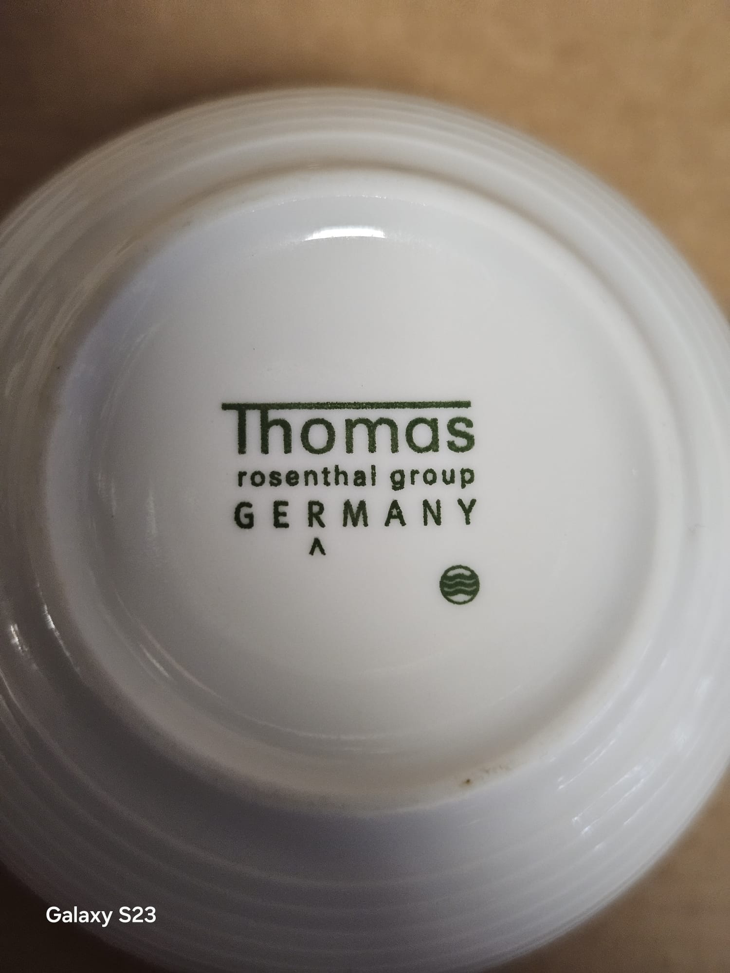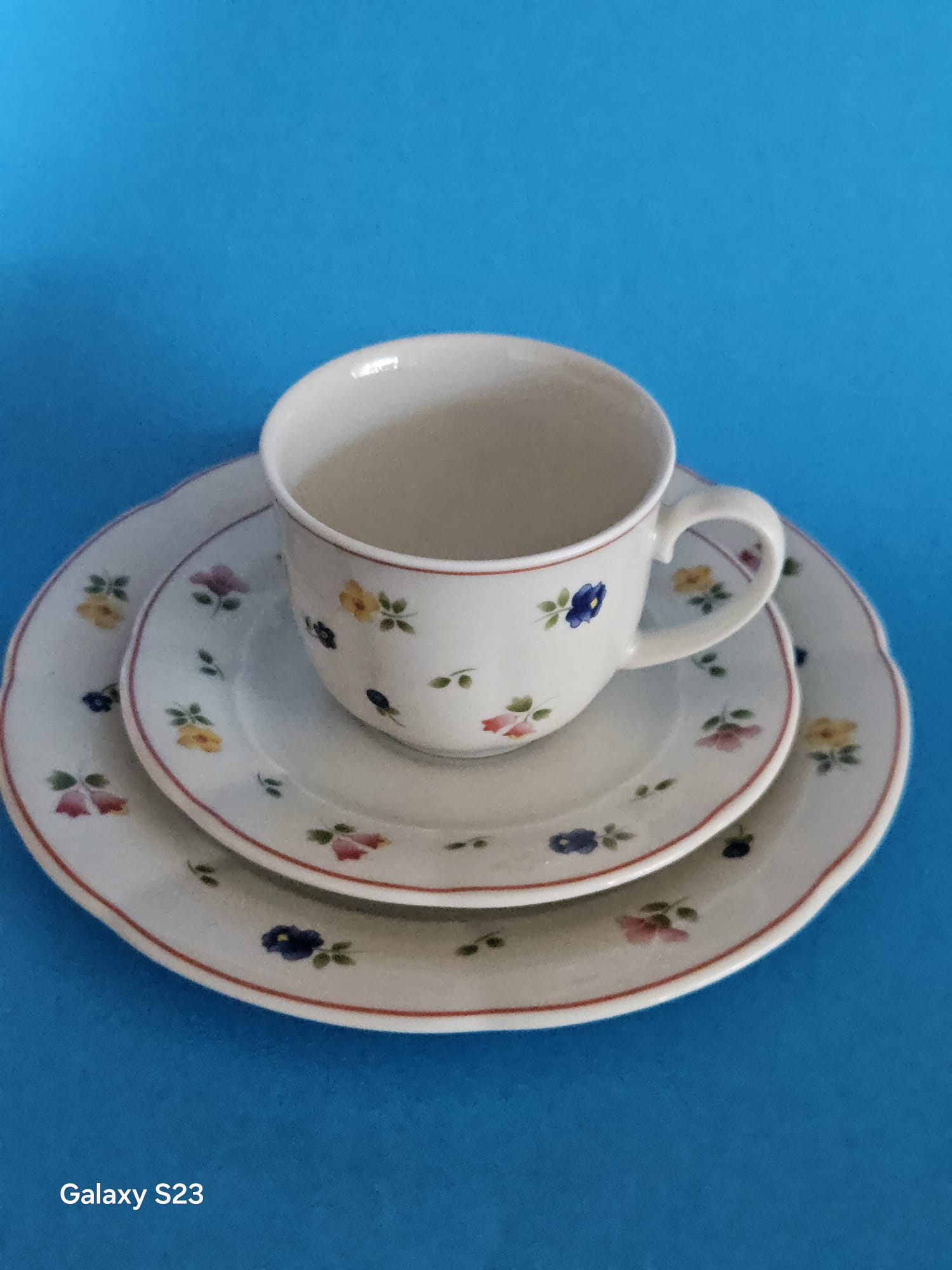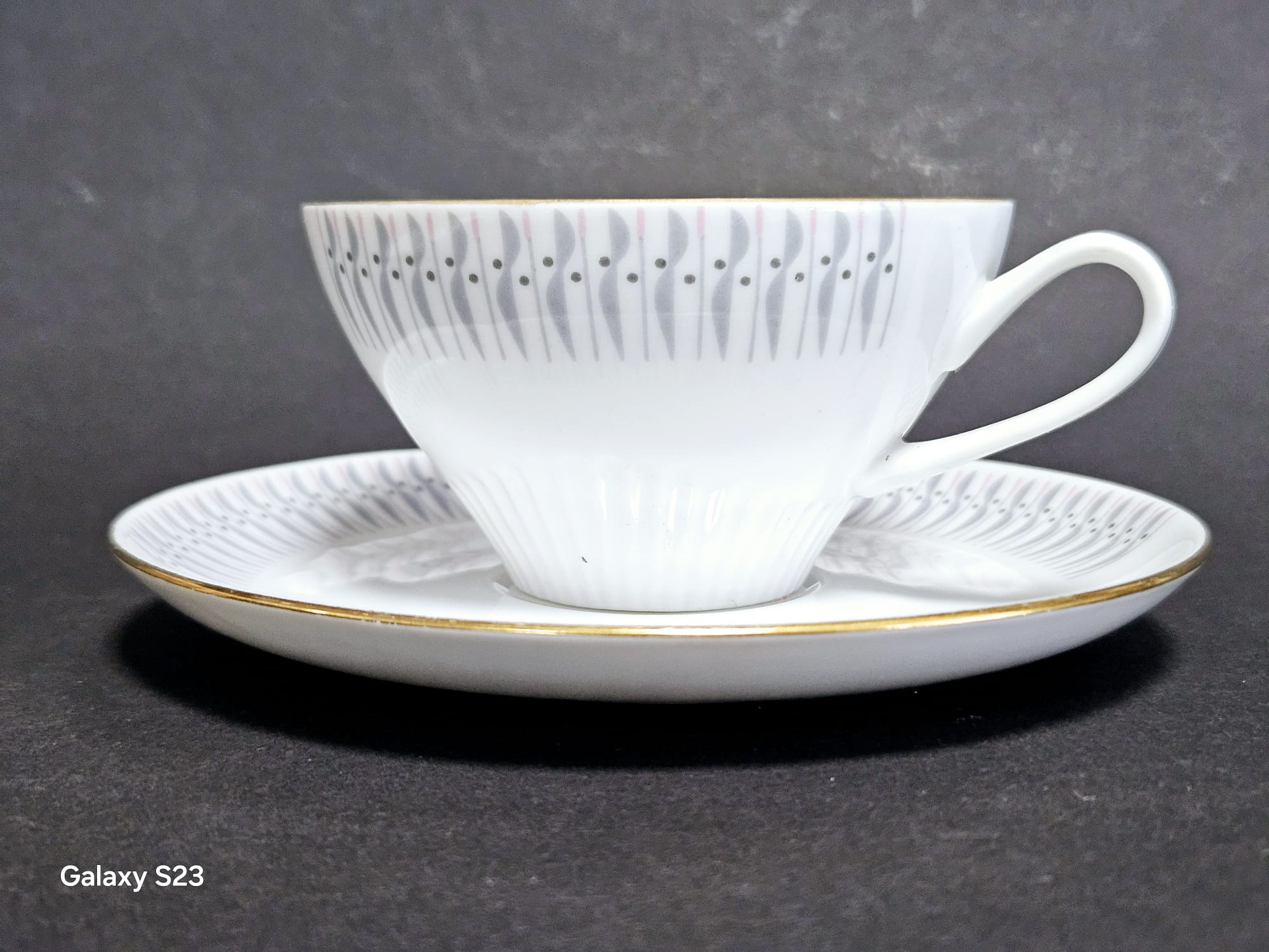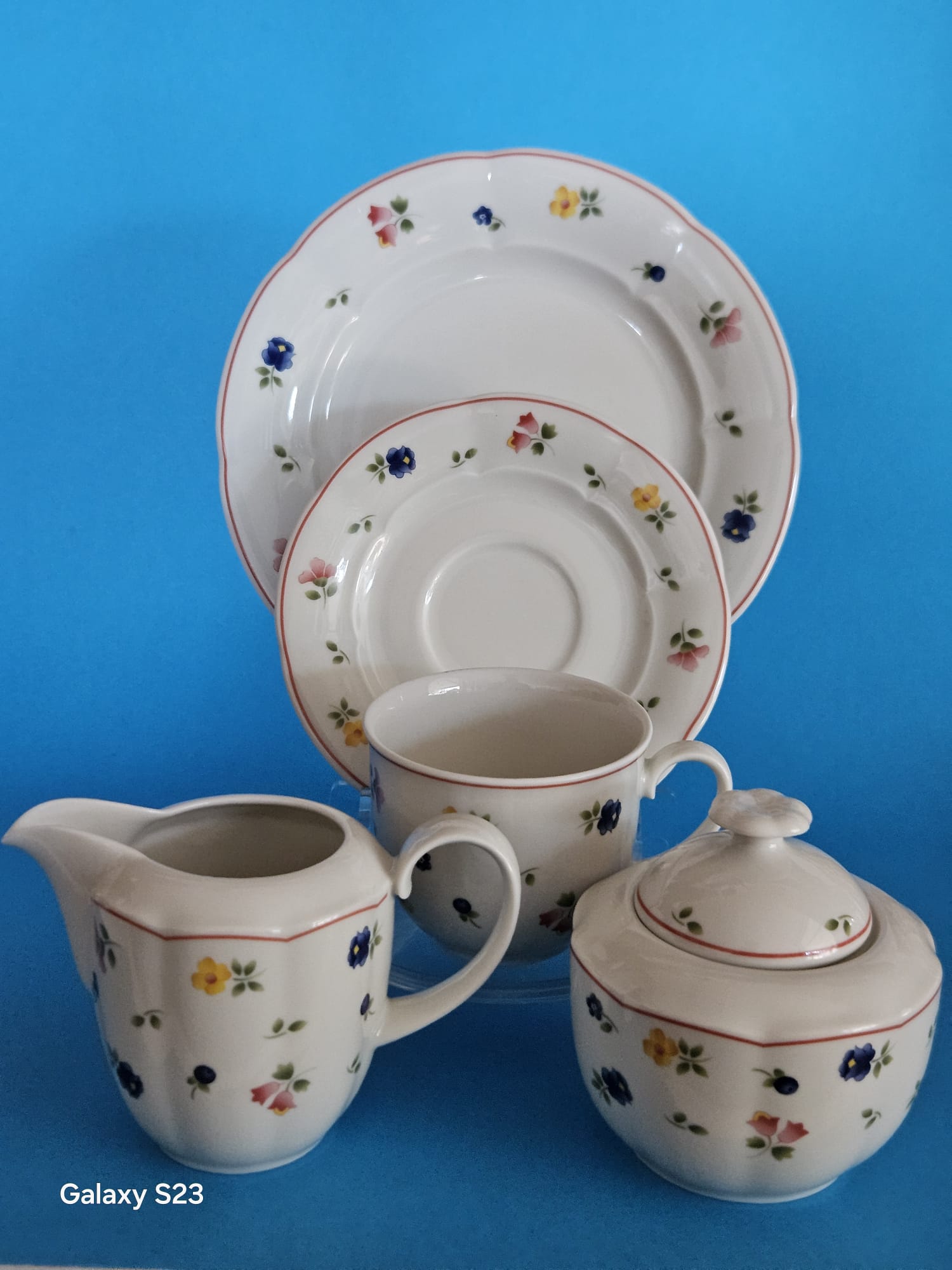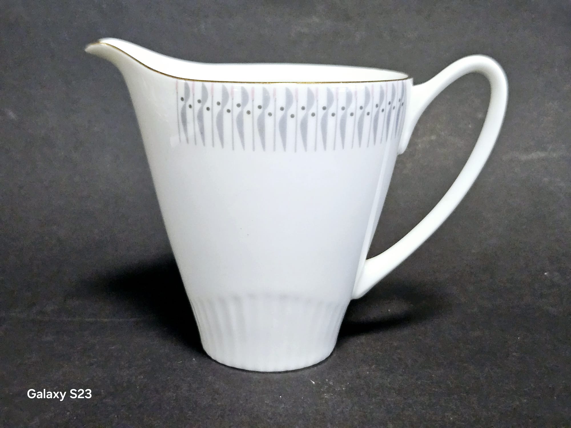 Czeski serwis kawowy Epig D.F z sygnaturką z 1946 roku. Składa się z dzbanka, cukiernicy, mlecznika, filiżanek oraz spodki. Porcelana biała, akcentowana złotym paskiem. Po części ryflowana, dekor subtelny w kolorze beżu i różu. Wymiary: Dzbanek wysoki 15 cm, średnica górna 15 cm, średnica podstawy 7 cm. Rozpiętość od dziubka do ucha 25 cm. Cukiernica o średnicy 13,5 cm, średnica podstawy 5,5 cm, wysoka 7 cm. Mlecznik o średnicy 8 cm, od dziubka do ucha 14 cm, średnica podstawy 4,5 cm, wysoki 11 cm. Średnica filiżanki 9,5 cm, średnica podstawy 4cm, wysokość 5 cm. Talerzyk tzw. spodek o średnicy 15 cm, wysoki 1,5 cm. Stan bardzo dobry. Istnieje możliwość dokupienia pojedynczych zestawów czyli filiżanki i spodki, do wyczerpania zapasów. Cena 200 złoty.