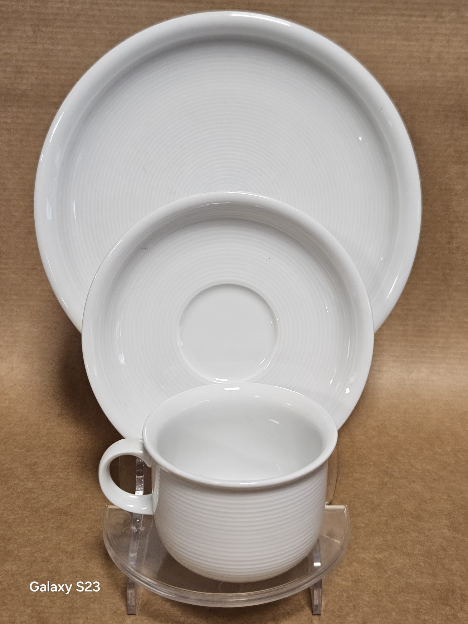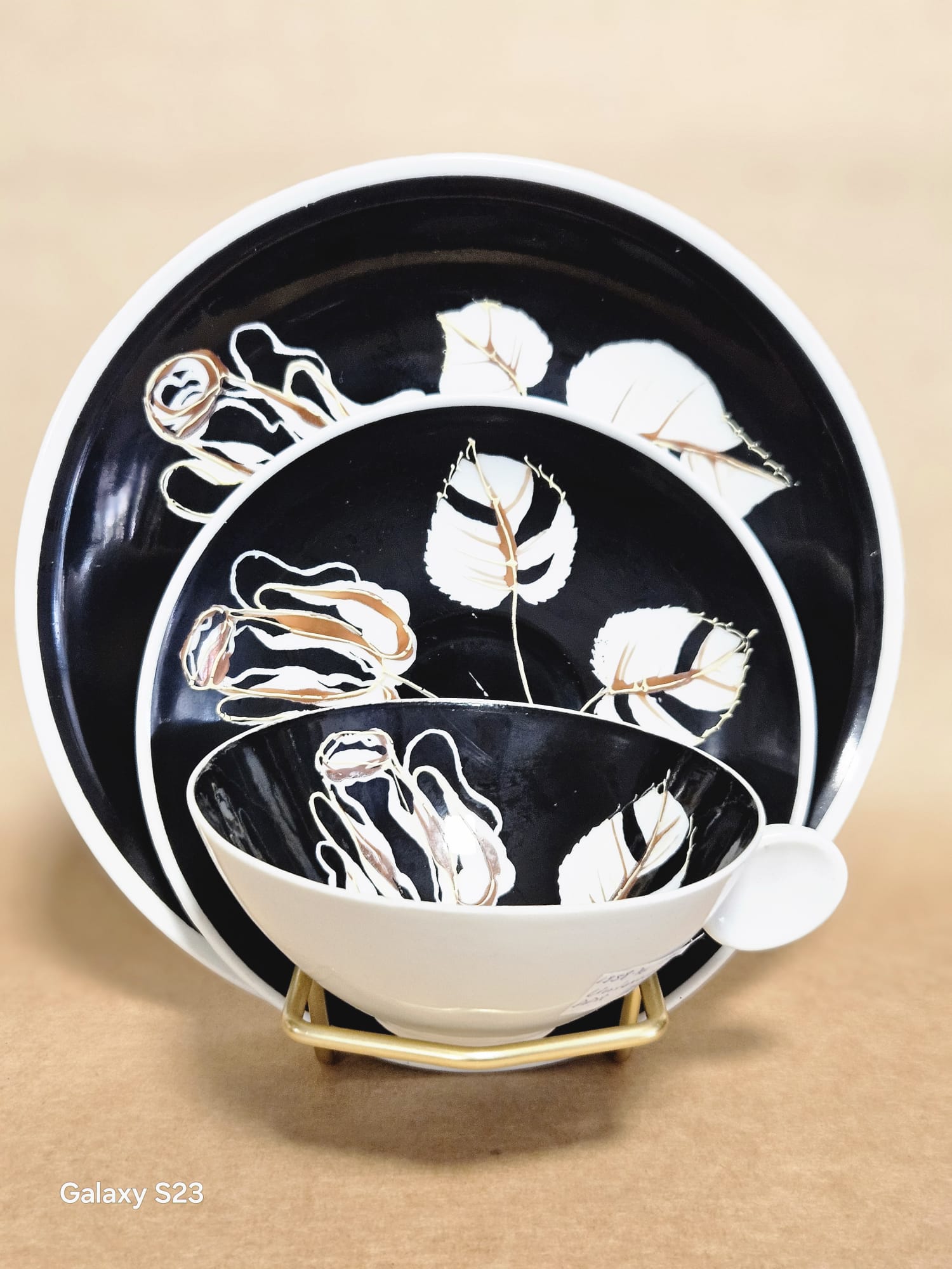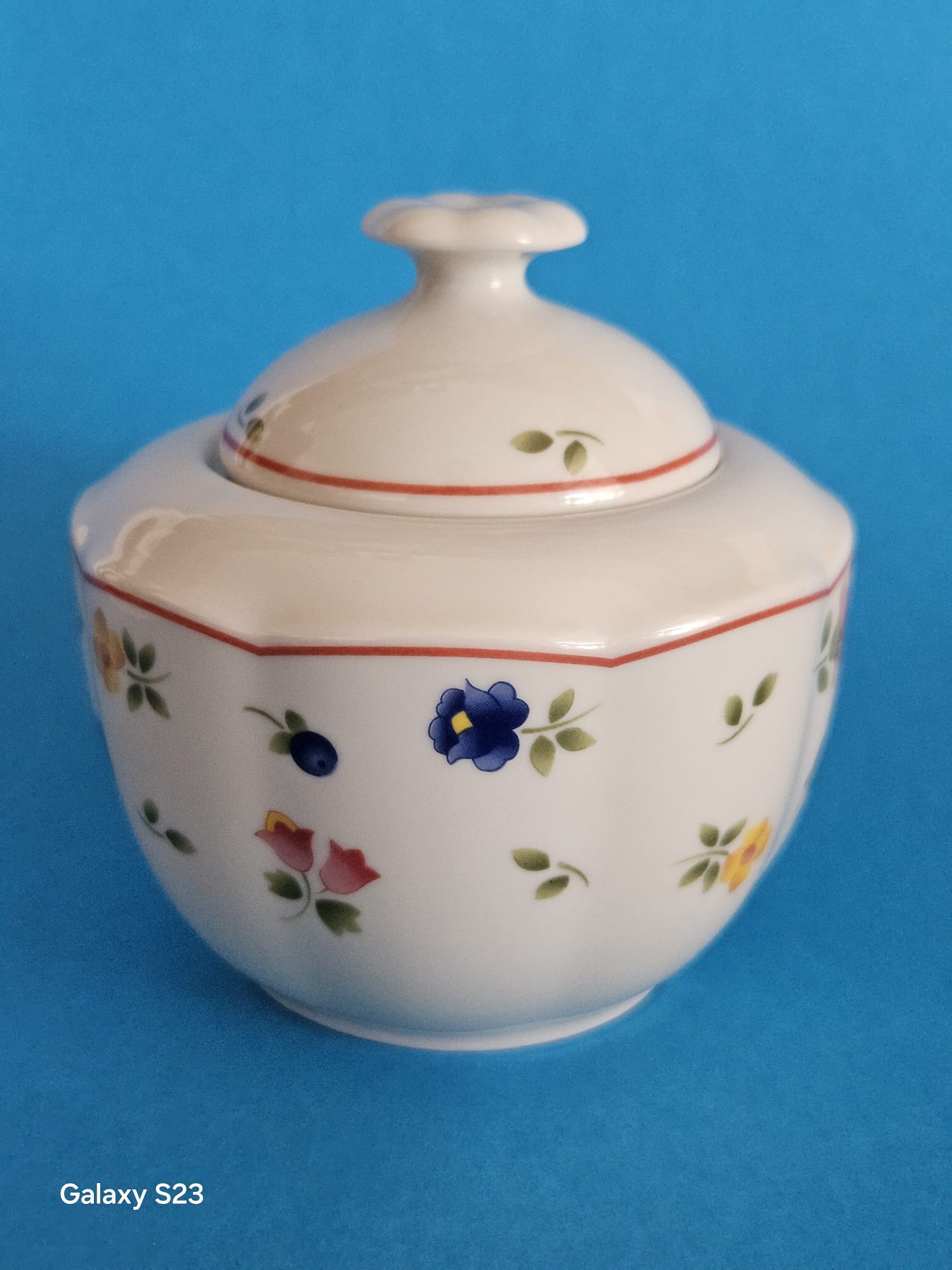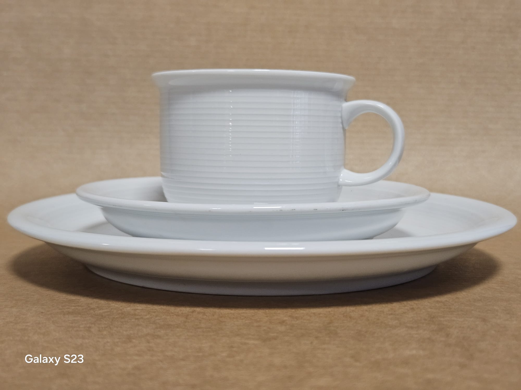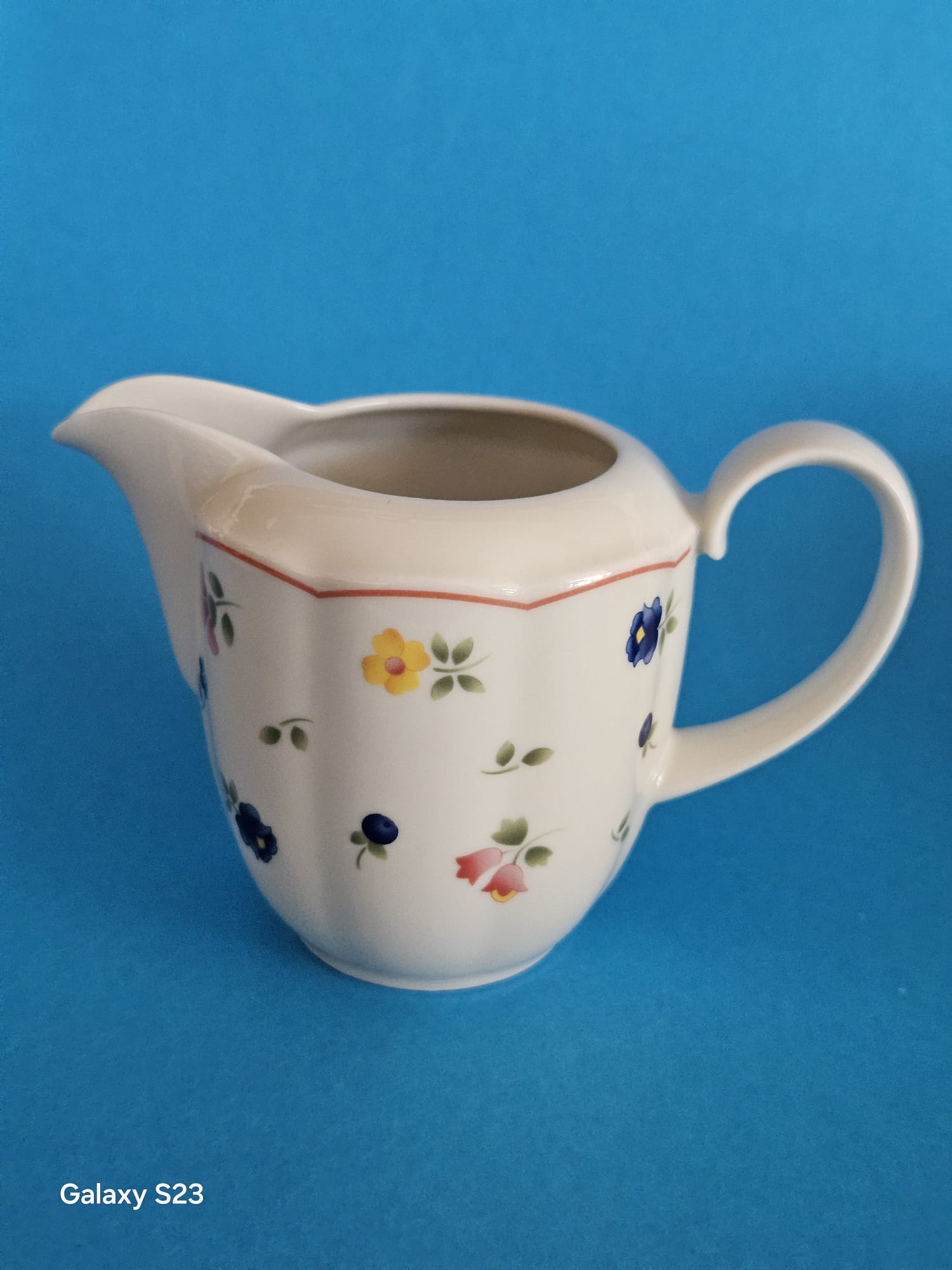 Czeski serwis kawowy Epig D.F z sygnaturką z 1946 roku. Składa się z dzbanka, cukiernicy, mlecznika, filiżanek oraz spodki. Porcelana biała, akcentowana złotym paskiem. Po części ryflowana, dekor subtelny w kolorze beżu i różu. Wymiary: Dzbanek wysoki 15 cm, średnica górna 15 cm, średnica podstawy 7 cm. Rozpiętość od dziubka do ucha 25 cm. Cukiernica o średnicy 13,5 cm, średnica podstawy 5,5 cm, wysoka 7 cm. Mlecznik o średnicy 8 cm, od dziubka do ucha 14 cm, średnica podstawy 4,5 cm, wysoki 11 cm. Średnica filiżanki 9,5 cm, średnica podstawy 4cm, wysokość 5 cm. Talerzyk tzw. spodek o średnicy 15 cm, wysoki 1,5 cm. Stan bardzo dobry. Istnieje możliwość dokupienia pojedynczych zestawów czyli filiżanki i spodki, do wyczerpania zapasów. Cena 200 złoty.