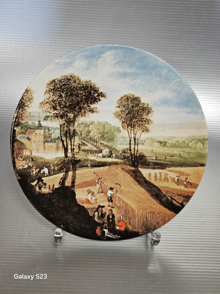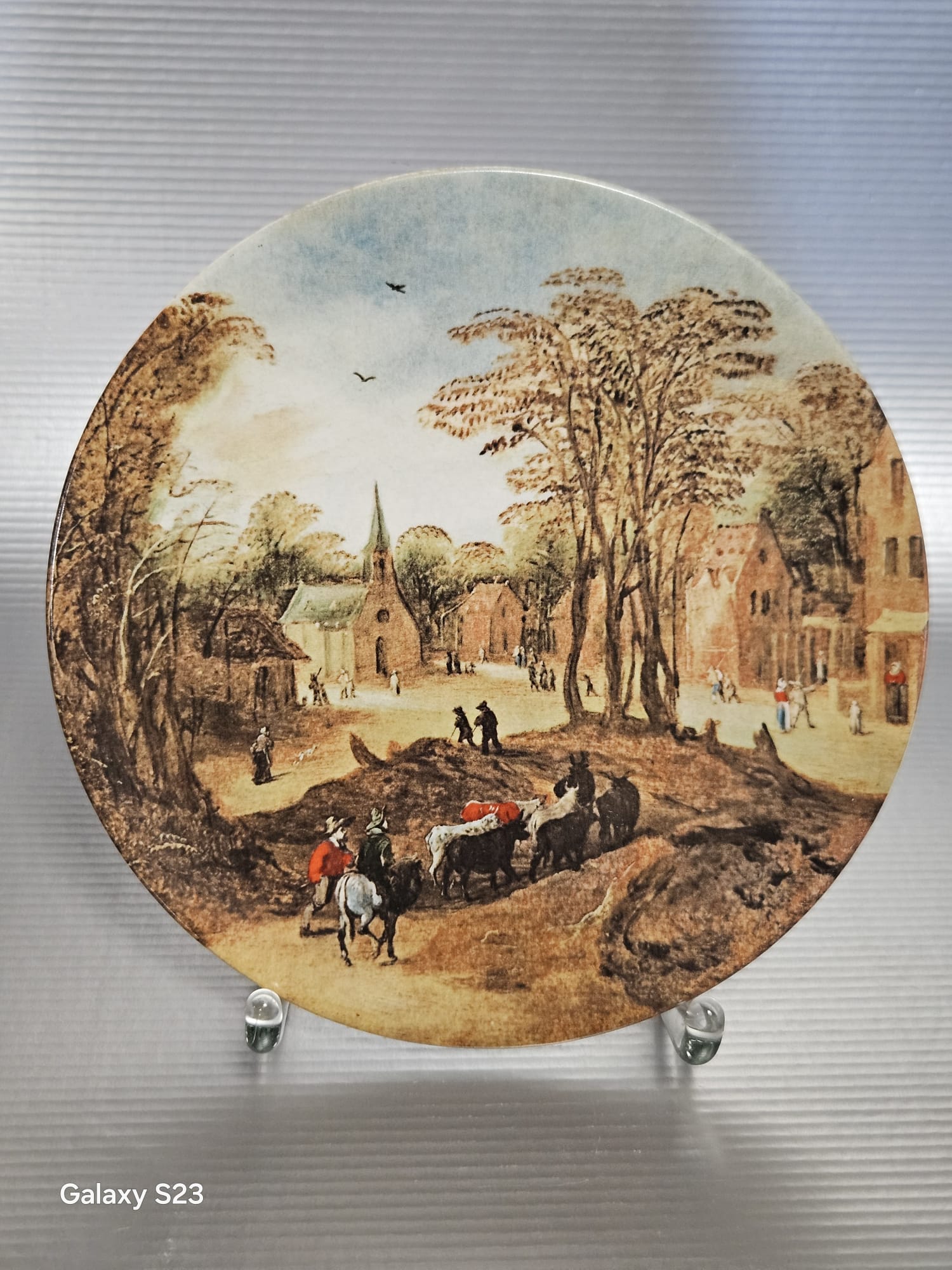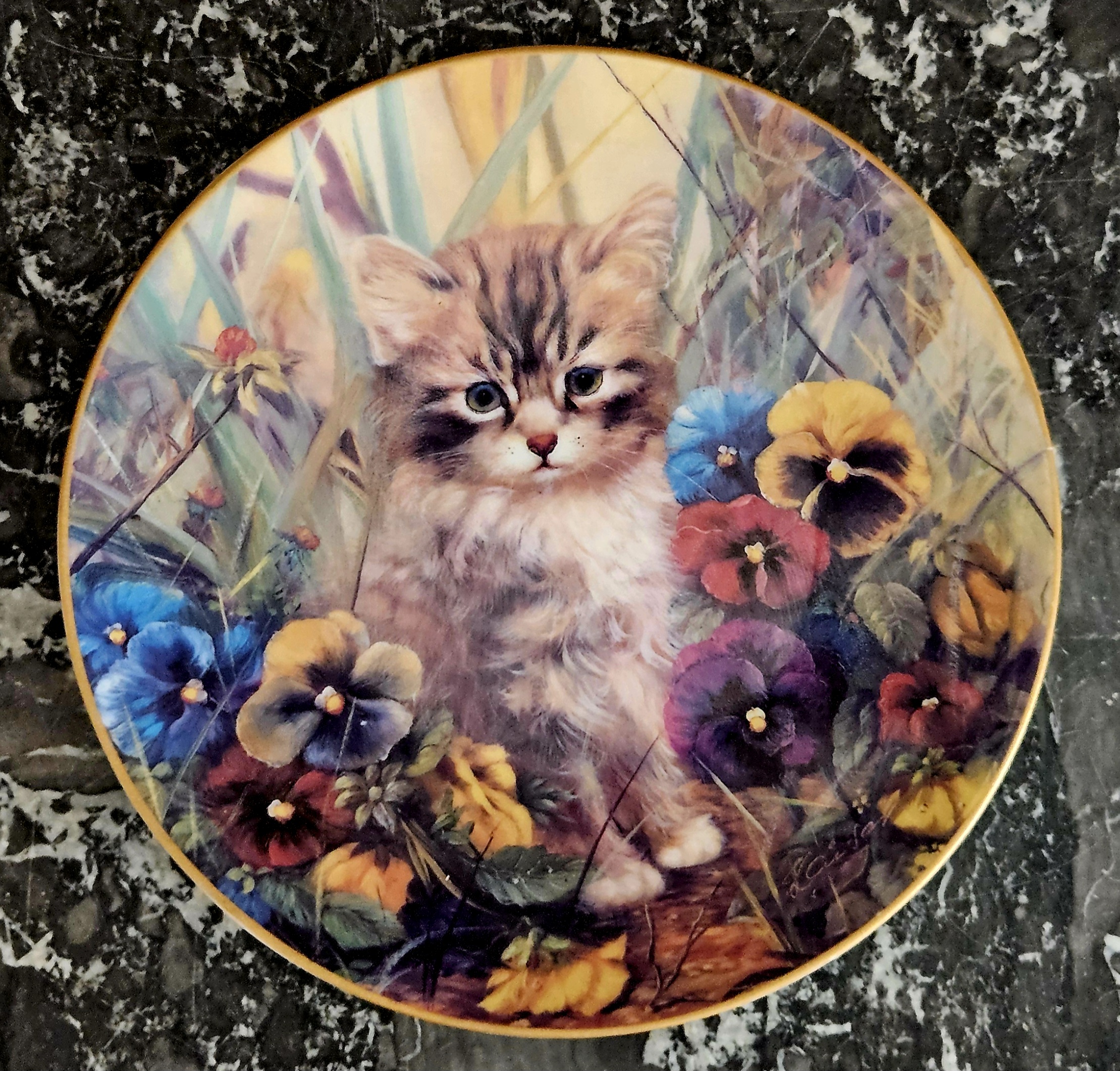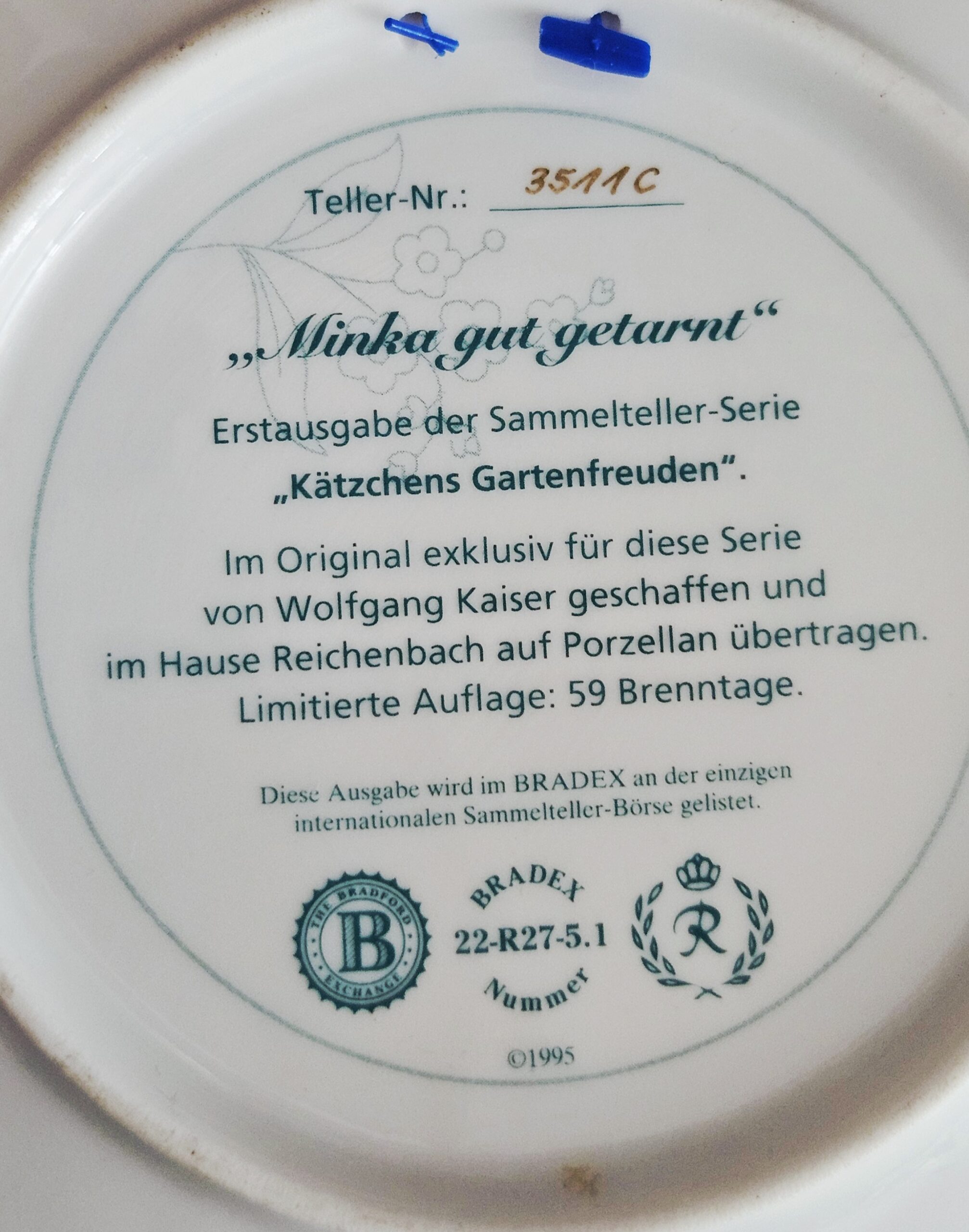 Limitowana seria ekskluzywnych talerzy o tytule „Radość kociego ogrodu” autorstwa Wolfganga Kaiser i wykonana na zlecenie przez wytwórnie porcelany Reichenbach w roku 1995. Talerz o tytule „Minka dobrze się zakamuflowała” nr. 3511C. Średnica talerza 19 cm, wysokość 2 cm. Plastikowa zawieszka, możliwość wymiany- dwa otwory. Stan bardzo dobry. Cena 80 złotych.