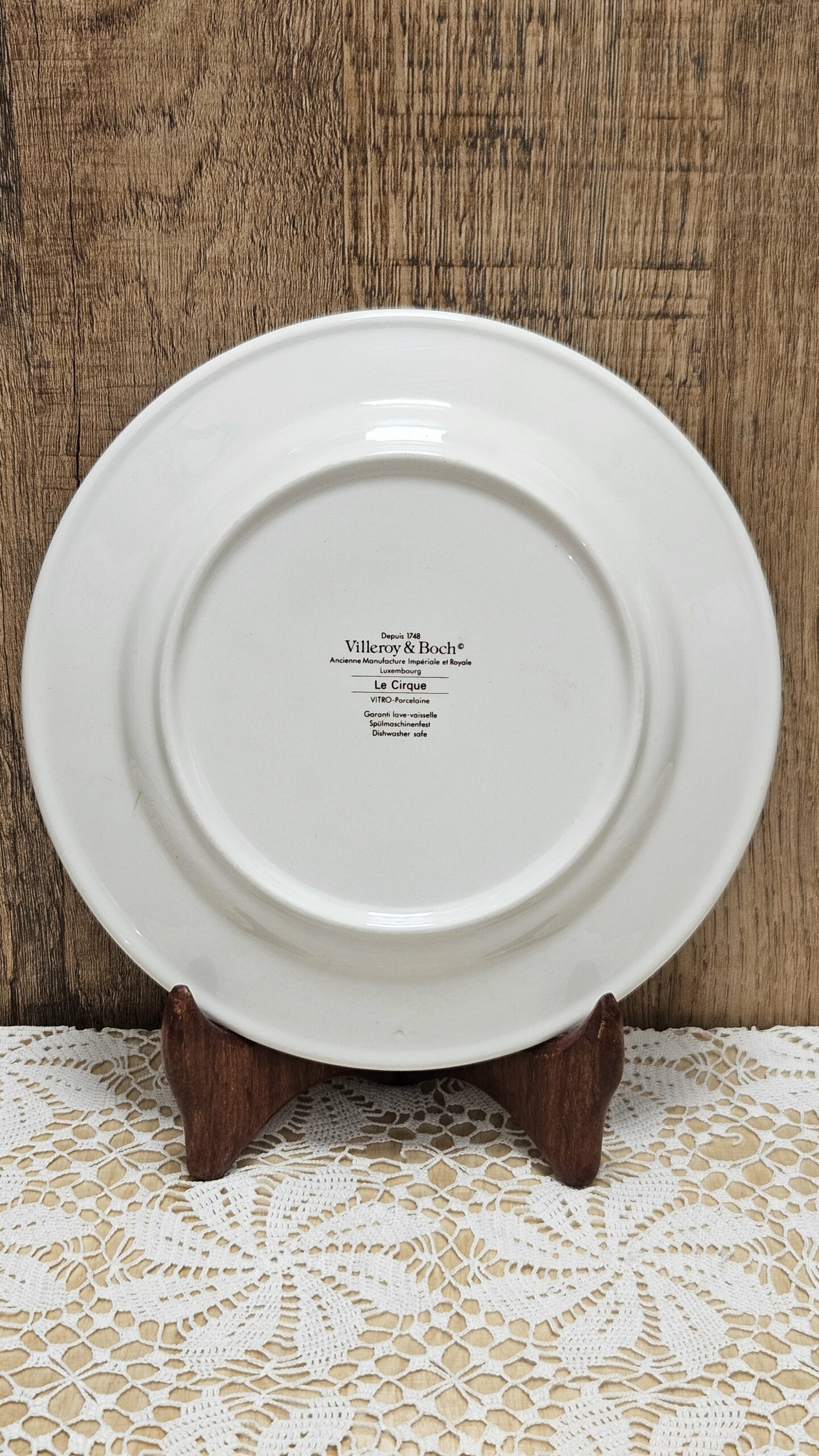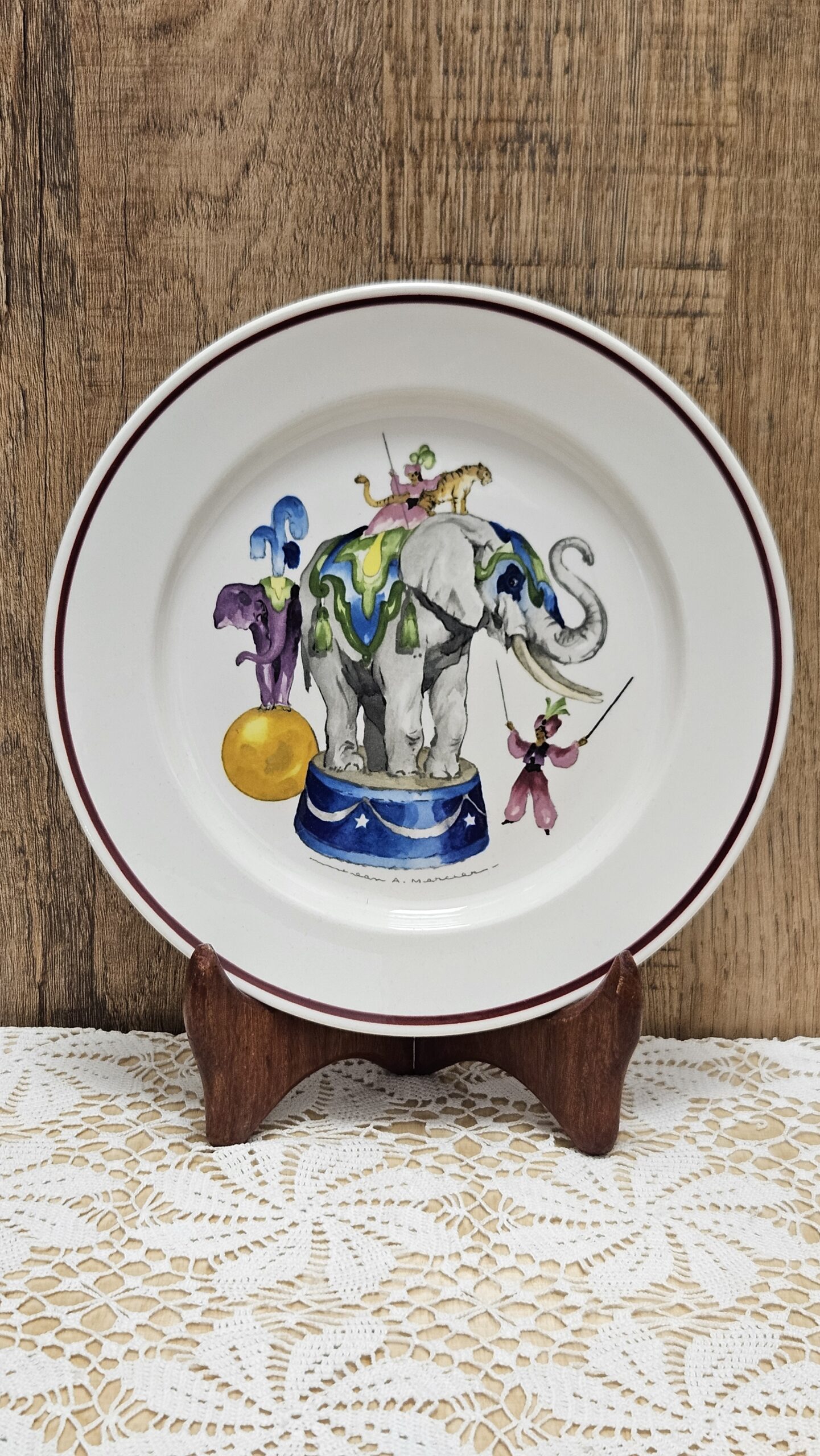 Porcelanowy talerz z kolekcji Villeroy& Boch Le Cirque, przedstawiający wzór Elephand Circus ( cyrk ze słoniem). Praca Jeana A. Merciera. Średnica 21 cm. wysokość 1,8 cm. Cena 80 zł.