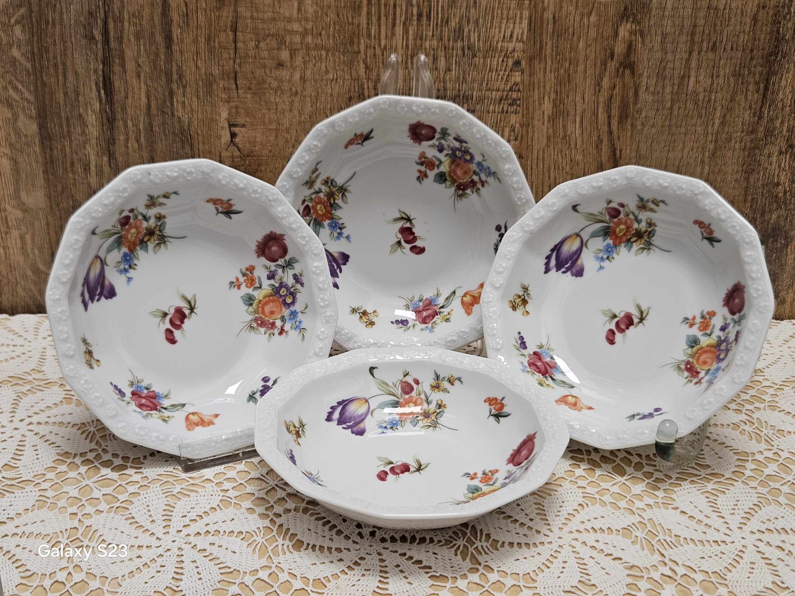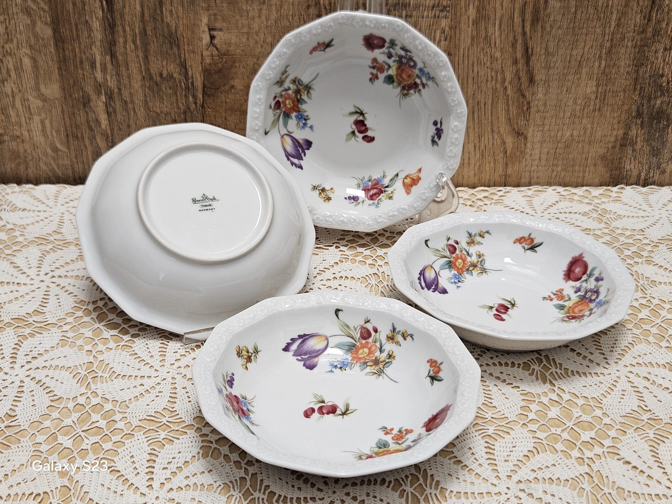Porcelanowe miseczki wytwórni porcelany Rosenthal z kolekcji Maria, wzór Sommerstrauss ( letni bukiet). Lata 70-te. Średnica miseczki 15 cm, wysokość 3,5 cm. Cena za sztukę 50 zł. Cena za komplet 150 zł.