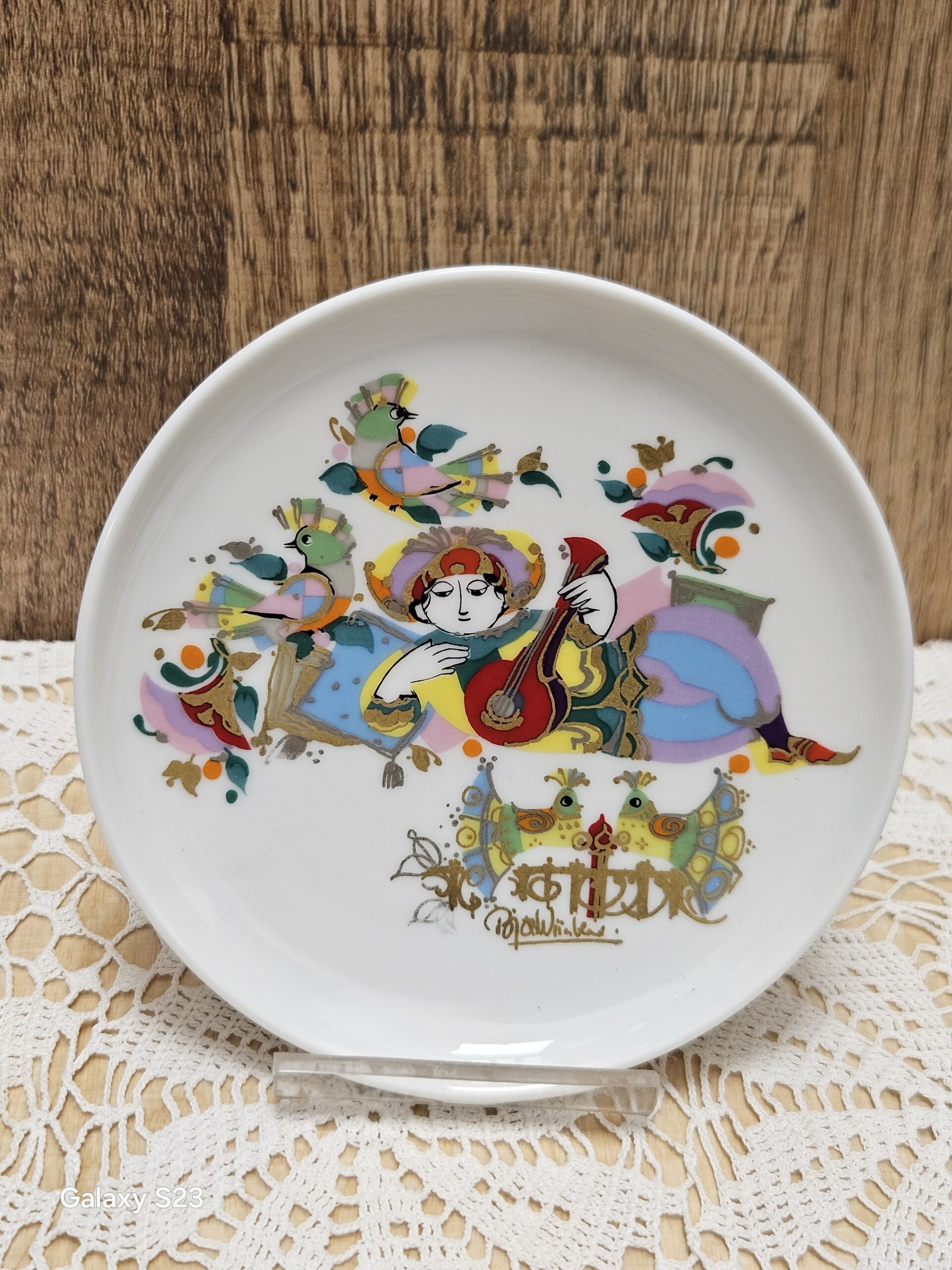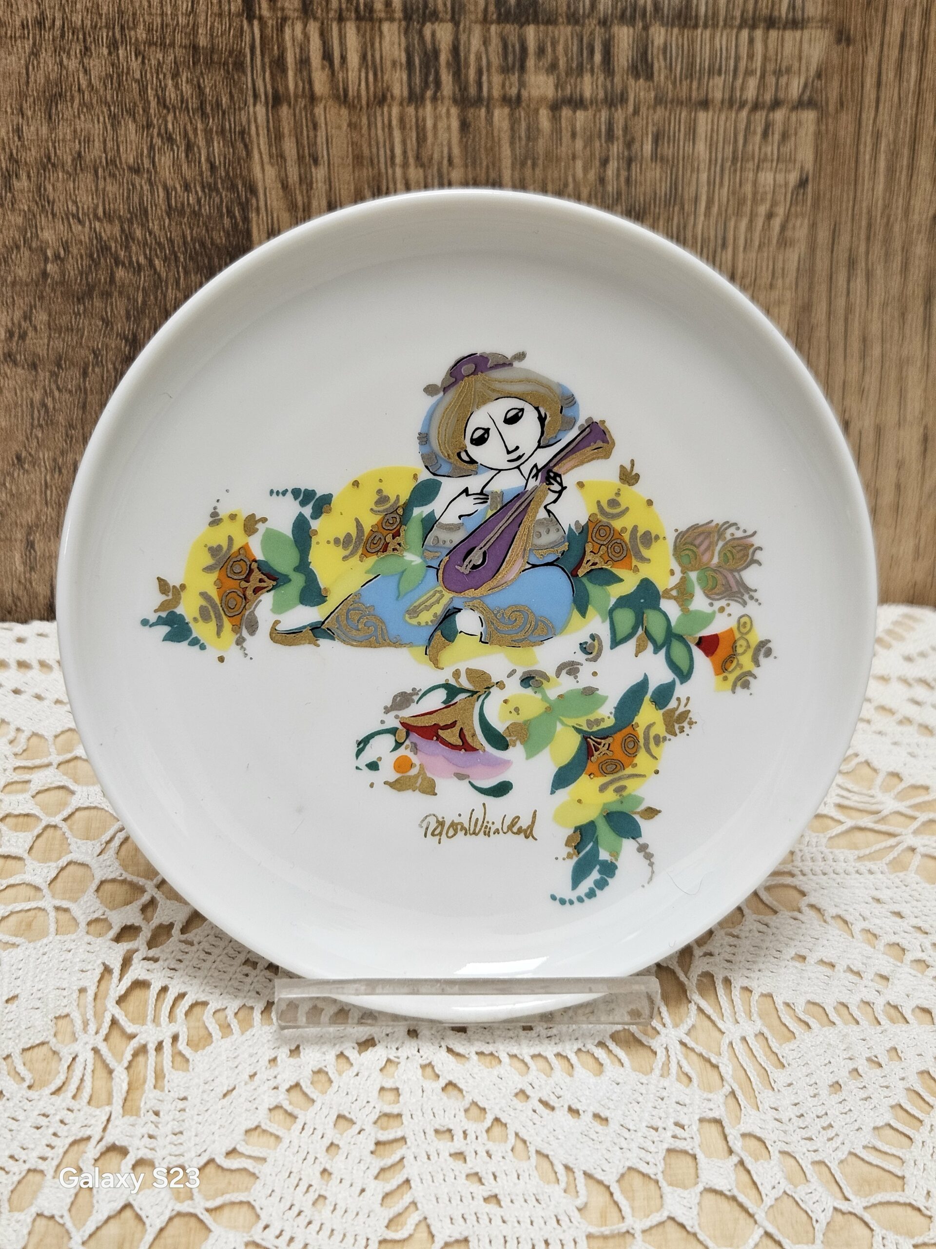 Porcelanowe talerzyki z wytwórni porcelany Rosenthal, projekt Bjorn Wiinblad. Seria Concertina, motyw „Baśnie z tysiąca i jednej nocy” Średnica talerzyka 11,5 cm, wysokość 1,5 cm. Cena za jeden talerzyk 50 zł.