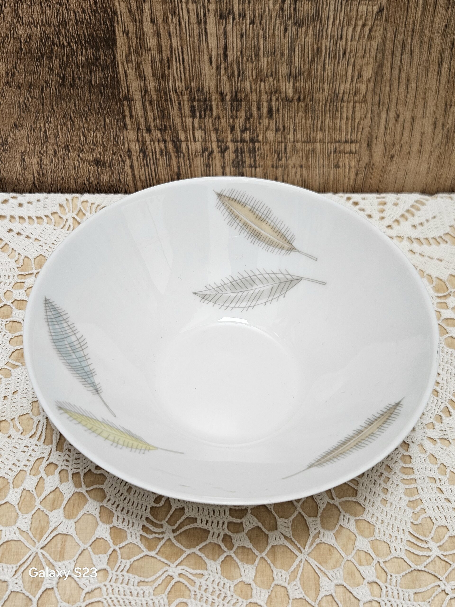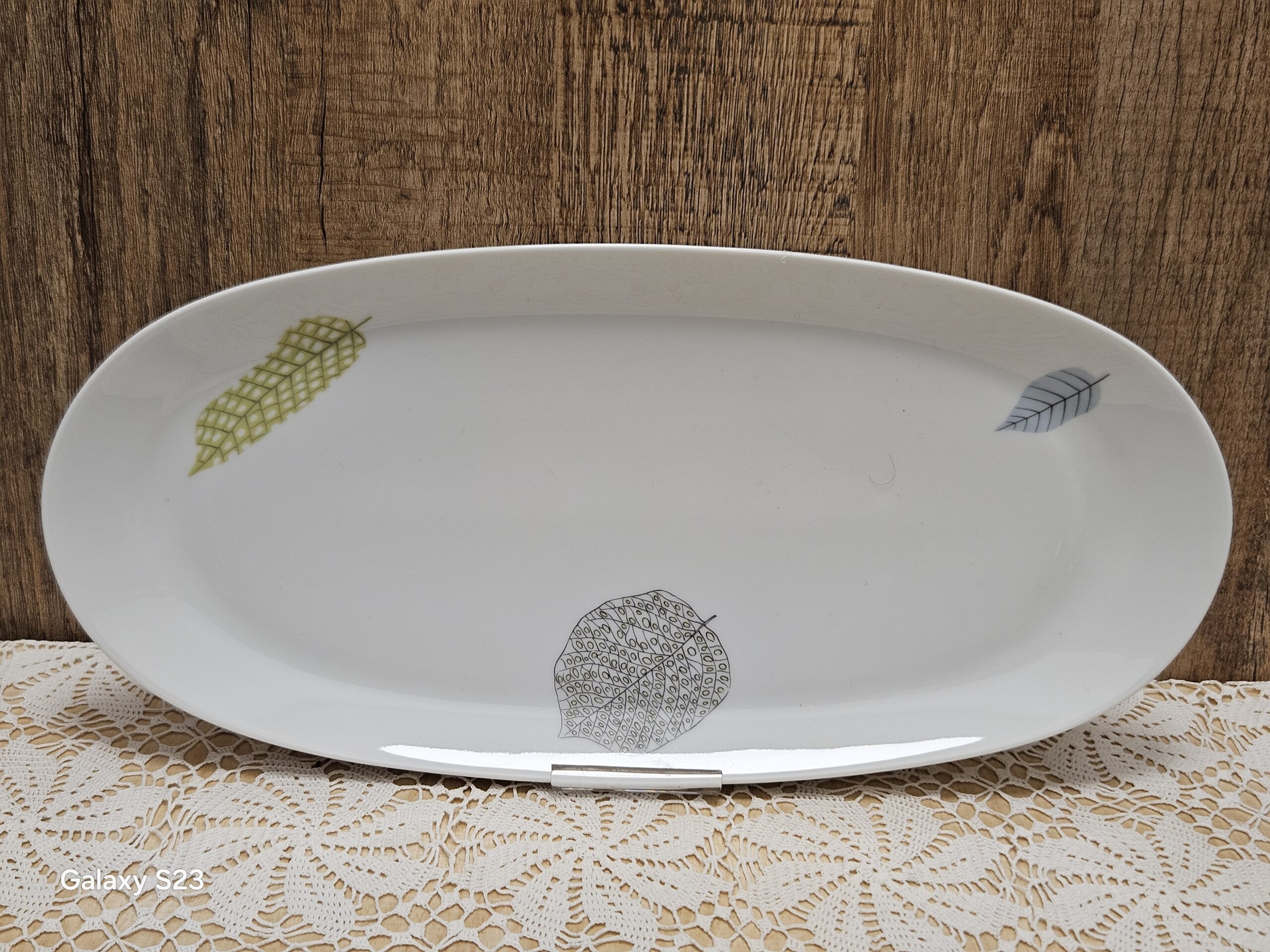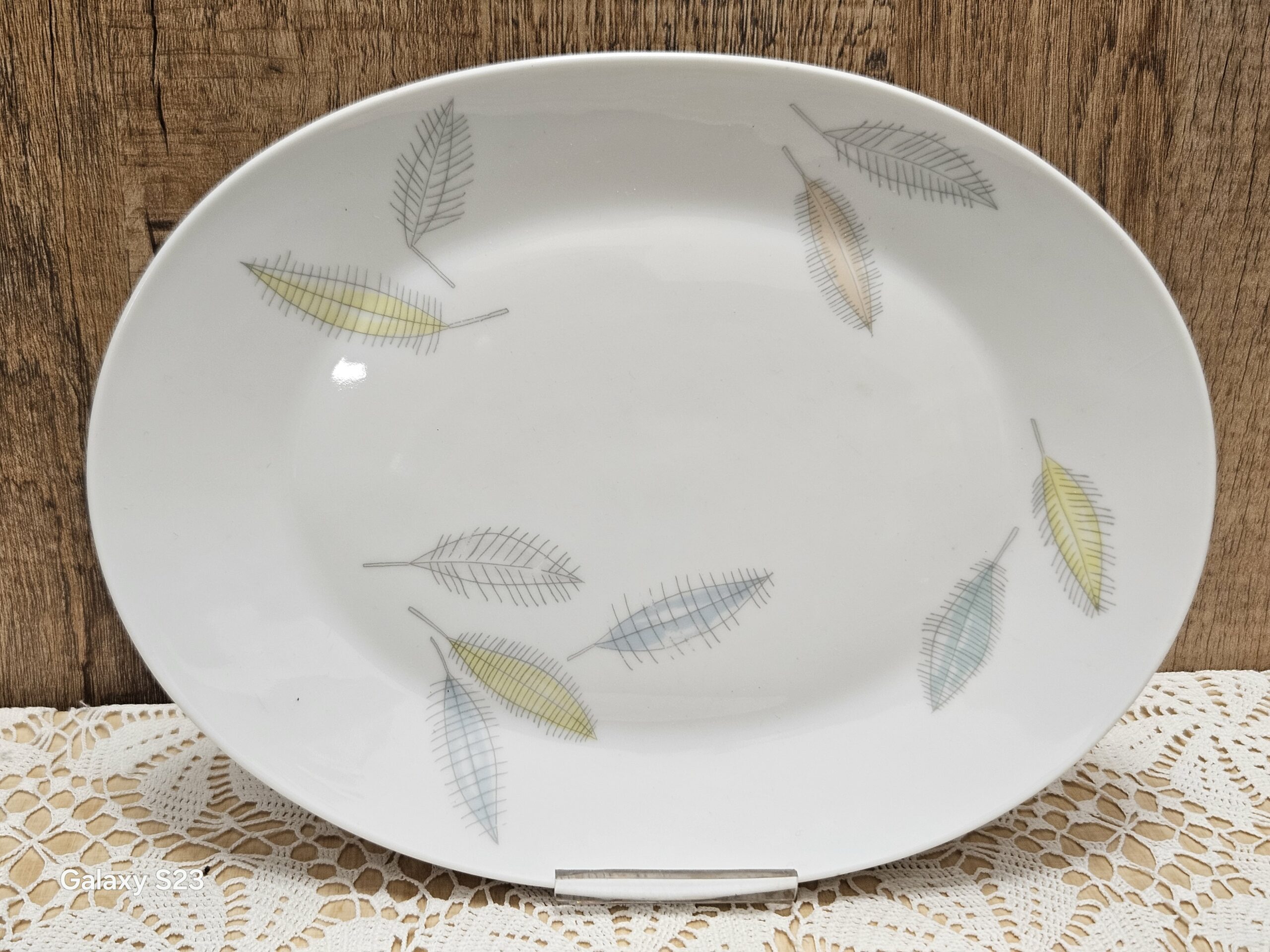 Porcelanowy talerz owalny marki Rosenthal, model 2000, Bunter Bletter-kolorowe liście. Projekt Romuald Loewy z lat 1950-60. Delikatna biała porcelana. Wymiar : długość 24,5 cm, szerokość 18,5 cm, wysoki 2 cm. Cena 50 zł.
