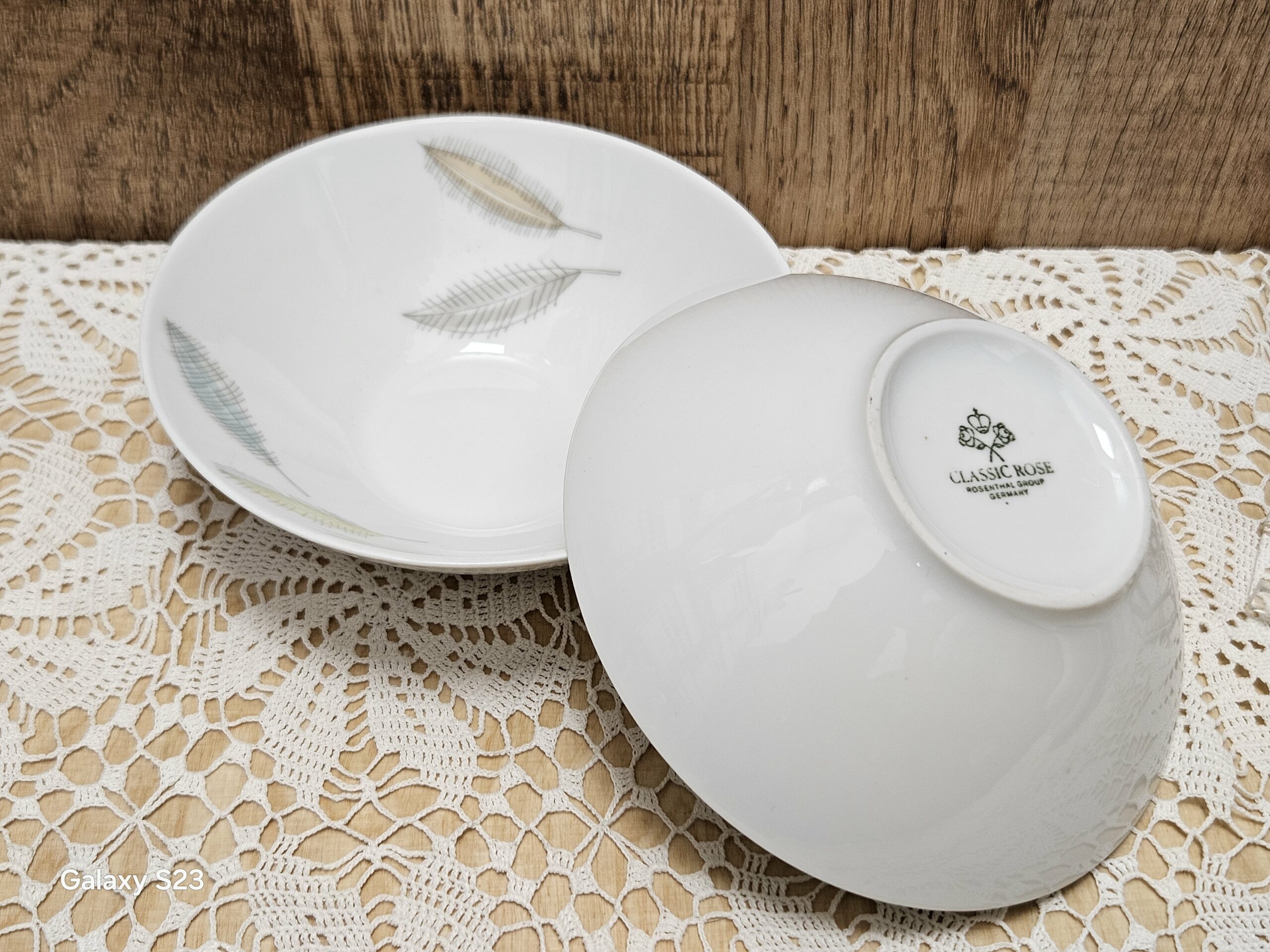 Porcelanowe miseczki wytworni porcelany Rosenthal, model 2000 Bunte Bletter. Projekt Romuald Loewy i Richard Latham, lata 1950-1960. Delikatna biała porcelana. Miseczka o wymiarach: średnica 13 cm, średnica podstawy wysokość 4,5 cm. Cena jednej miseczki 30 zł. Do wyczerpania zapasów.