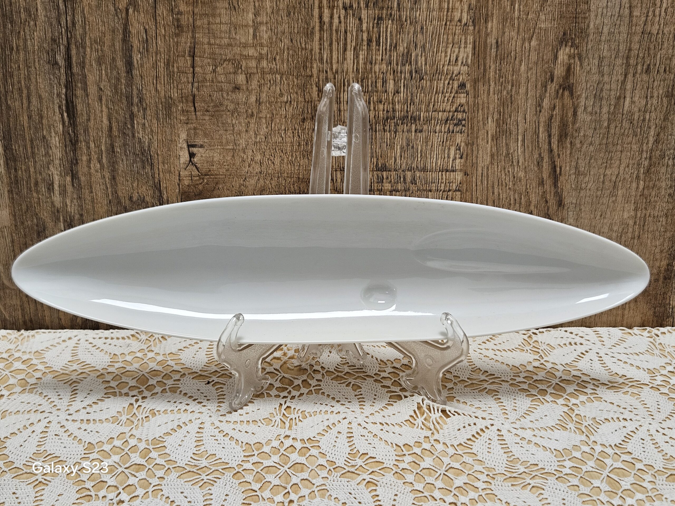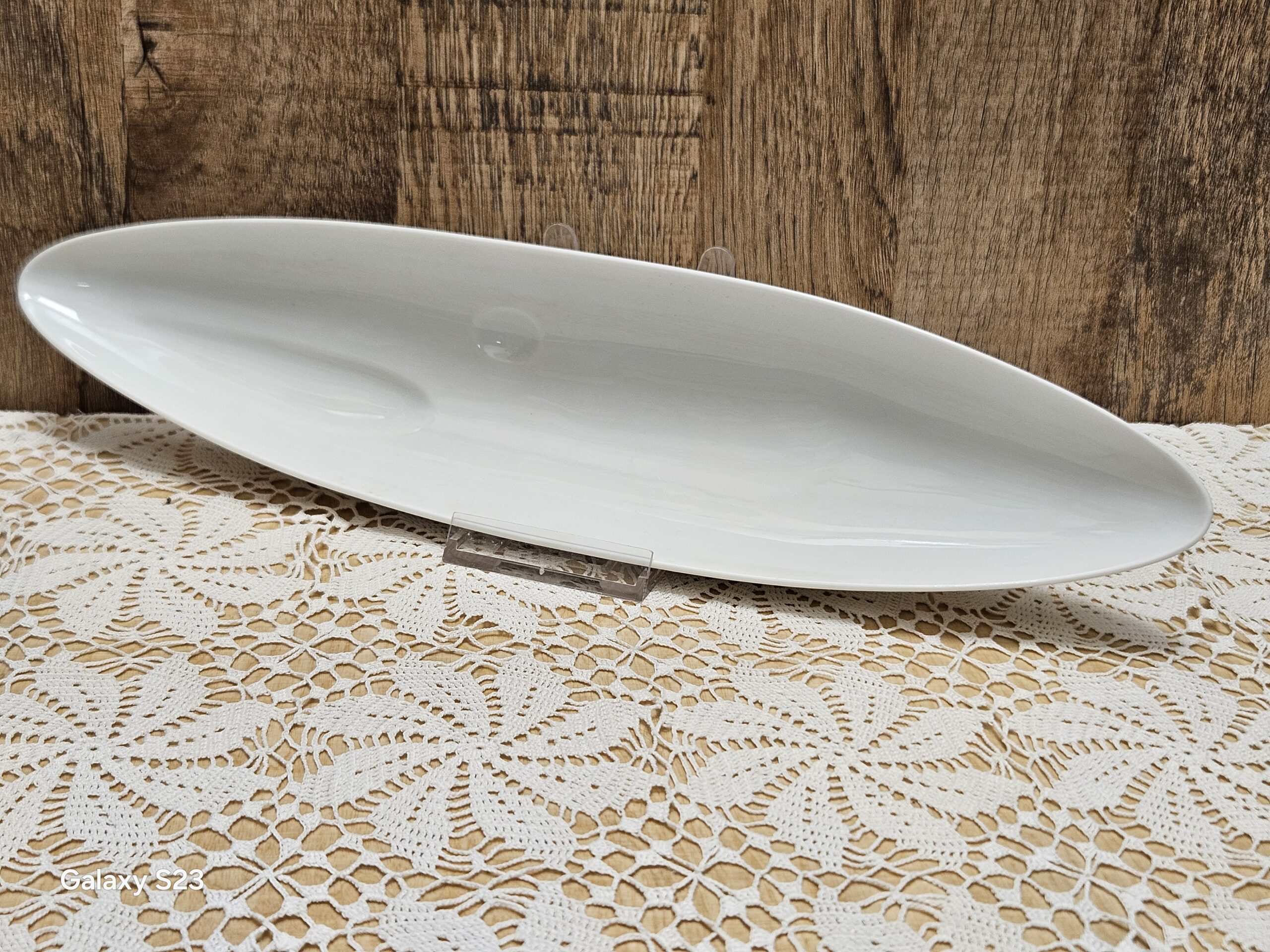 Porcelanowy talerz marki Rosenthal potocznie nazywany ” łudeczką”. Od wewnętrznej strony posiada dwa wgłębienia (widoczne na zdjęciach). Dłudość 36 cm, szerokość 8,5 cm, wysokość 3,5cm. Cena 40 zł.