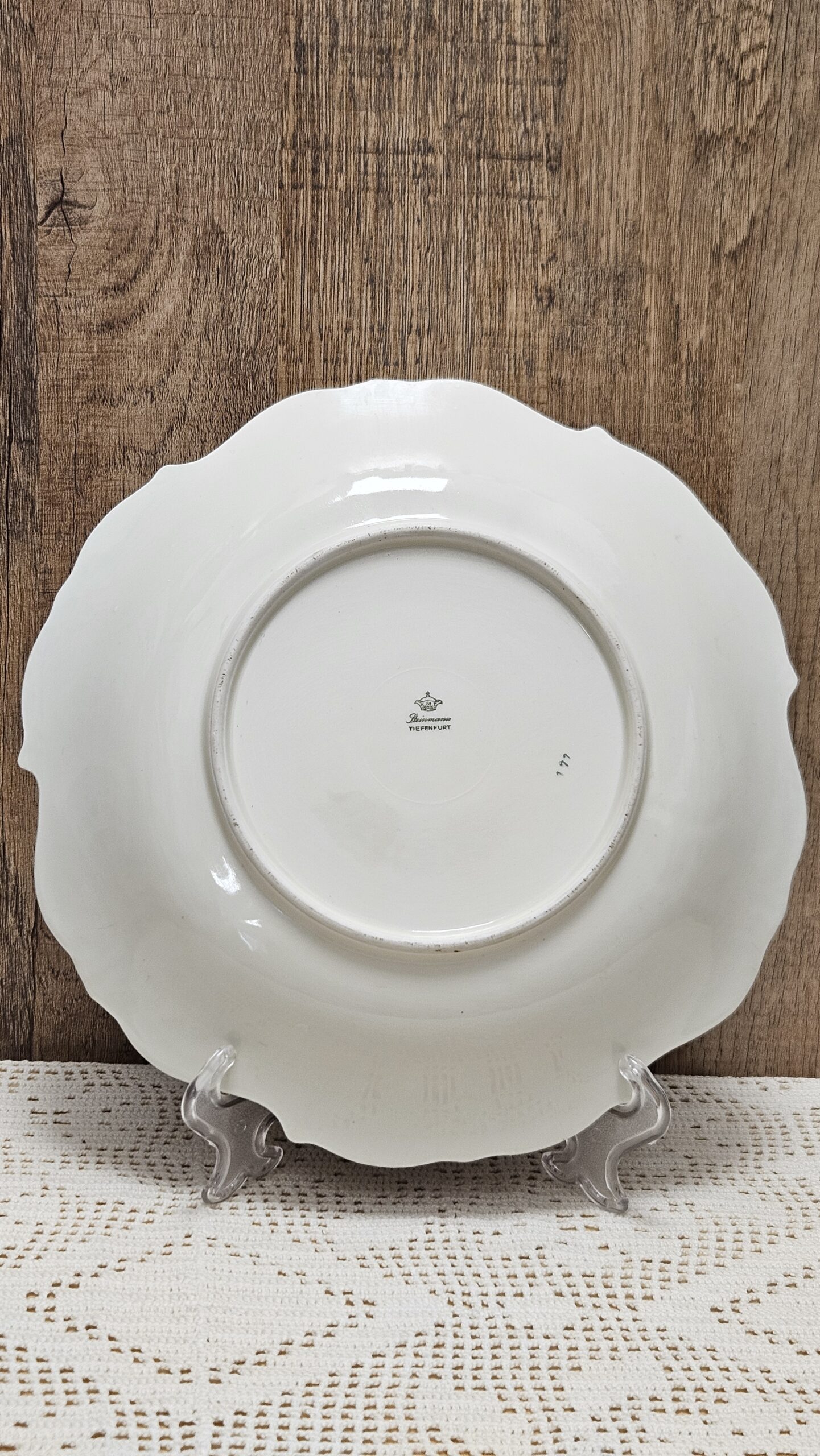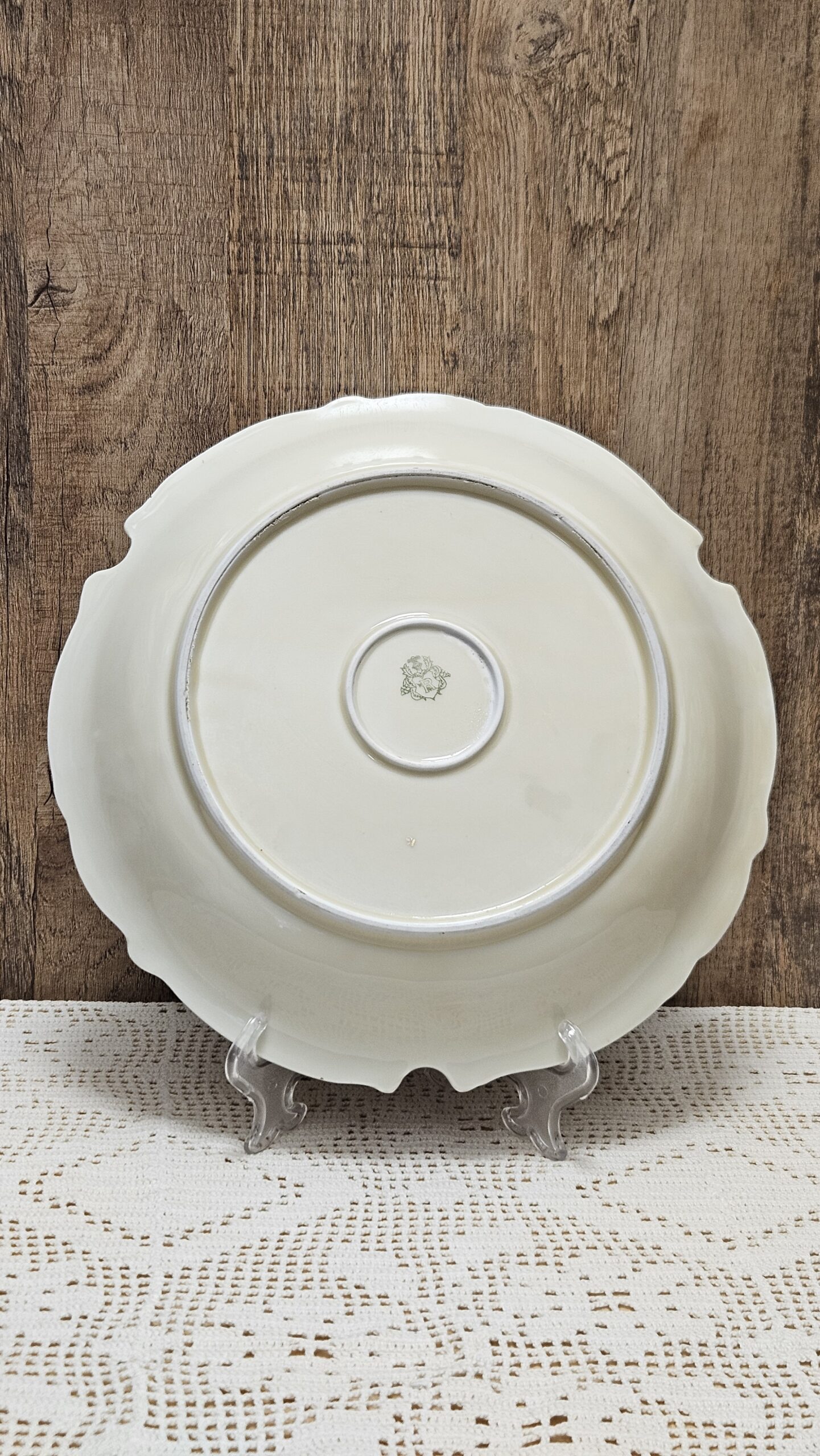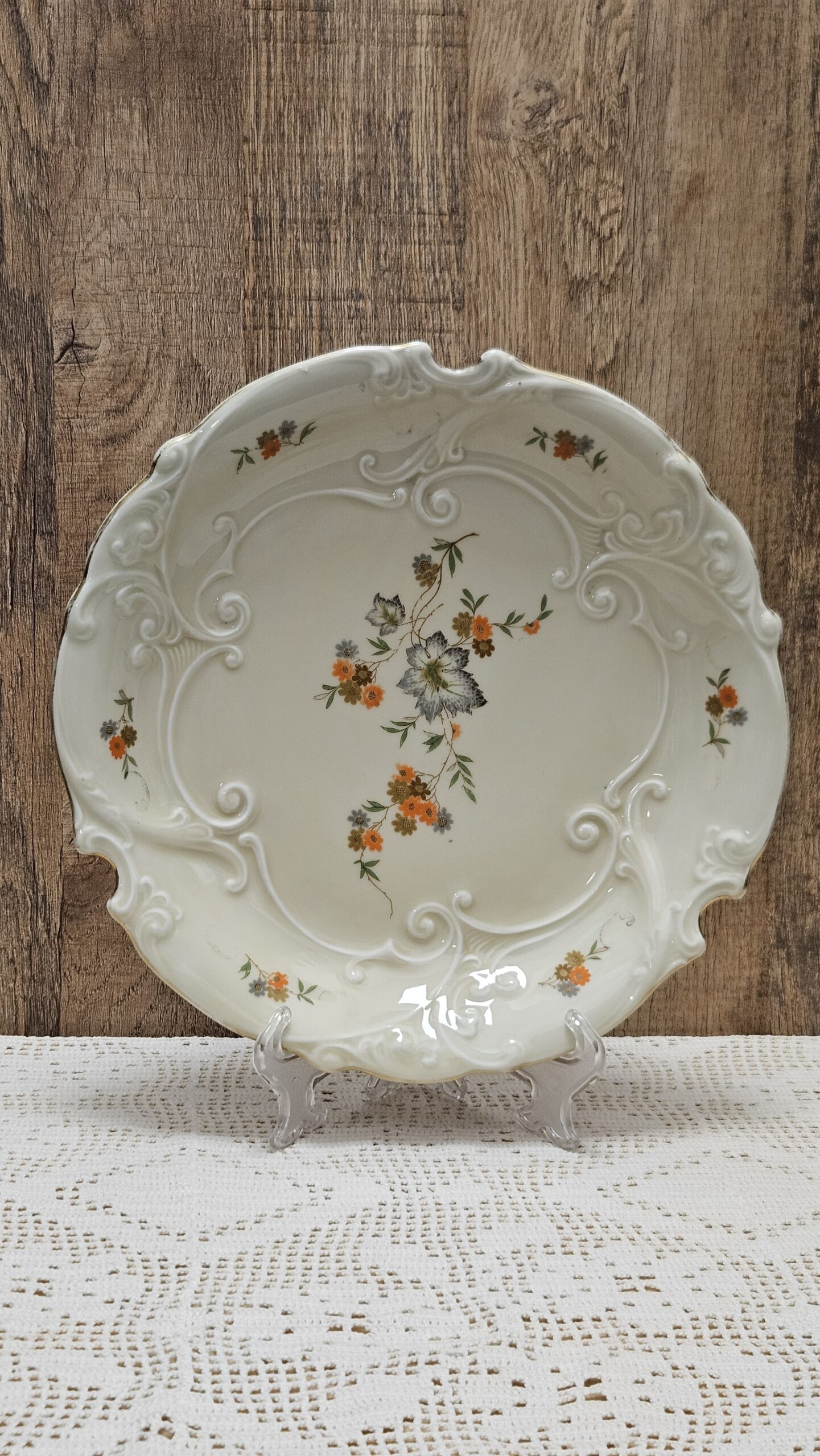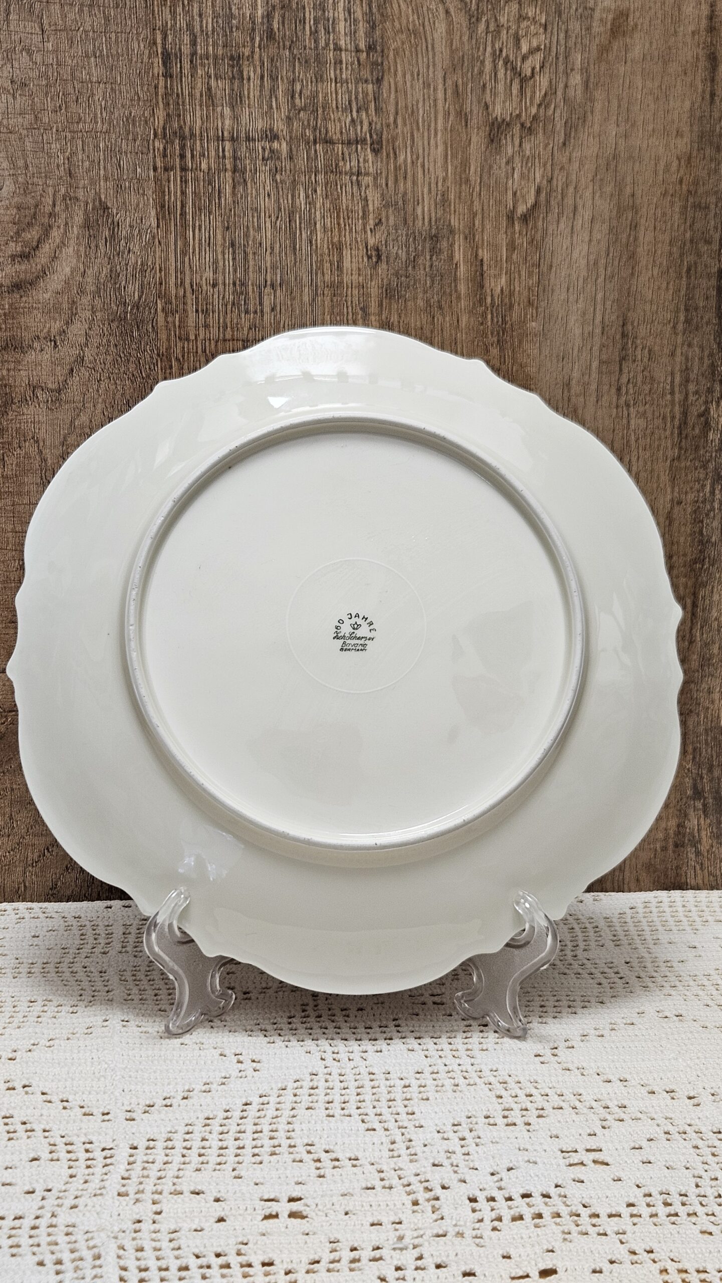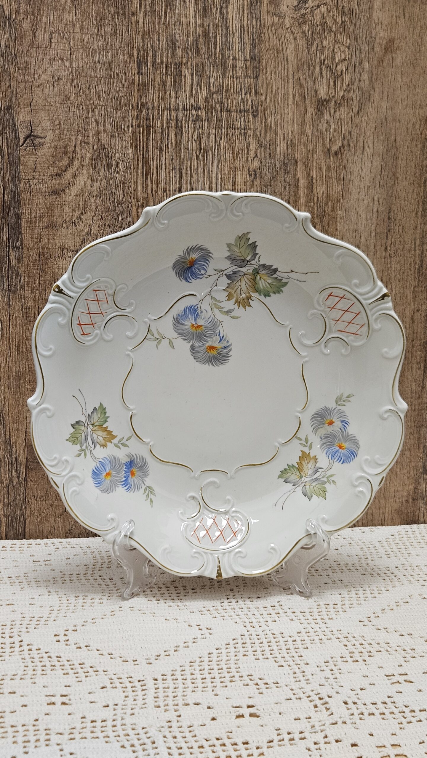 Niemiecka wytwórnia porcelany Roschutz, sygnatura z okresu lat 1906-1968. Kolor porcelany kość słoniowa (niestety zdjęcie nie oddaje rzeczywistego koloru) . Zdobiny techniką kalkomanii, reliefami oraz złotym paskiem na rancie talerz który uległ przetarciom jak i pozostałe złocenia co wcale nie umniejsza urodzie. Średnica talerza 30 cm, wysokość 4 cm. Cena 120 zł.