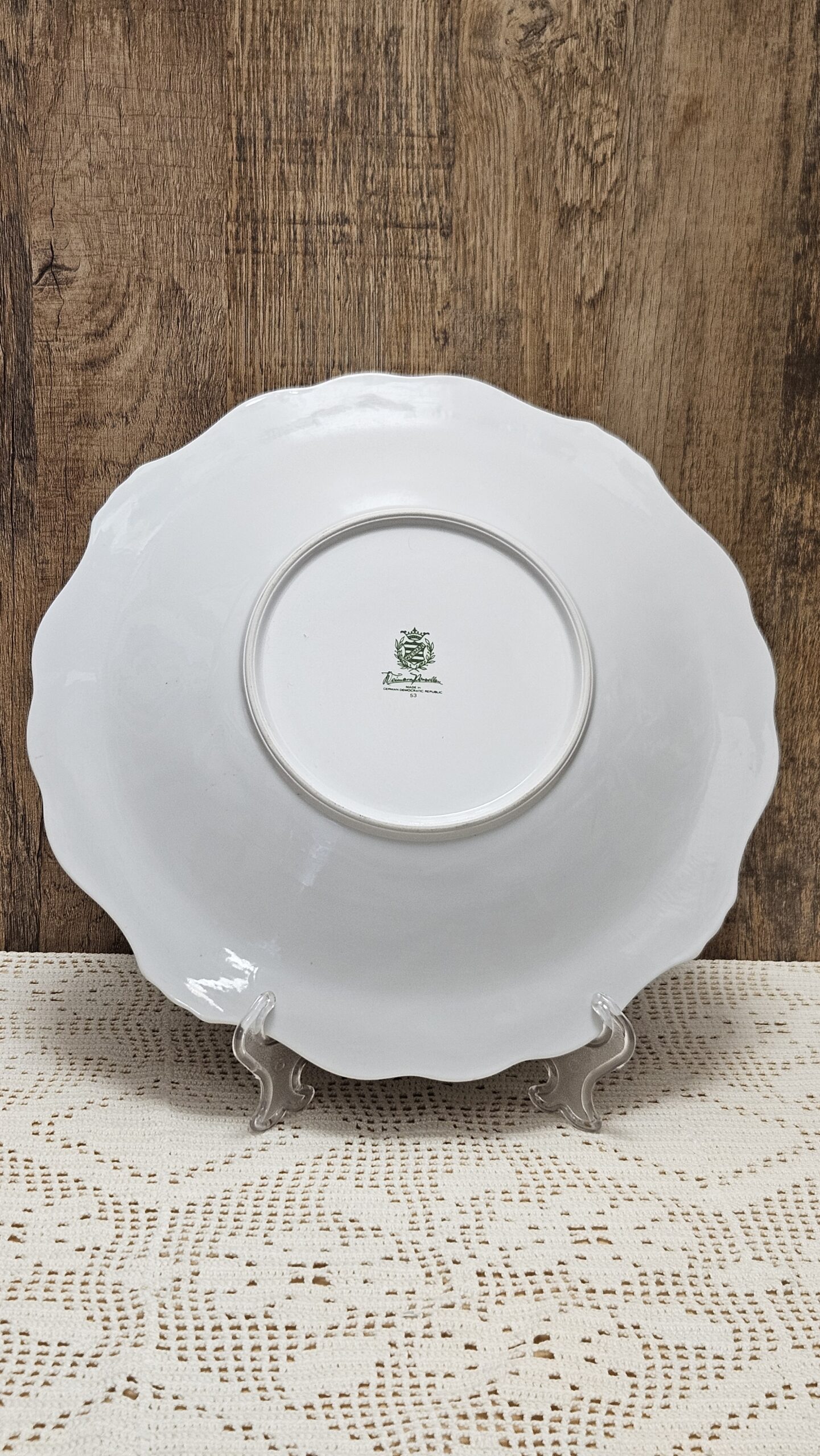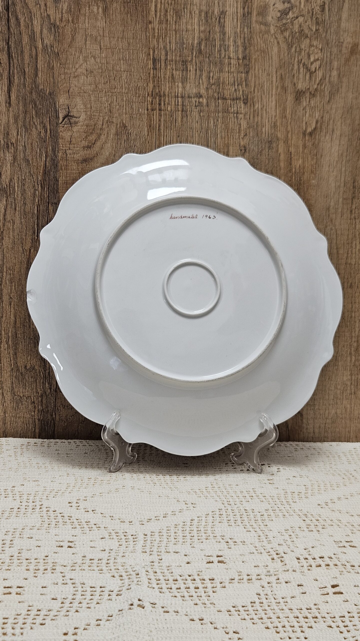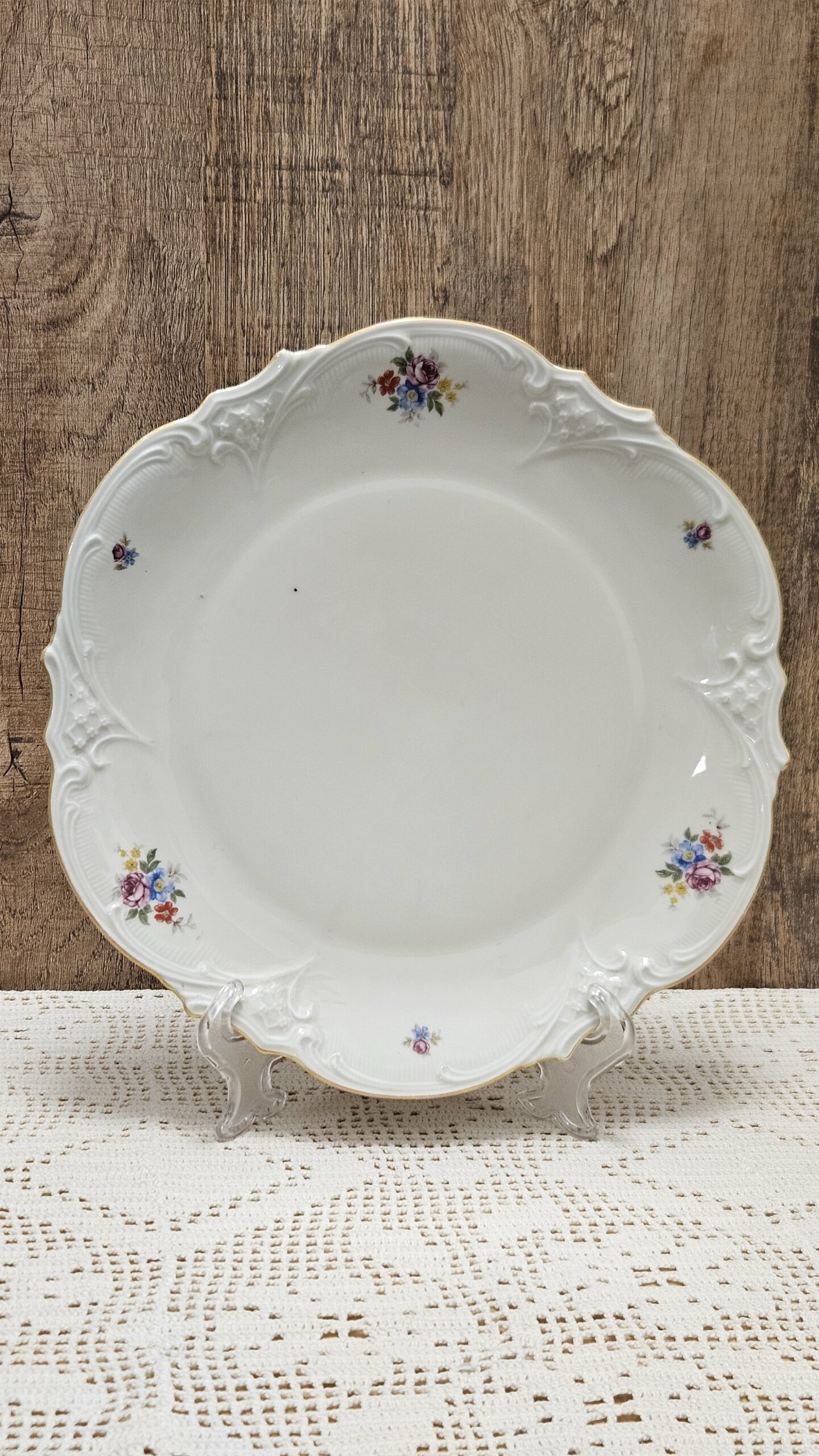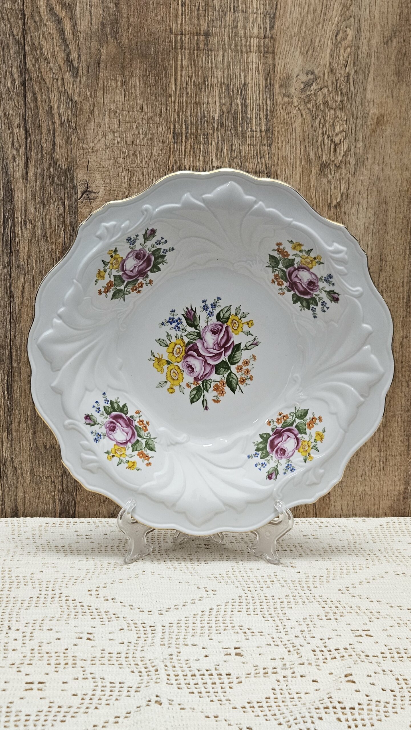 Niemiecka wytwórnia porcelany Roschutz, sygnatura z okresu lat 1906-1968. Kolor porcelany kość słoniowa (niestety zdjęcie nie oddaje rzeczywistego koloru) . Zdobiny techniką kalkomanii, reliefami oraz złotym paskiem na rancie talerz który uległ przetarciom jak i pozostałe złocenia co wcale nie umniejsza urodzie. Średnica talerza 30 cm, wysokość 4 cm. Cena 120 zł.