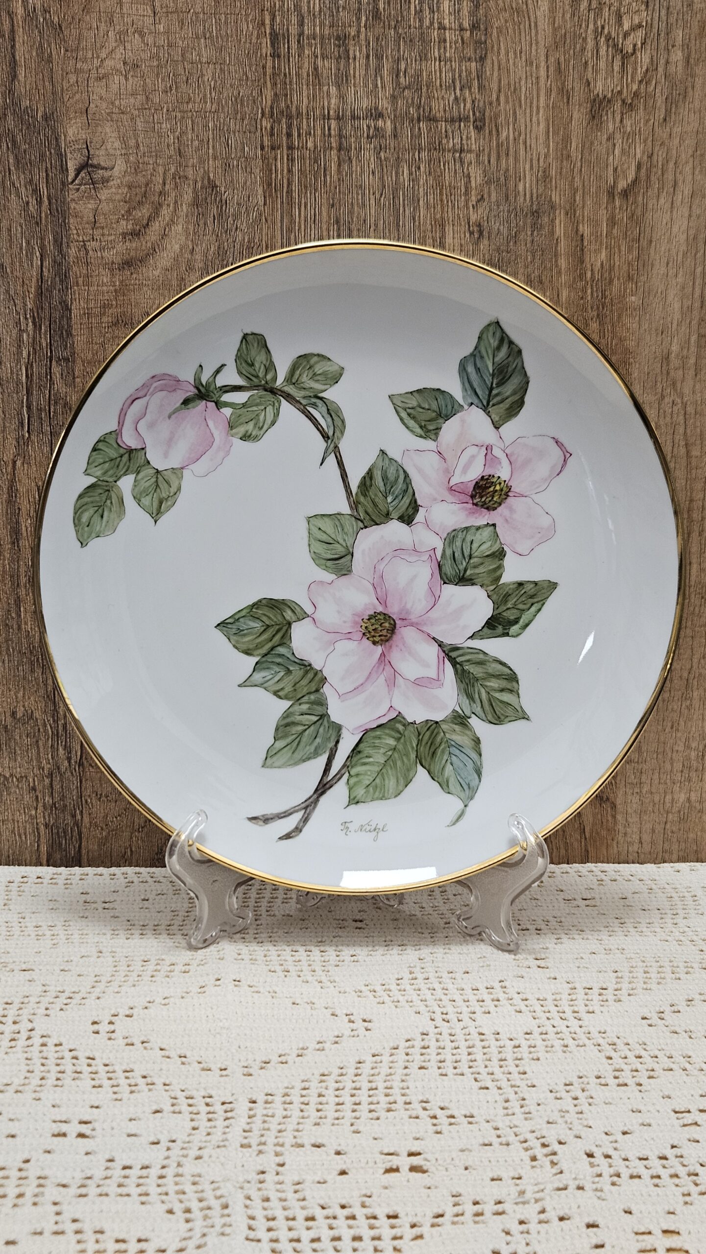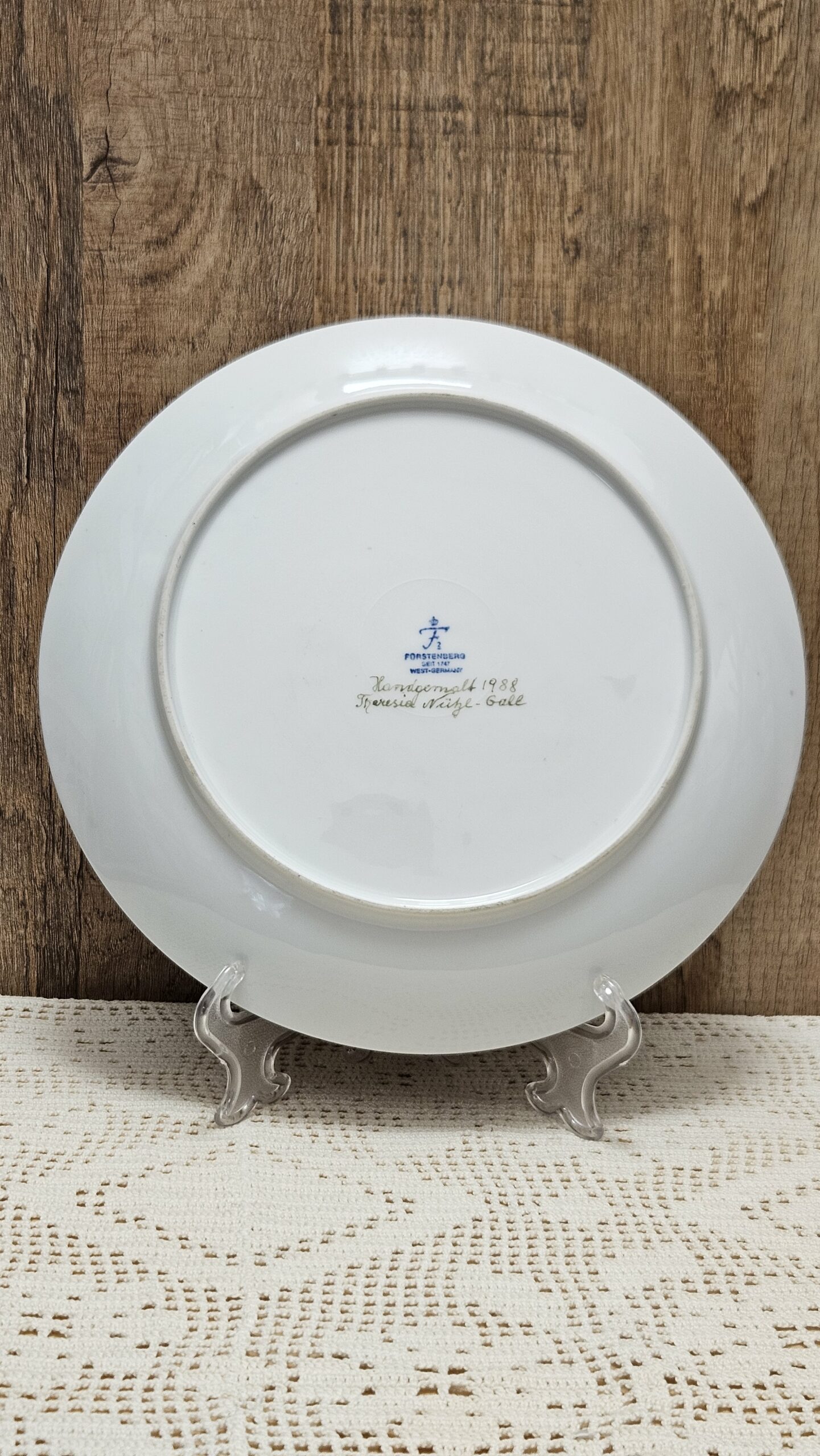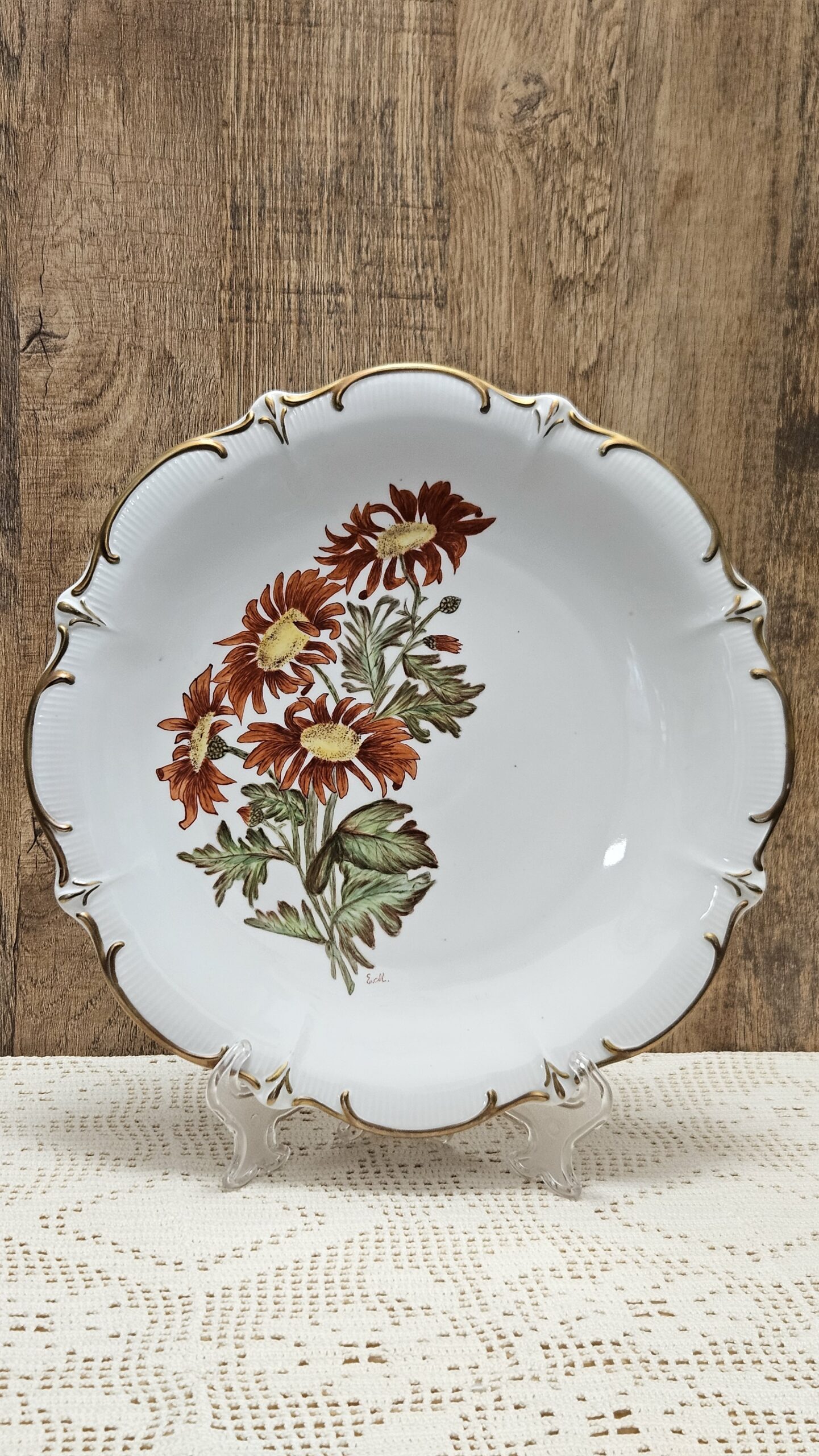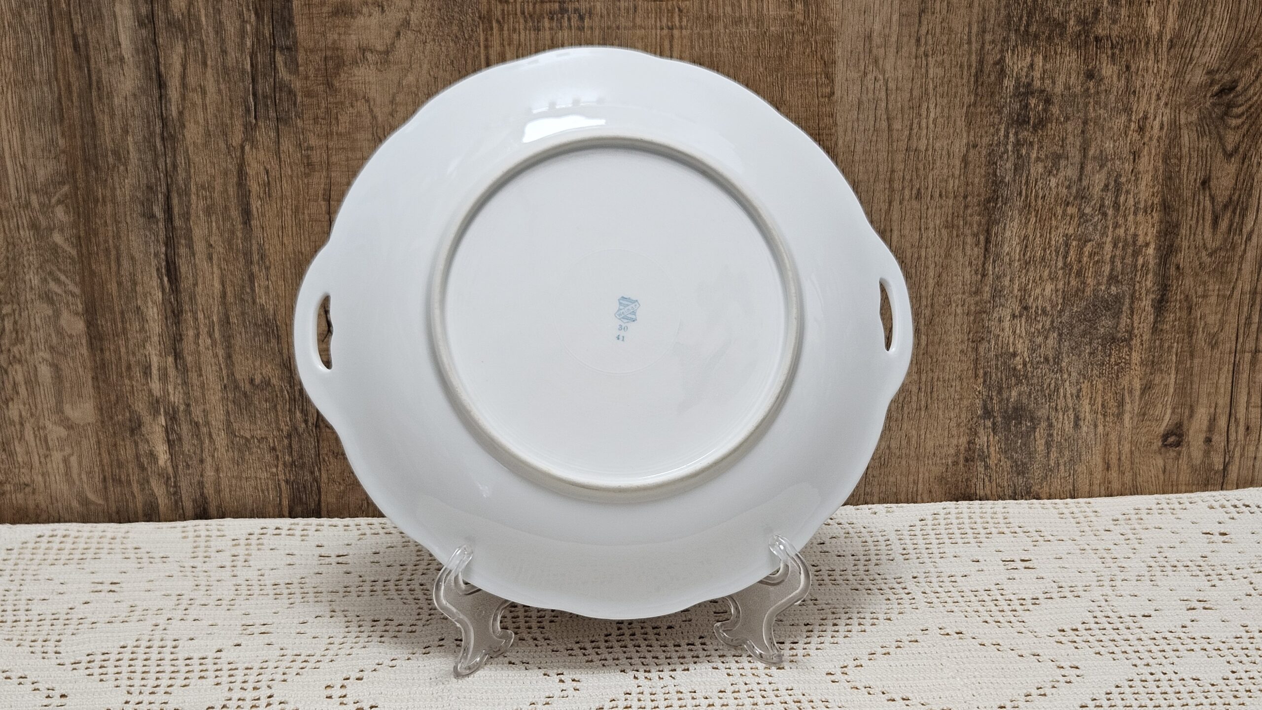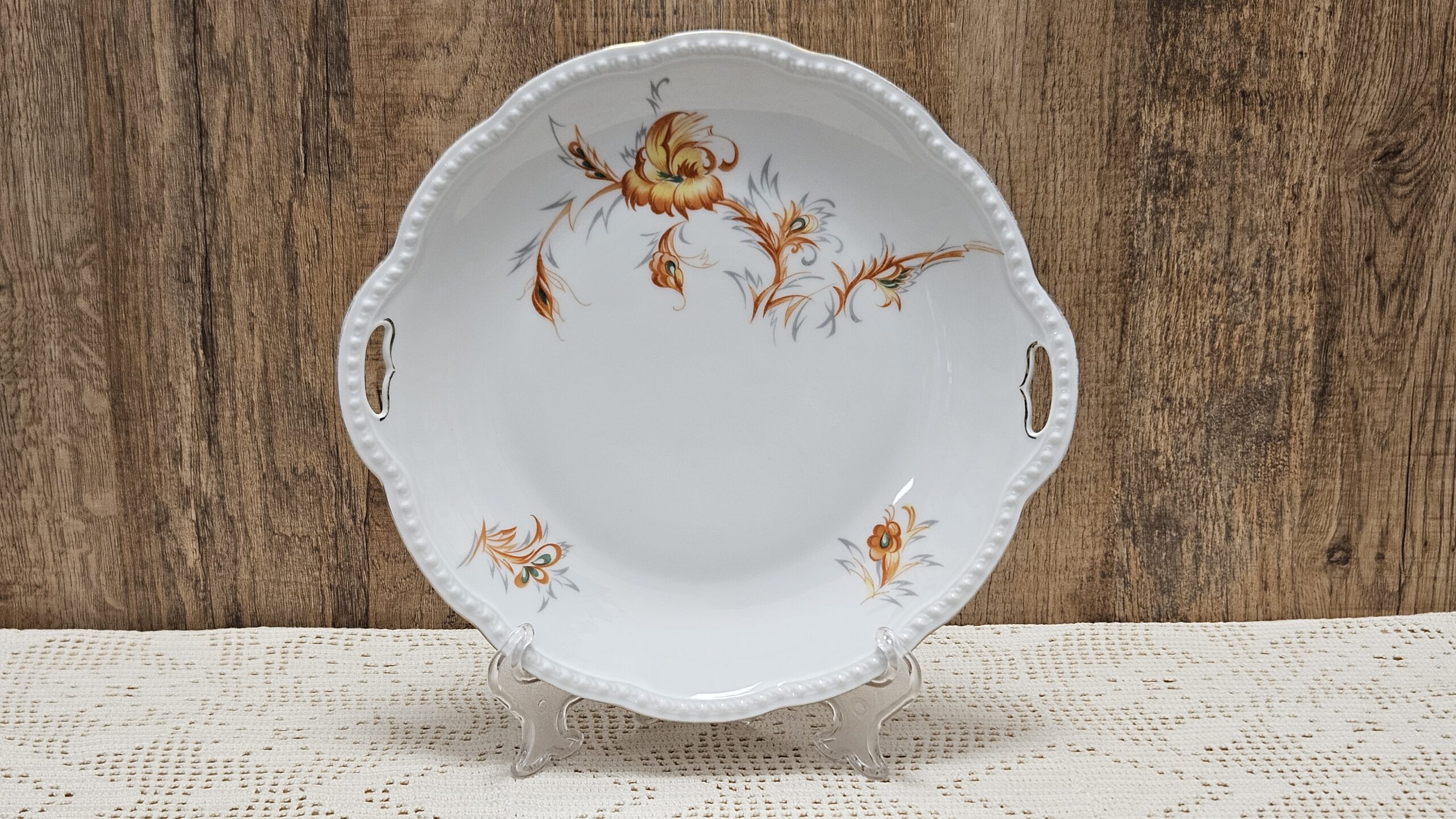 Niemiecka wytwórnia porcelany Roschutz, sygnatura z okresu lat 1906-1968. Kolor porcelany kość słoniowa (niestety zdjęcie nie oddaje rzeczywistego koloru) . Zdobiny techniką kalkomanii, reliefami oraz złotym paskiem na rancie talerz który uległ przetarciom jak i pozostałe złocenia co wcale nie umniejsza urodzie. Średnica talerza 30 cm, wysokość 4 cm. Cena 120 zł.