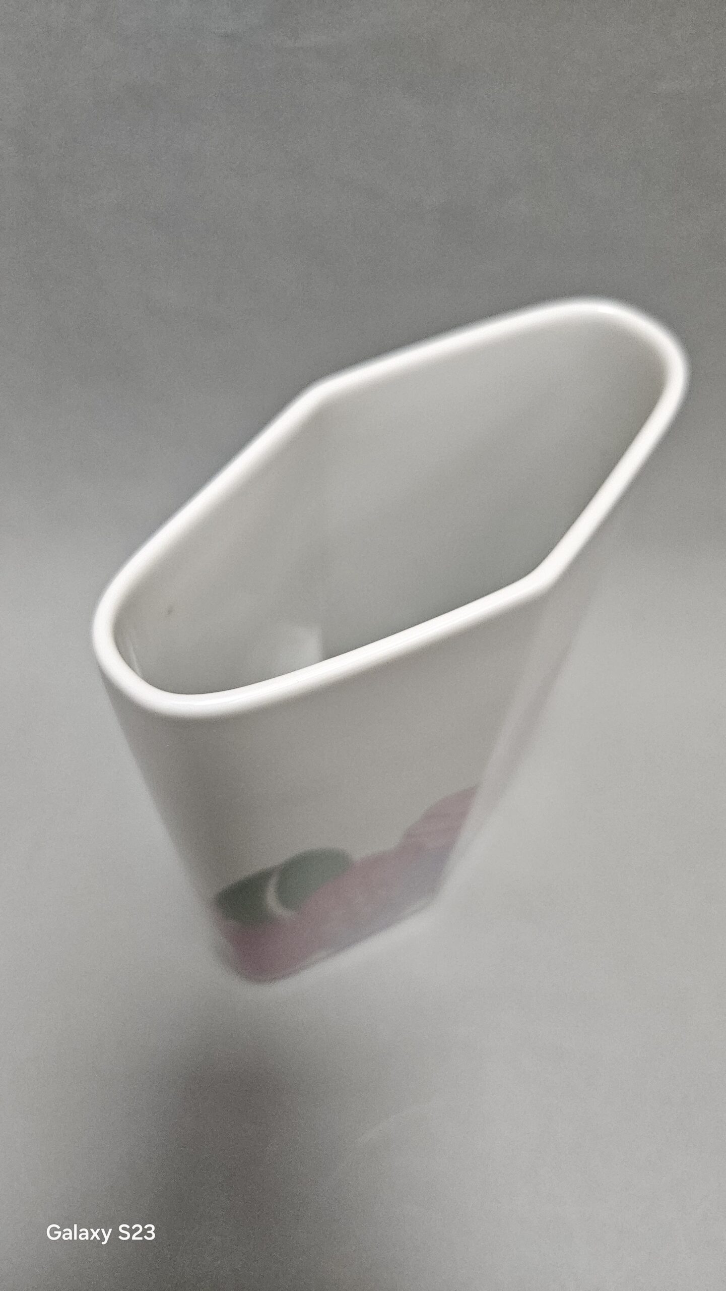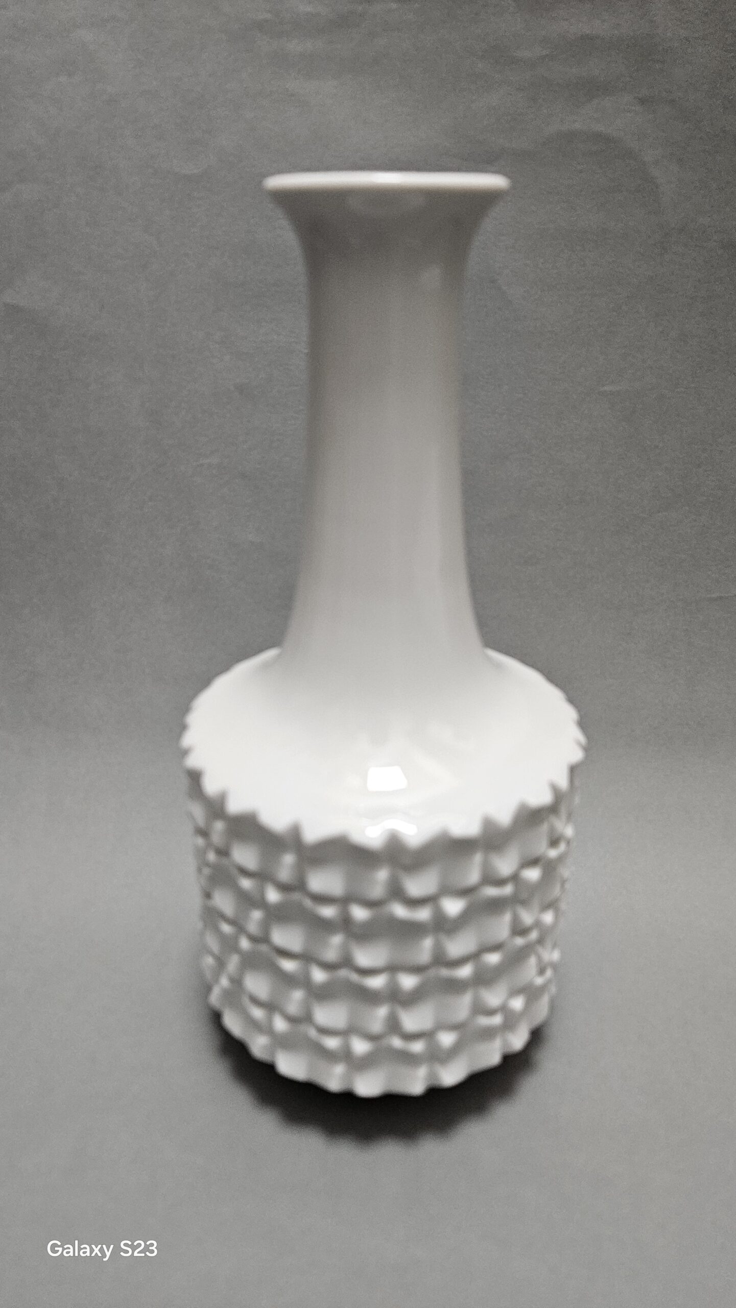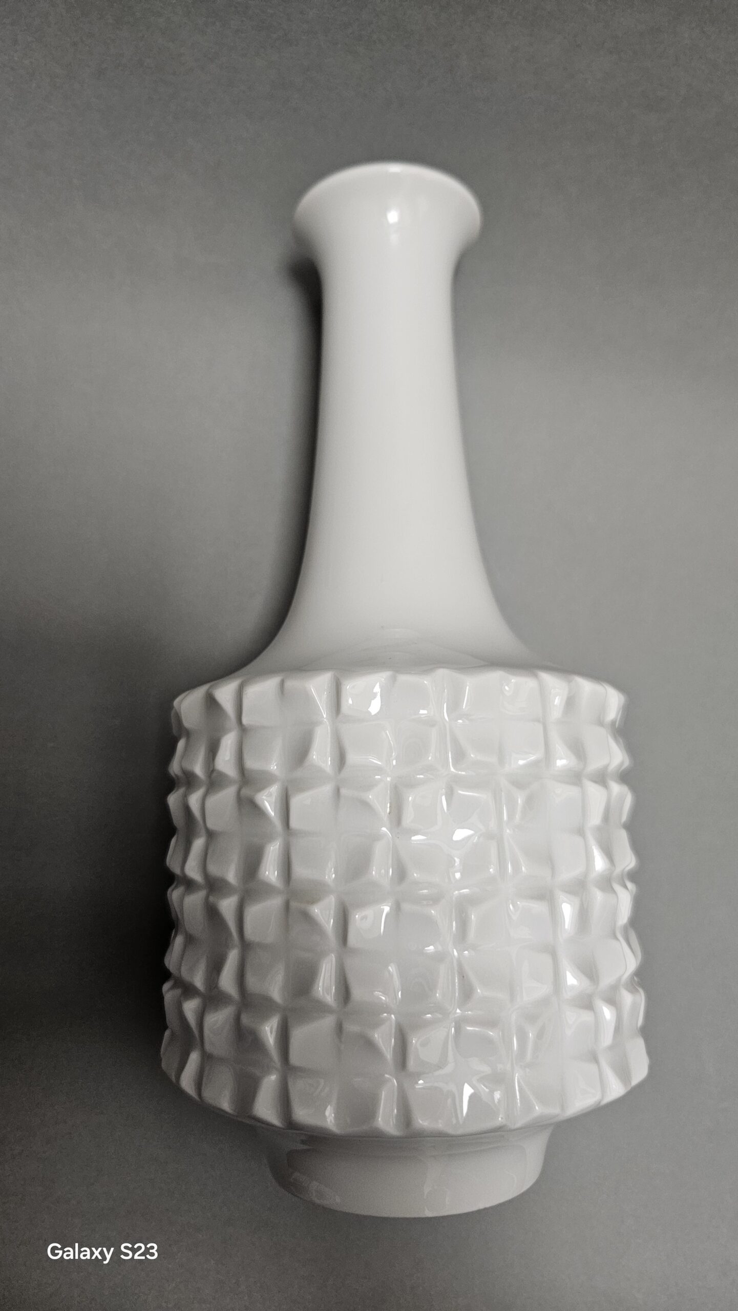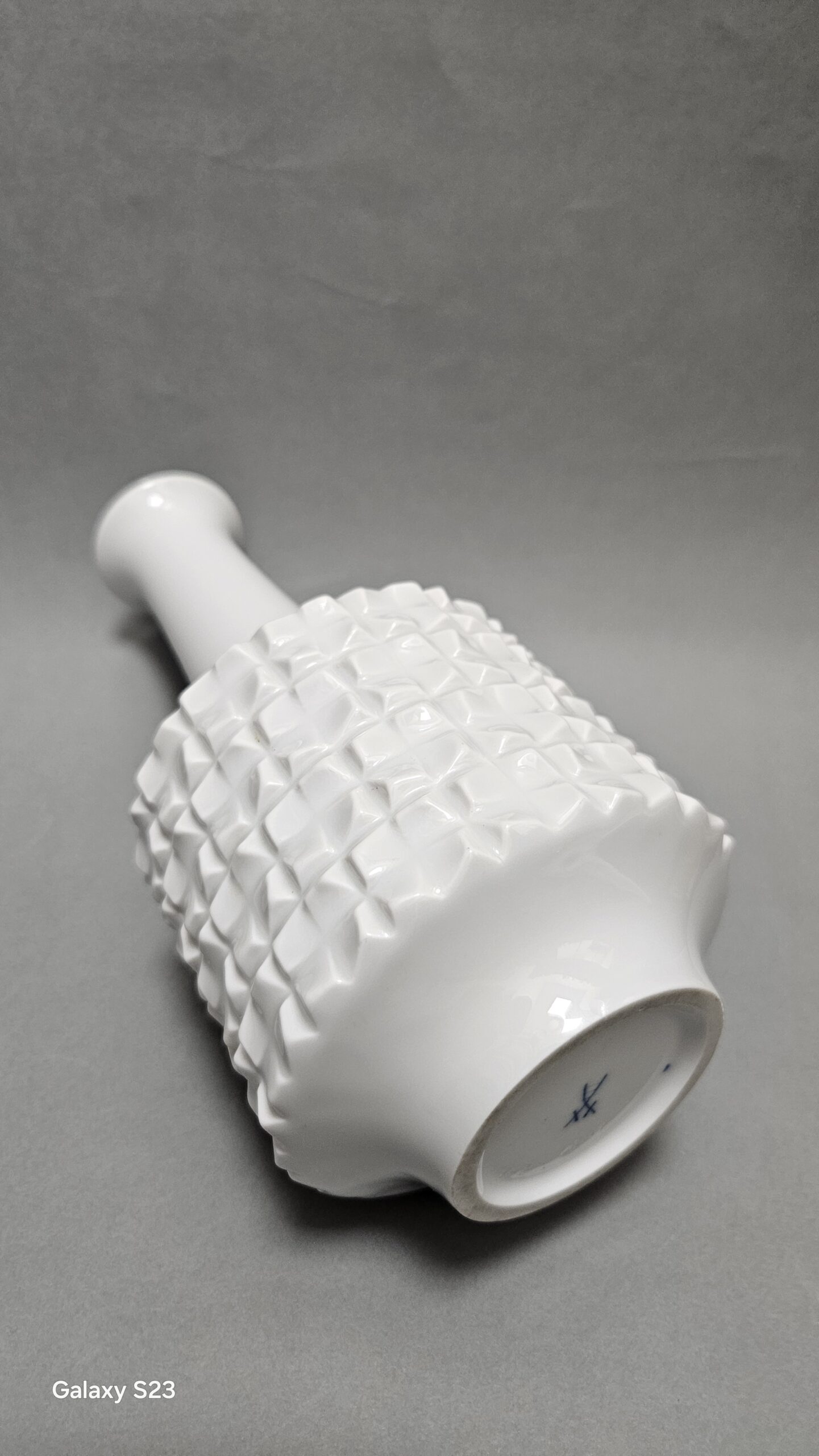 Porcelanowy wazon znanej wytwórni porcelany Miśnia, zaprojektowany w latach 60-tych przez Ludwika Zepnera. Biała porcelana z pięknym połyskiem. Na spodzie sygnaturka Miśni, szable, na nich wycisk z trzech kresek, na obrzeżu kropka granatowa. Wycisk 14 Z i znaki trudne do zdefiniowania , cyfra 29, nad szablami słabo widoczny wycisk szabli i znaki trudne do zidentyfikowania. Na podstawie ledwo widoczny odprysk. Wysokość wazonu 24 cm, średnica otworu 5 cm, średnica podstawy 6 cm, szerokość 11 cm. Cena wazonu 250 złotych.