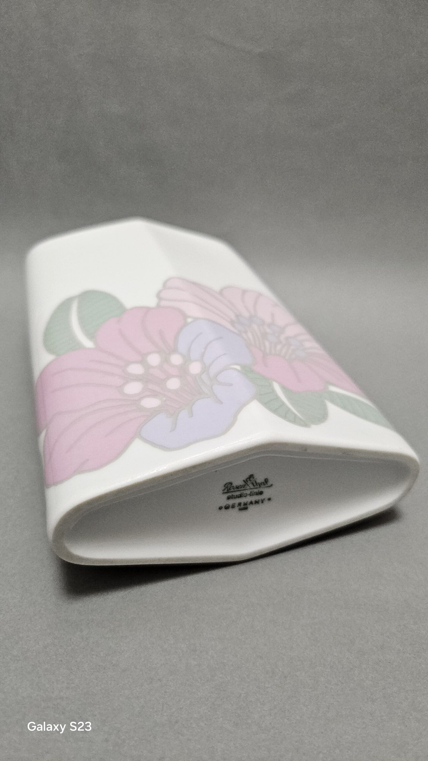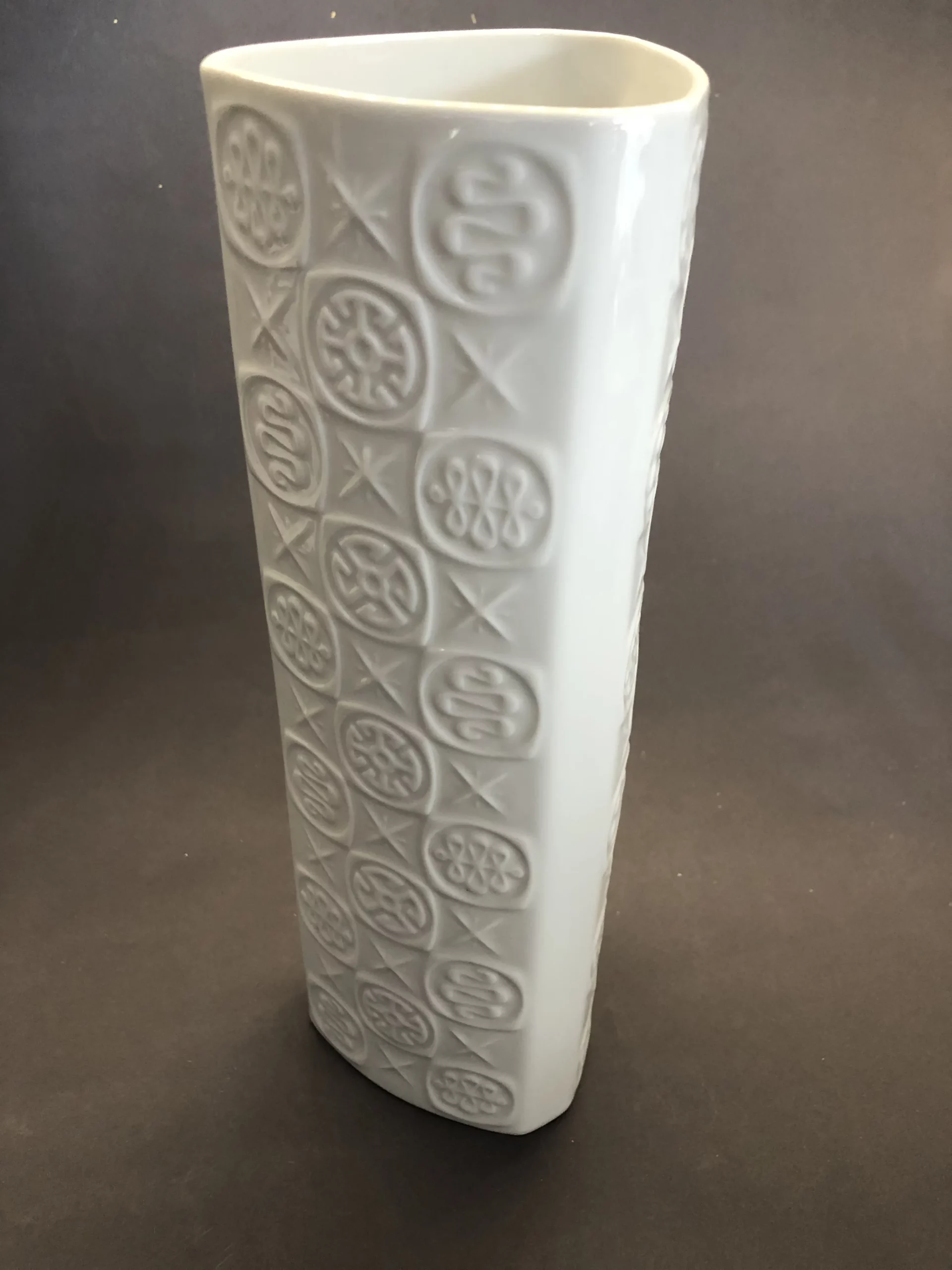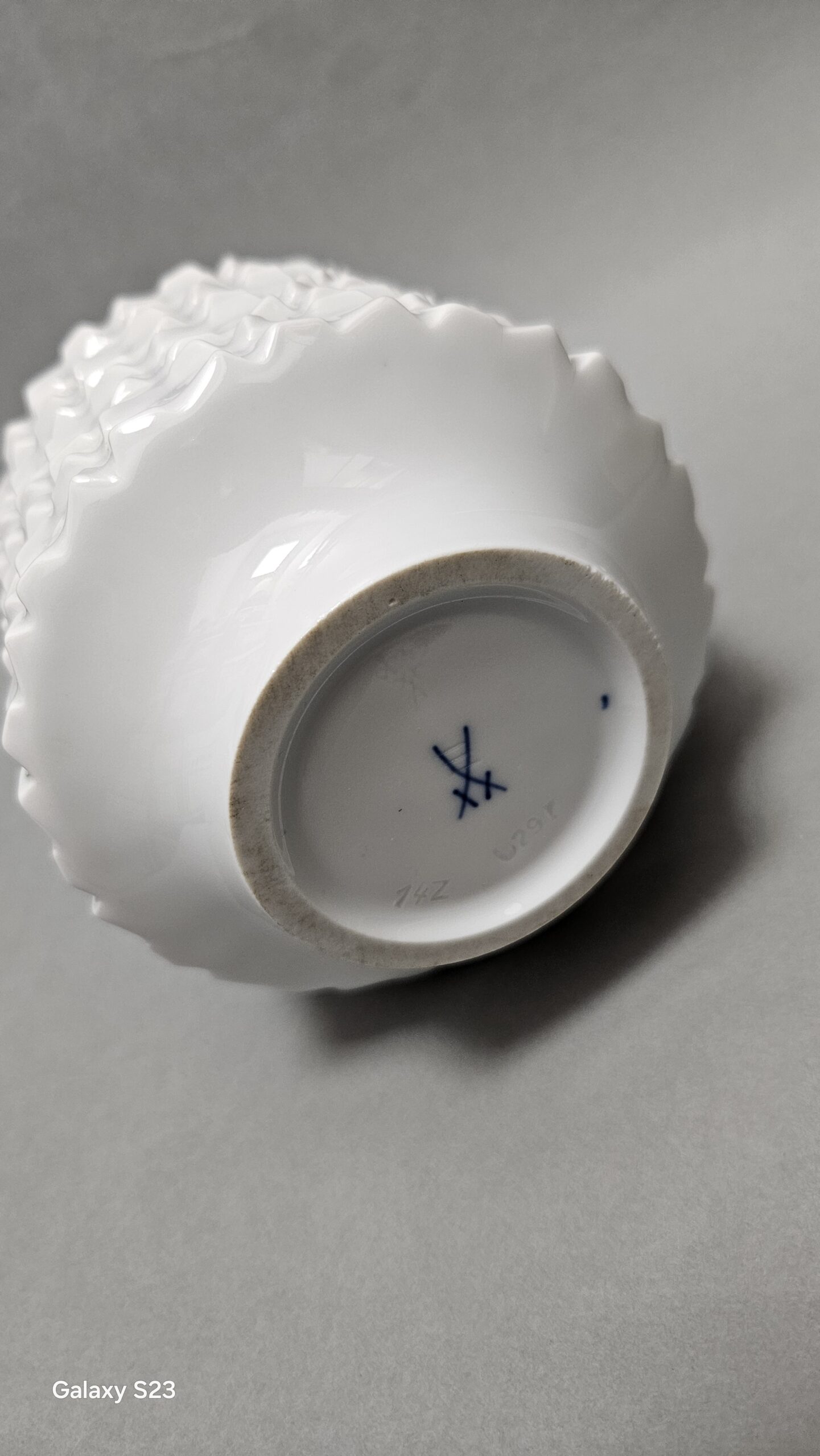 Porcelanowy wazon znanej wytwórni porcelany Miśnia, zaprojektowany w latach 60-tych przez Ludwika Zepnera. Biała porcelana z pięknym połyskiem. Na spodzie sygnaturka Miśni, szable, na nich wycisk z trzech kresek, na obrzeżu kropka granatowa. Wycisk 14 Z i znaki trudne do zdefiniowania , cyfra 29, nad szablami słabo widoczny wycisk szabli i znaki trudne do zidentyfikowania. Na podstawie ledwo widoczny odprysk. Wysokość wazonu 24 cm, średnica otworu 5 cm, średnica podstawy 6 cm, szerokość 11 cm. Cena wazonu 250 złotych.