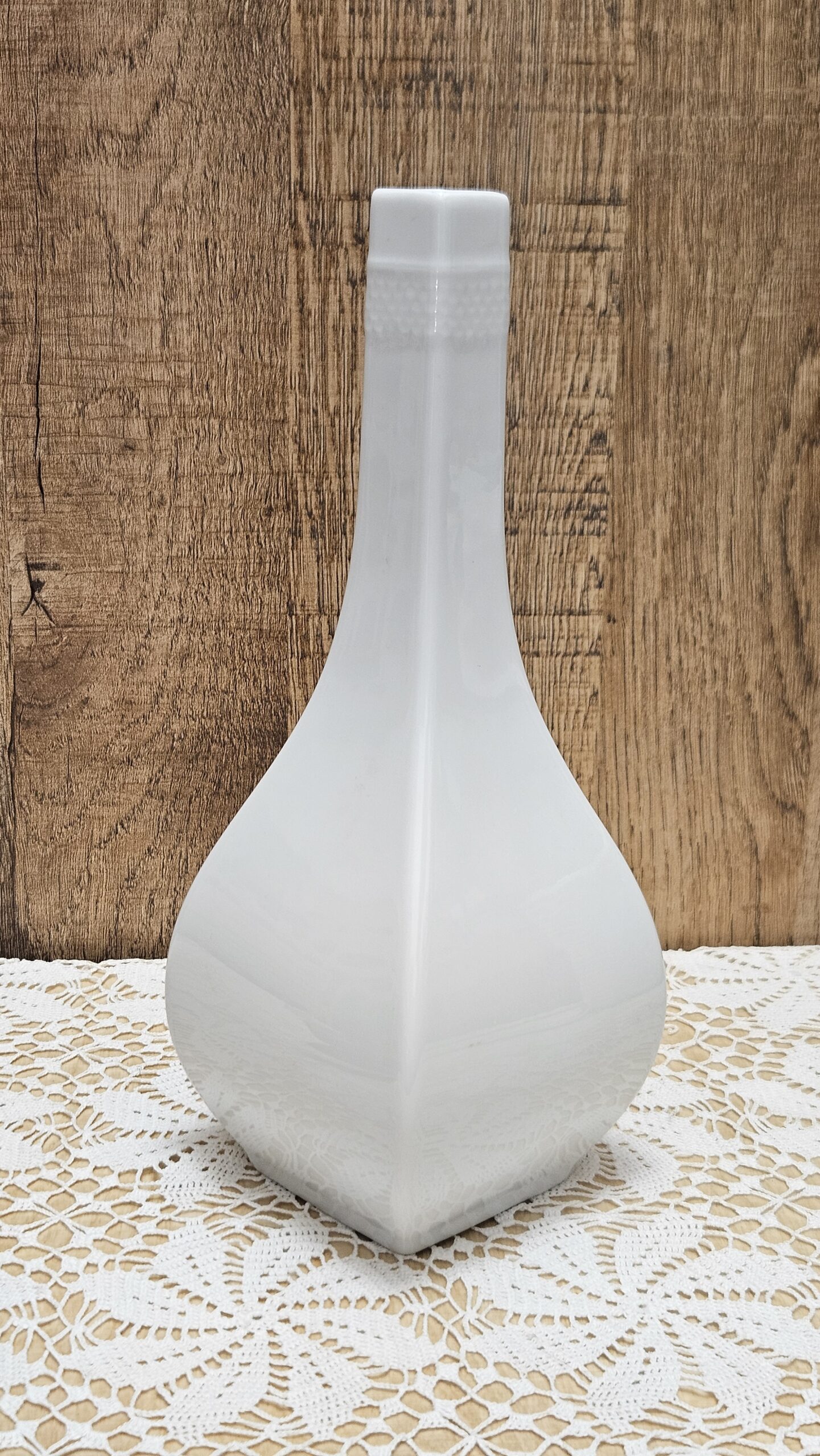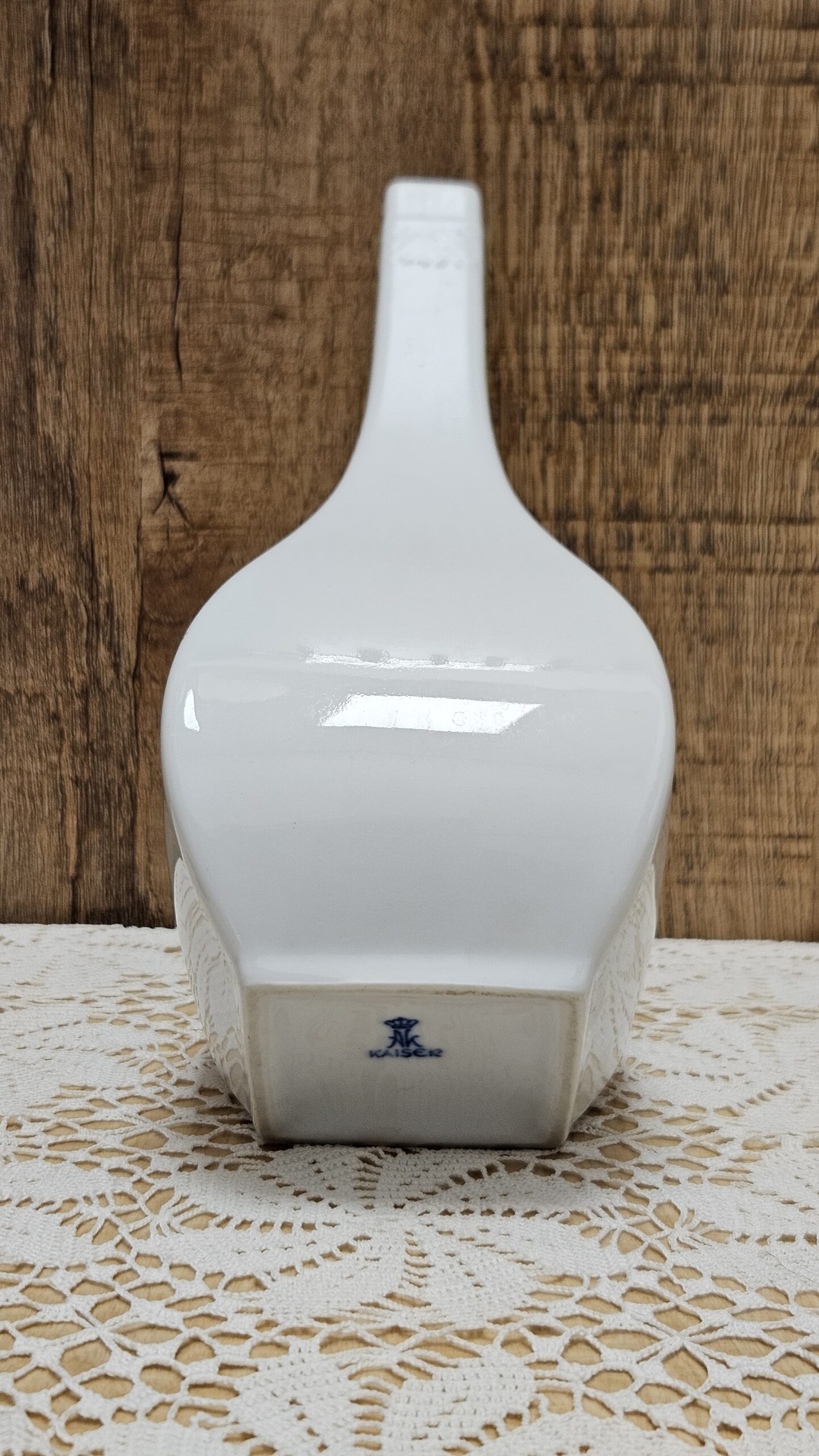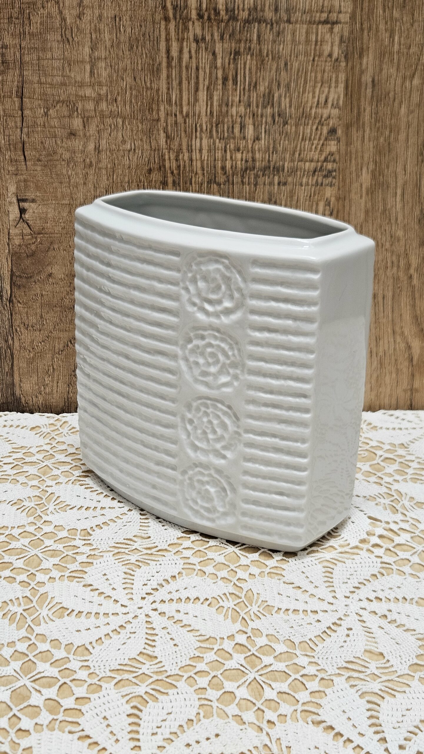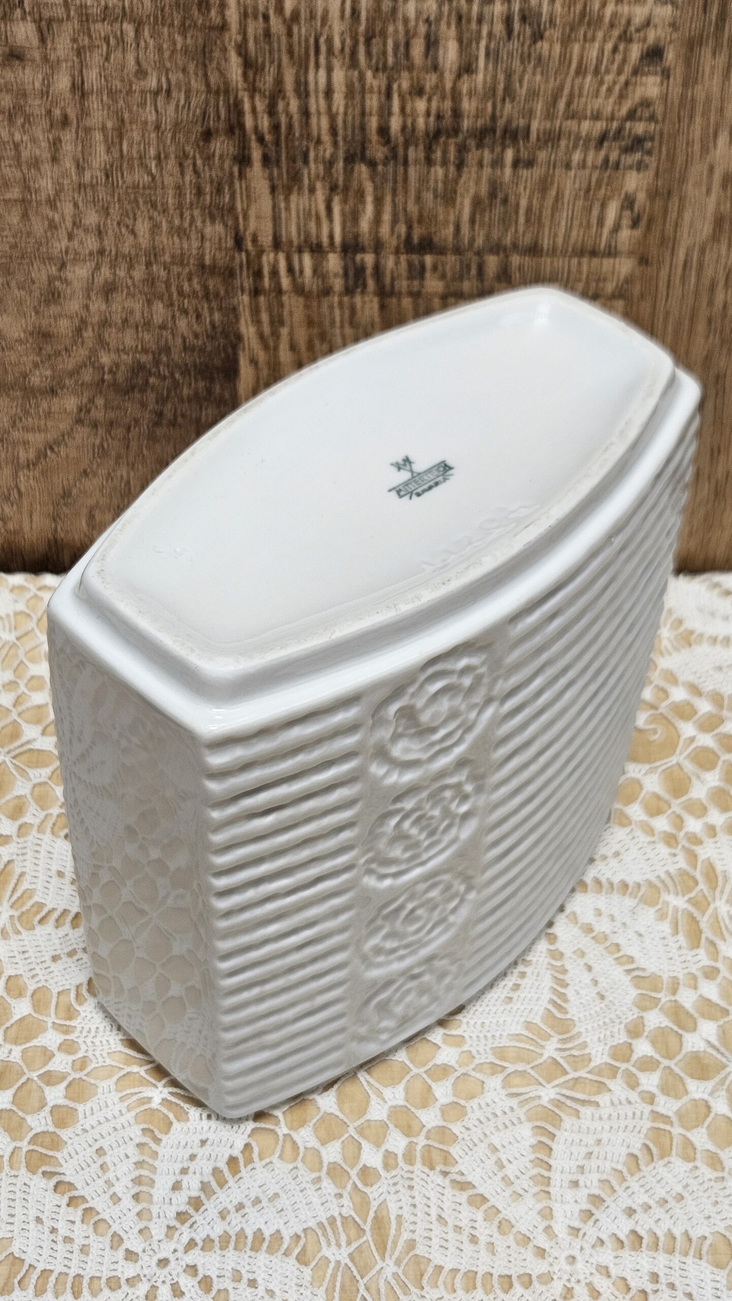 Niemiecka wytwórnia porcelany Mitterteich z okresu lat 1960 -1980. Biała porcelana z przodu i tyłu ryflowana, boki gładkie. Wysokość 15 cm, długość 14 cm, szerokość po środku 8 cm, szerokość p bokach 4,5 cm. Otwór o długości 12,5 cm, środkowa część 6 cm. Stan bardzo dobry. Cena 70 zł.