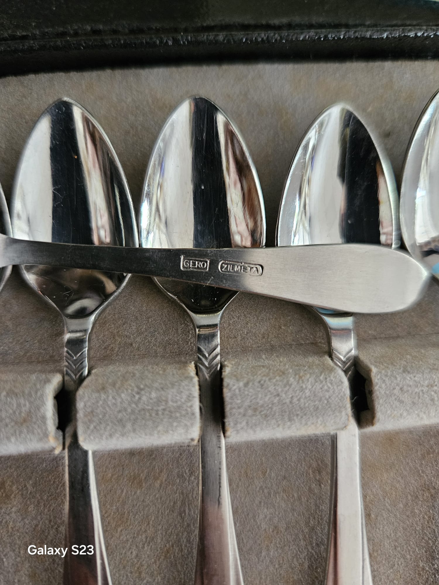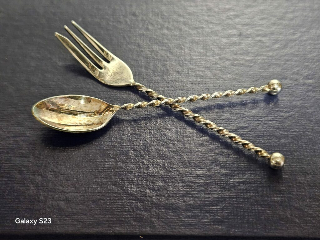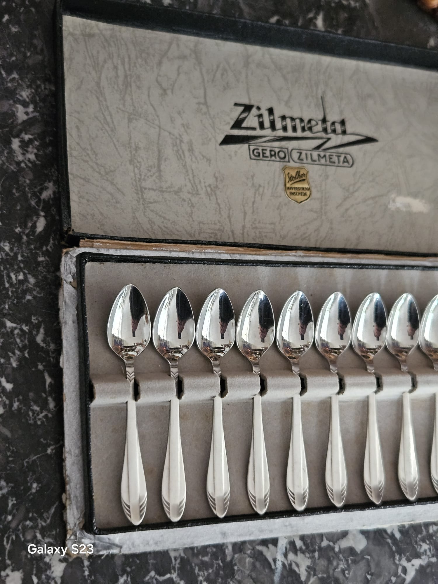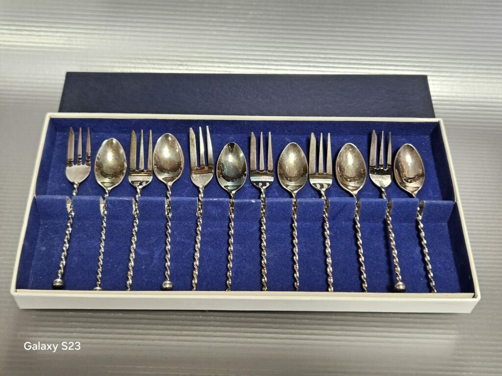 Komplet platerowanych sztućców do deseru zakończone kulkami. Sześć łyżeczek 11 cm długości, średnica łyżeczki 3,5 cm x 2 cm, głęboka 0,5 cm. Sześć widelczyków 12 cm długości, średnica 4 cm x 1,5 cm. Średnica uchwytu 3 mm, kuli 0,5 cm. Stan zachowania bardzo dobry, brak śladów użytkowania. Pochodzą z Niemiec. Pudełko kartonowe. Cena 120 złotych.