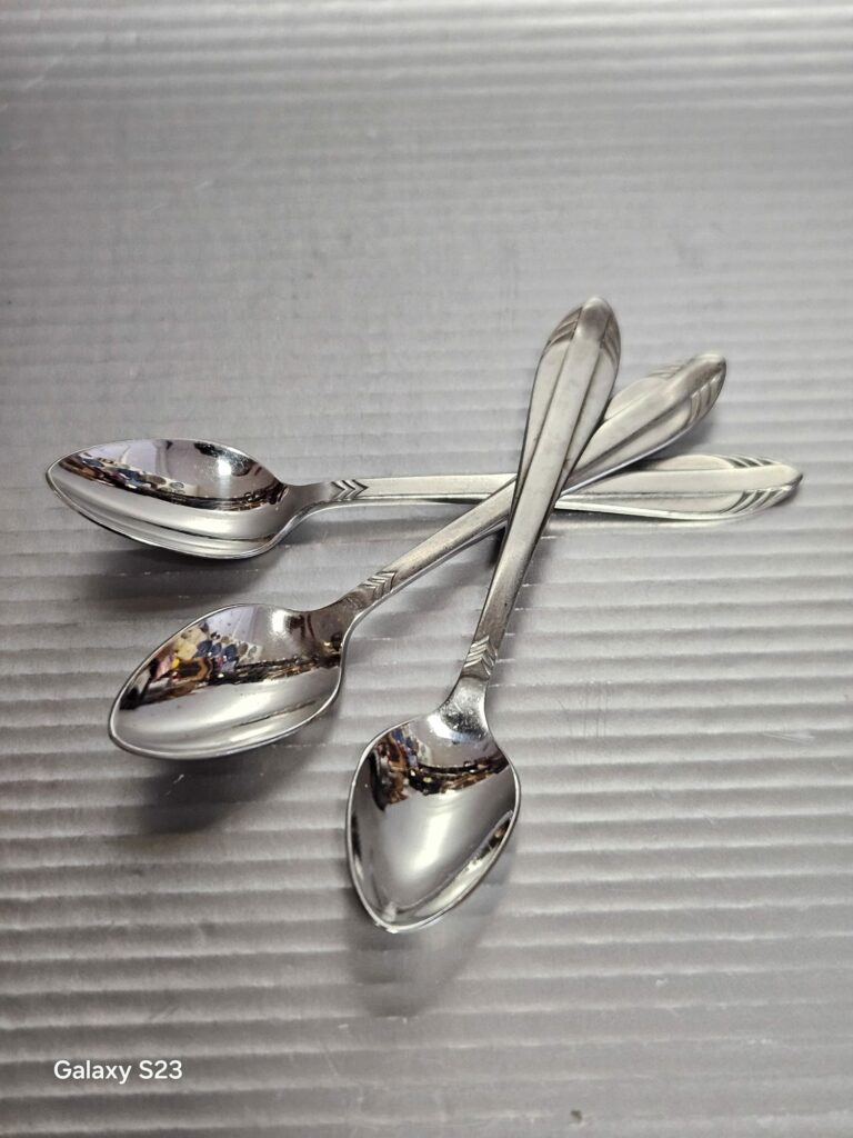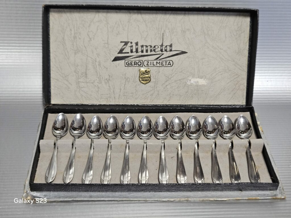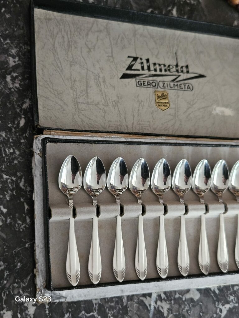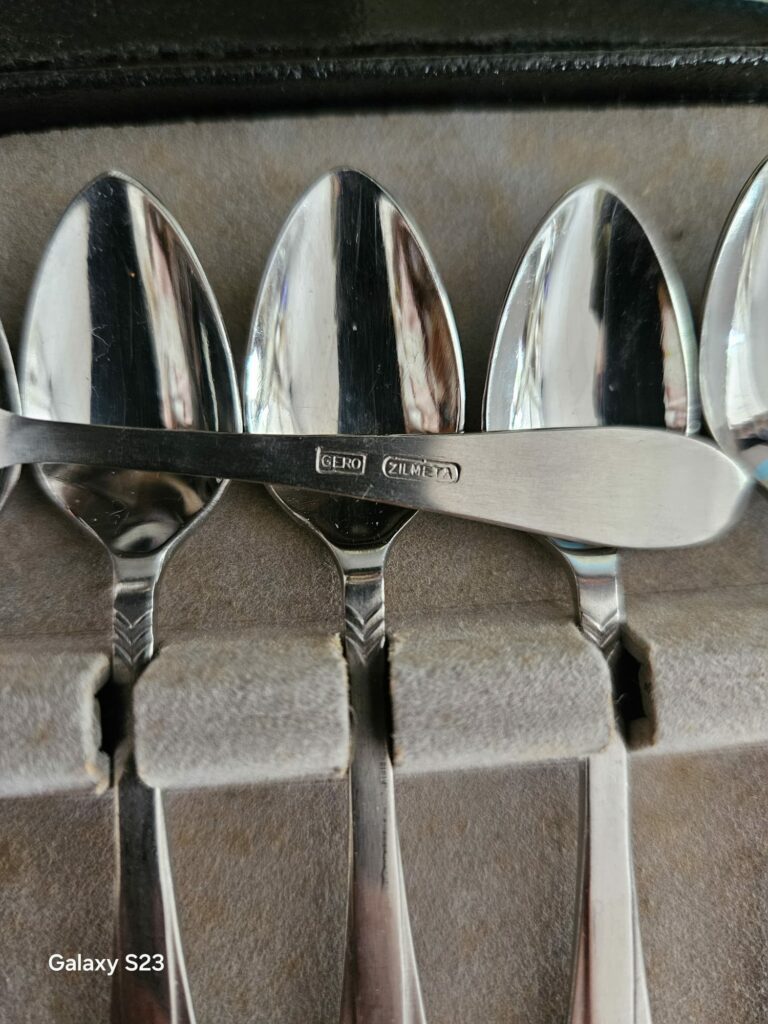 Metalllöffel von Gero Zillmeta. 12er Set in Originalverpackung, der Zustand der Box wie auf den beigefügten Fotos ist nicht der beste. Die Löffel stammen aus den Niederlanden, aus der Zeit 1936-1962. Aus rostfreiem Stahl. Löffellänge 9 cm, Löffelkopf 3 cm x 1,5 cm. Sehr guter Zustand. Preis 90 Zloty.