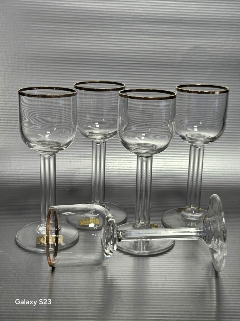 Sechs elegante Likörgläser. Herkunftsland – Deutschland, Marke Noblesse von Rastal. Der goldene Streifen auf dem Glas und der originelle Stiel machen es einzigartig. Leichte Abschürfungen am Gold. Beinmaß; 7 cm hoch, 1,5 cm breit und 7 mm dick. Gesamtabmessungen; Höhe 14 cm, Tassenhöhe 5,5 cm, Durchmesser 5 cm, Fußdurchmesser 6 cm. Preis 120 PLN