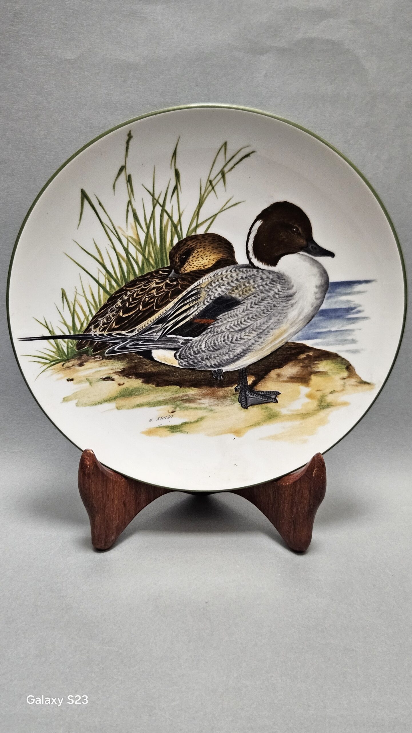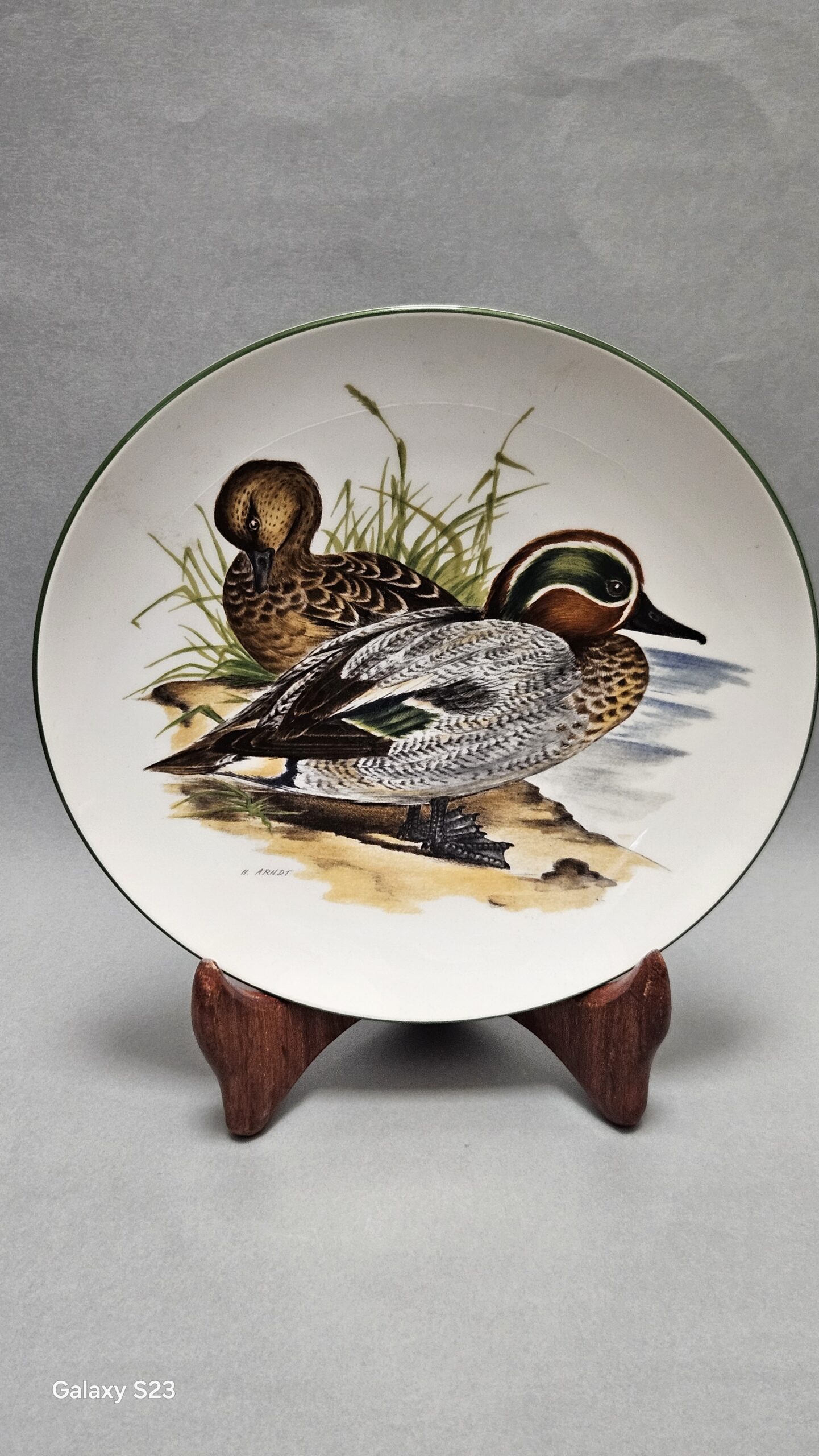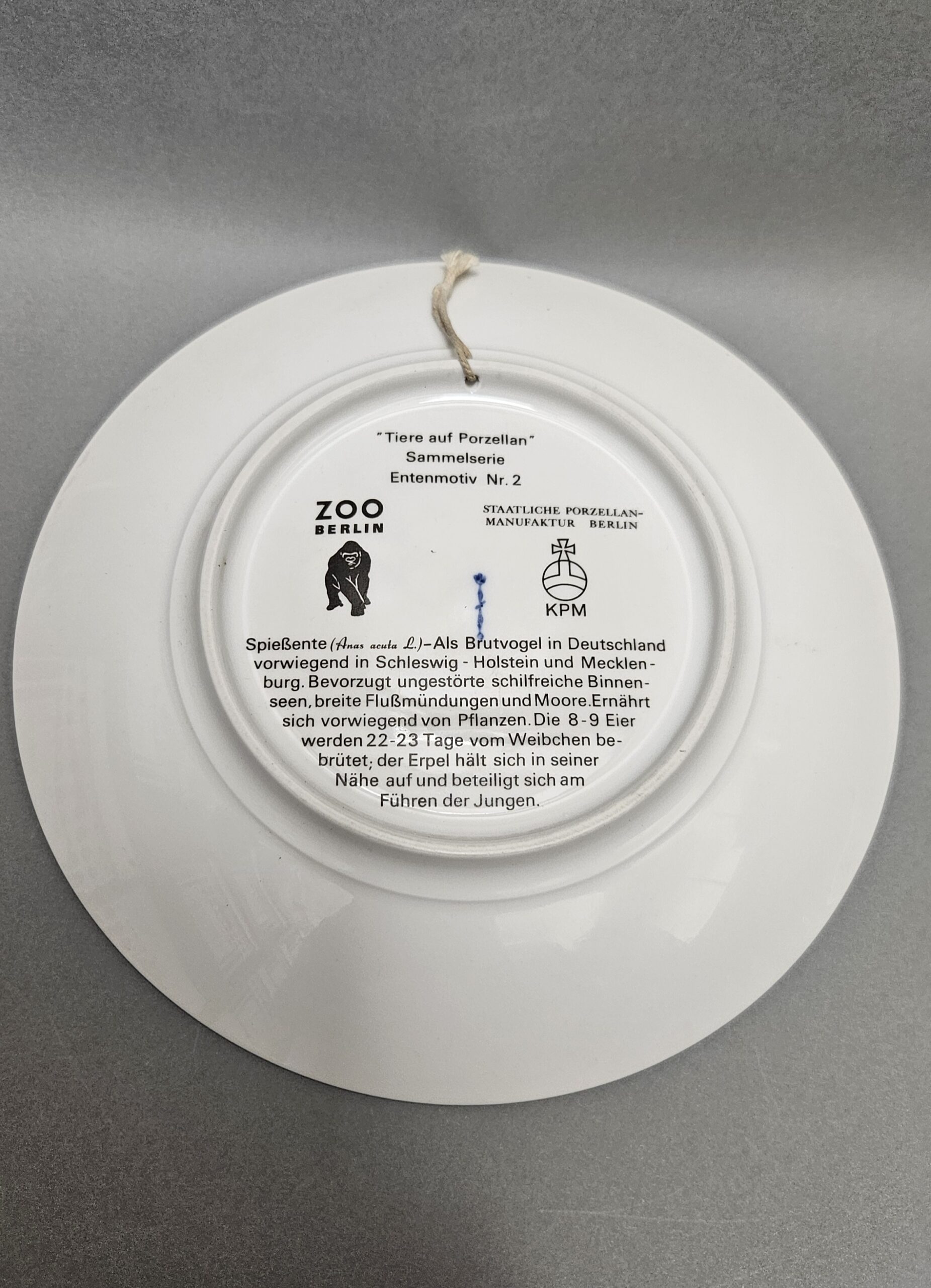 Dieser dekorative Sammlerteller besteht aus hochwertigem Porzellan der renommierten Berliner Porzellanmanufaktur KPN, H. Arndt. Er zeigt „Teal Ducks“ (Cyraneczki) mit einer ausführlichen deutschen Beschreibung auf der Rückseite, wie auf dem Foto zu sehen. Das Dekor besteht aus Abziehbildern, der Tellerrand ist dunkelgrün. Er verfügt über ein Loch zum Aufhängen. Er ist in sehr gutem Zustand. Der Teller hat einen Durchmesser von 19,5 cm und eine Höhe von 2,5 cm. Preis: 130 PLN.