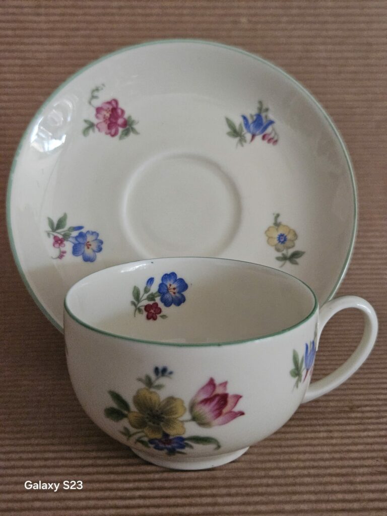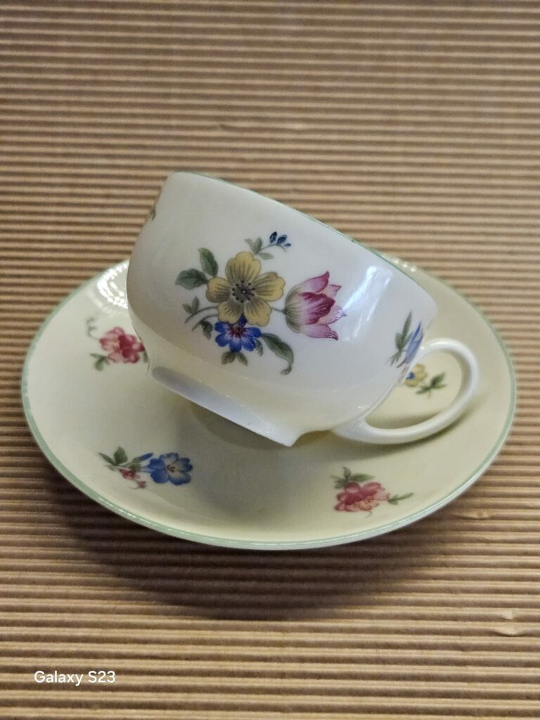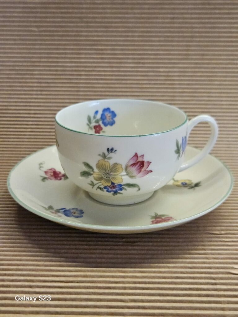 Cremefarbenes Elfenbeinporzellan „Ivory“, dezent mit Blumen im Decal-Verfahren verziert und mit einem grünen Streifen an den Rändern der Tasse, des Henkels und der Untertasse akzentuiert.