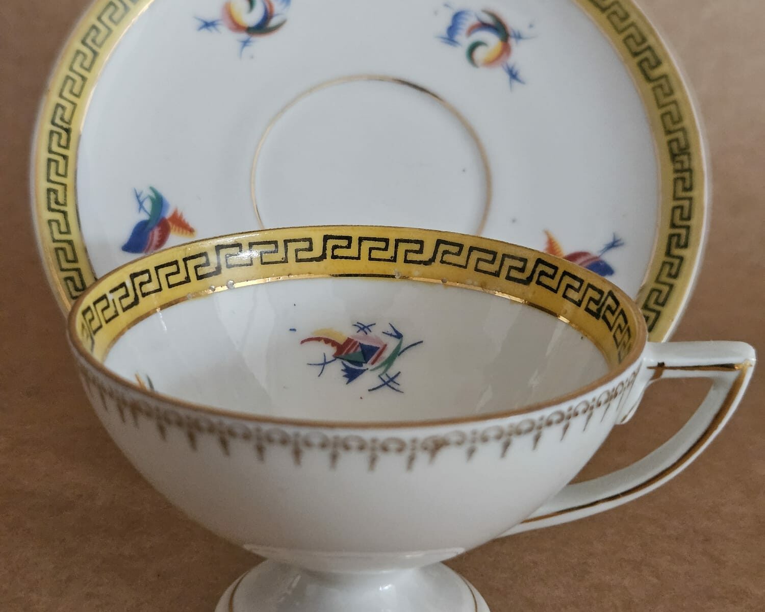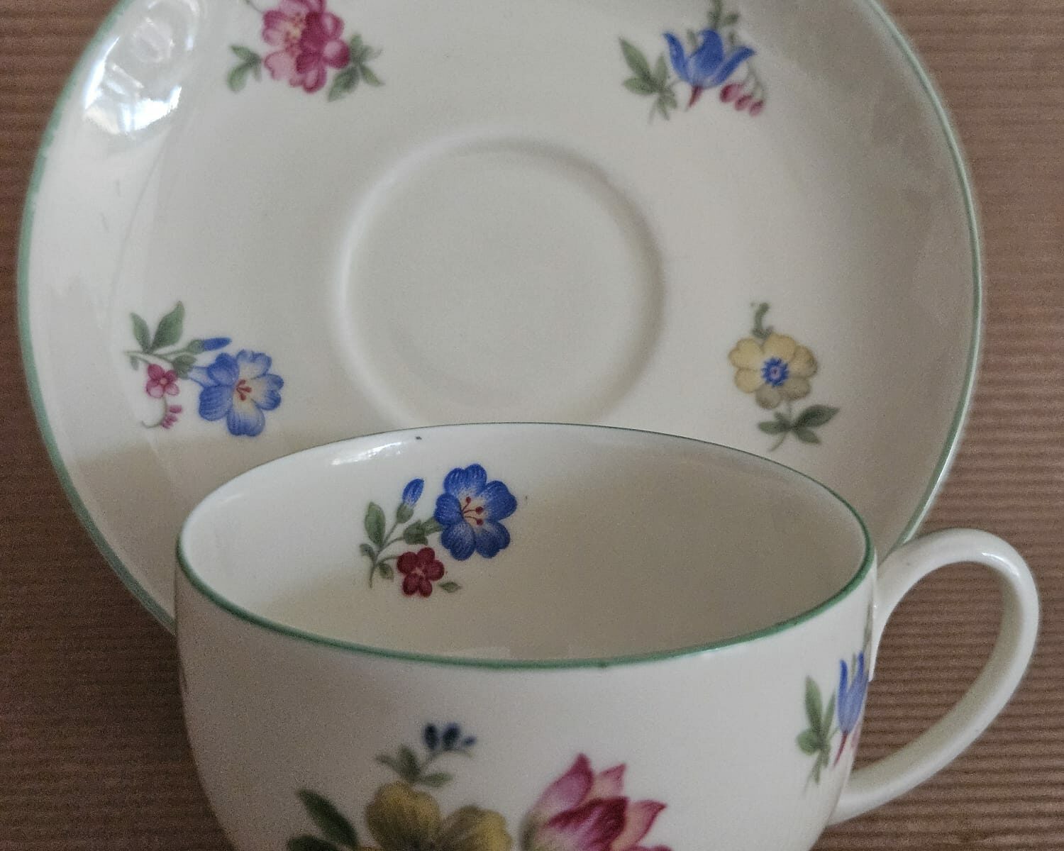 Cremefarbenes Elfenbeinporzellan „Ivory“, dezent mit Blumen im Decal-Verfahren verziert und mit einem grünen Streifen an den Rändern der Tasse, des Henkels und der Untertasse akzentuiert.