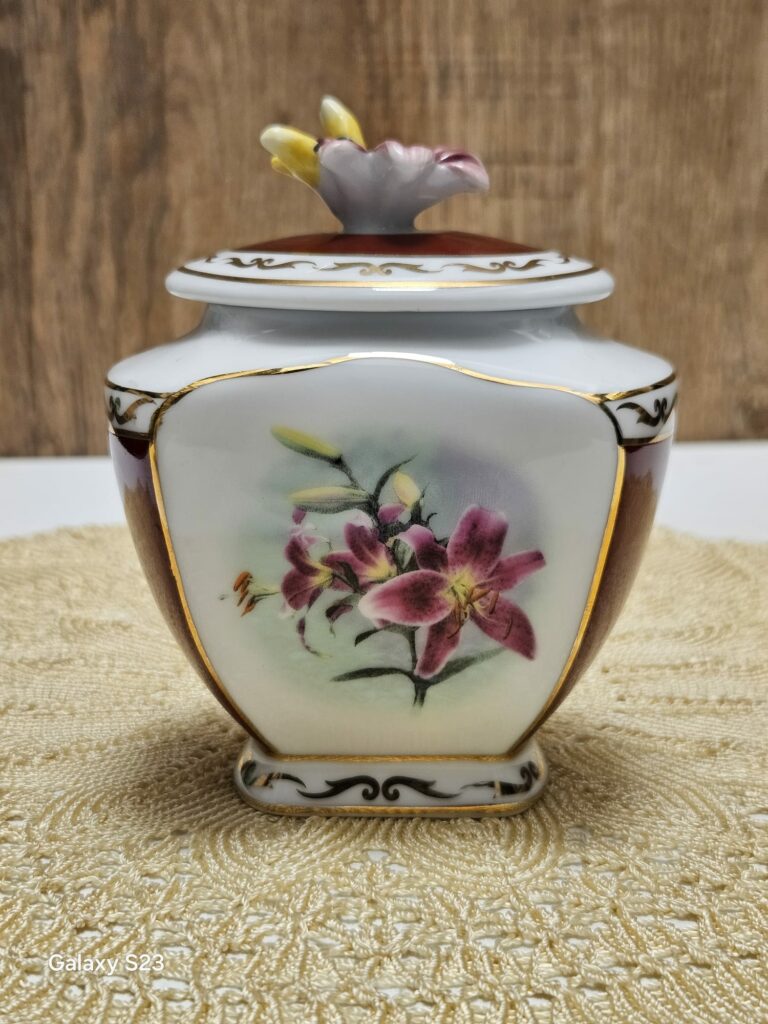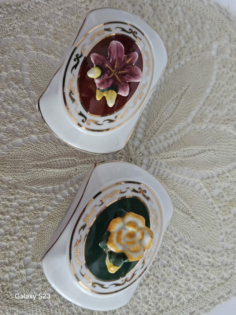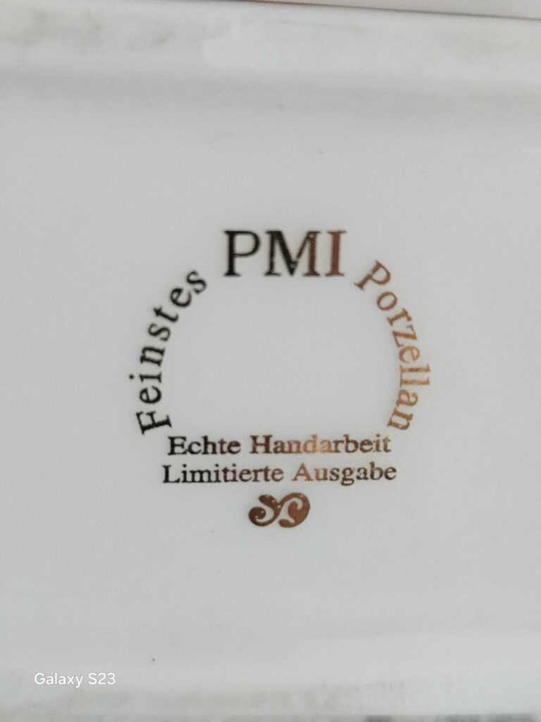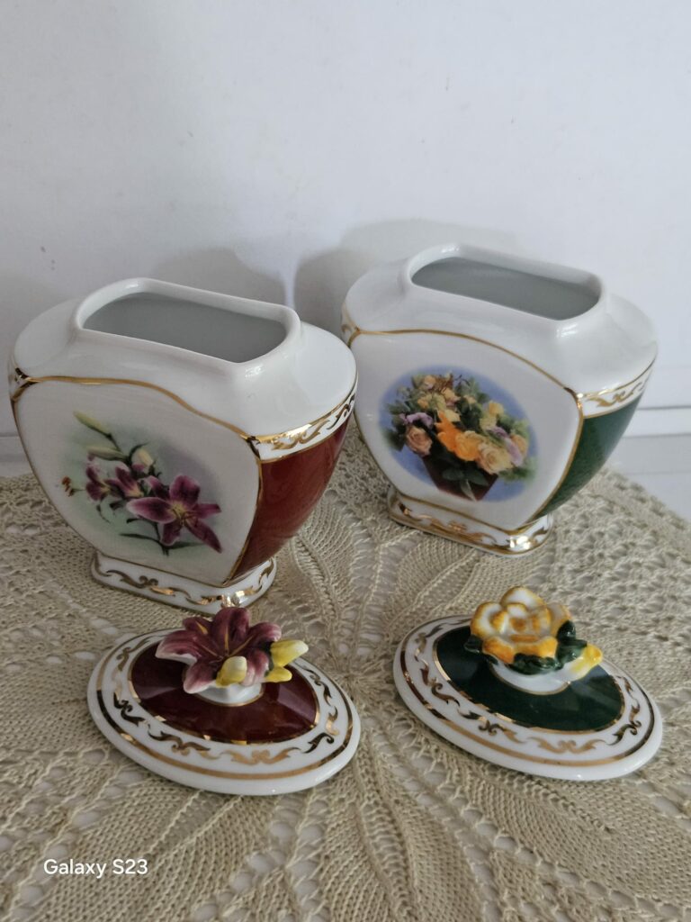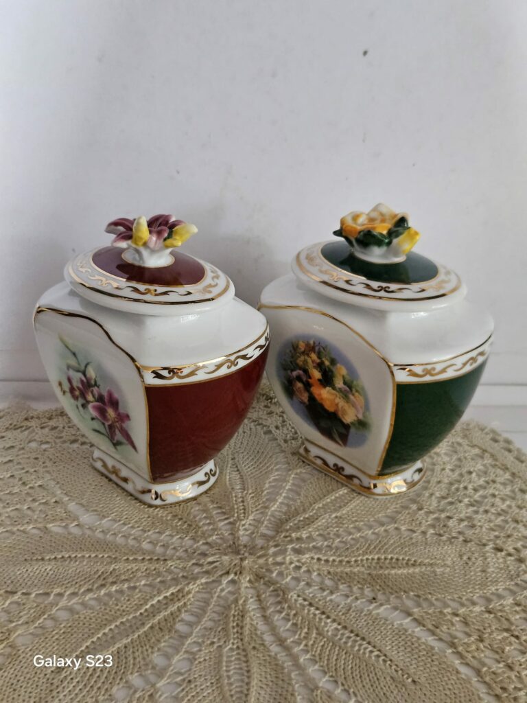 Tschechisches Kaffeeservice Epig D.F mit Signatur aus dem Jahr 1946. Es besteht aus einer Kanne, einer Zuckerdose, einem Milchkännchen, Tassen und Untertassen. Weißes Porzellan, akzentuiert mit einem goldenen Streifen. Teilweise geriffelt, dezentes Dekor in Beige und Rosa. Maße: Kannenhöhe 15 cm, oberer Durchmesser 15 cm, Bodendurchmesser 7 cm. Spannweite von der Tülle bis zum Ohr 25 cm. Zuckerdose mit einem Durchmesser von 13,5 cm, Bodendurchmesser 5,5 cm, Höhe 7 cm. Milchkännchen mit einem Durchmesser von 8 cm, vom Ausguss bis zum Henkel 14 cm, Bodendurchmesser 4,5 cm, Höhe 11 cm. Tassendurchmesser 9,5 cm, Bodendurchmesser 4 cm, Höhe 5 cm. Teller sogenannte Untertasse mit einem Durchmesser von 15 cm, Höhe 1,5 cm. Sehr guter Zustand. Der Erwerb einzelner Sets, also Tassen und Untertassen, ist möglich, solange der Vorrat reicht. Preis 200 Zloty.